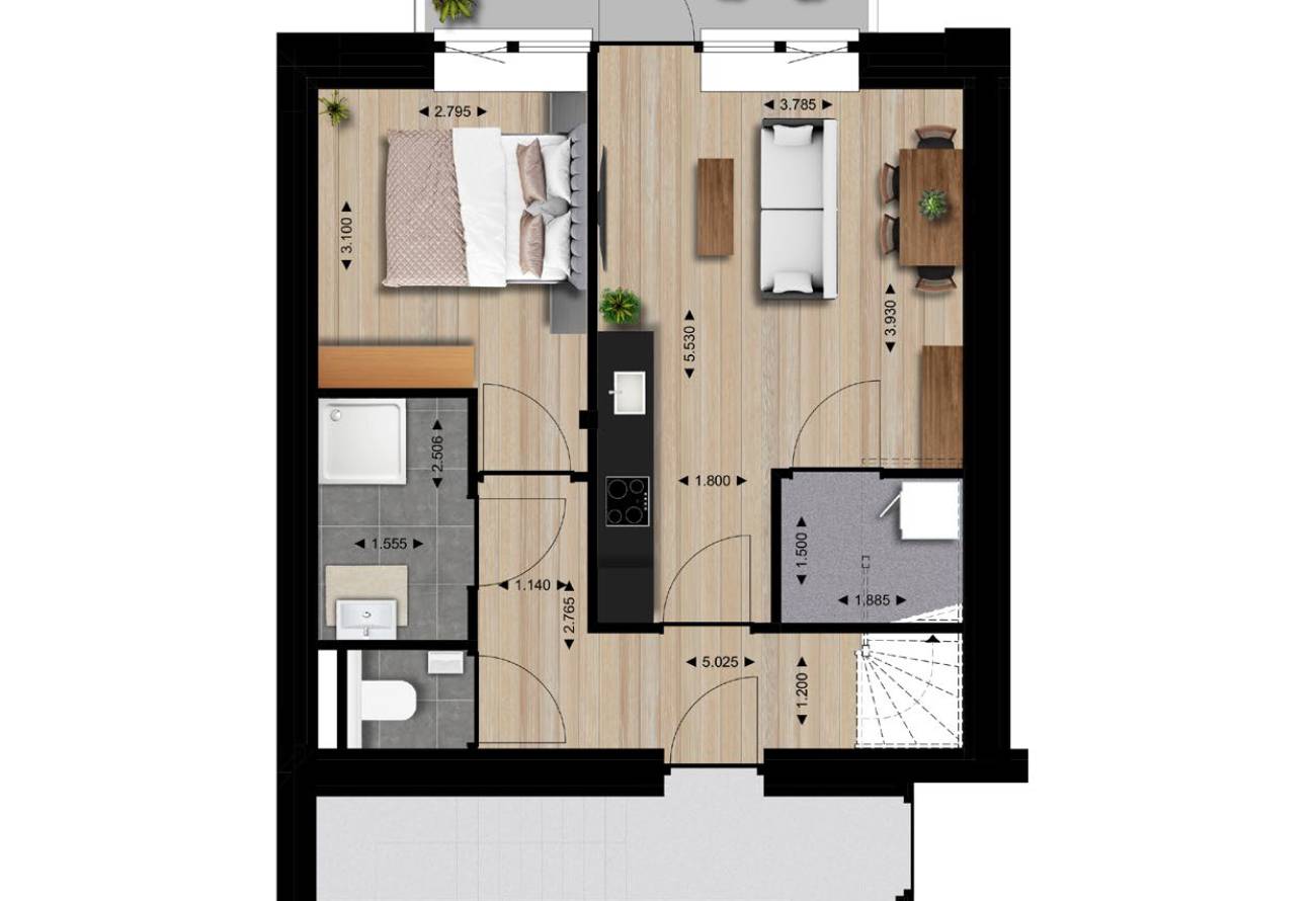 • De maisonnette appartementen zijn voorzien van een keuken inclusief inbouwapparatuur, vaatwasser, koel-vriescombinatie, combimagnetron, 5-pits inductiekookplaat en recirculatie afzuigkap. Het aanrechtblad is van composiet.