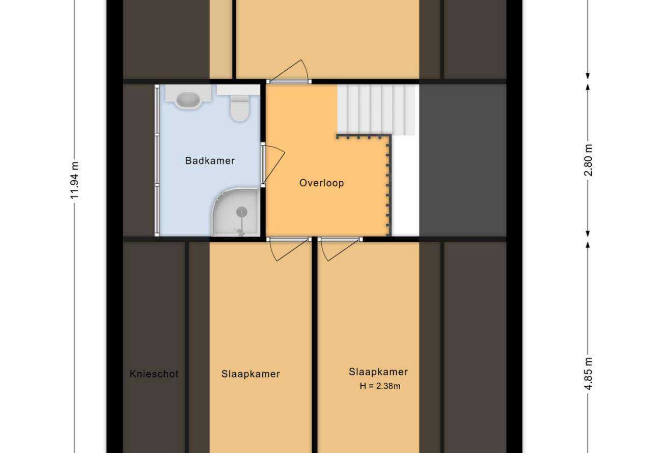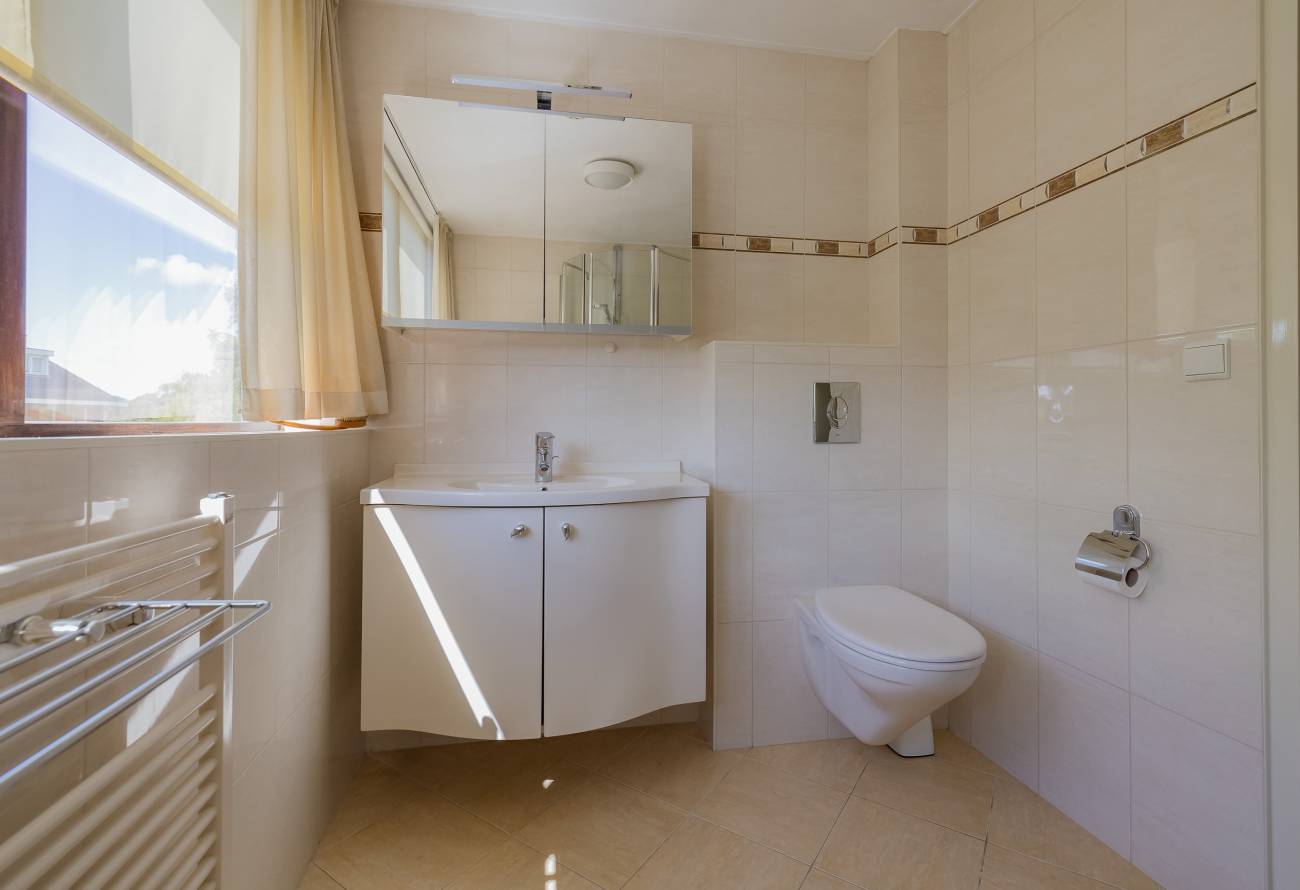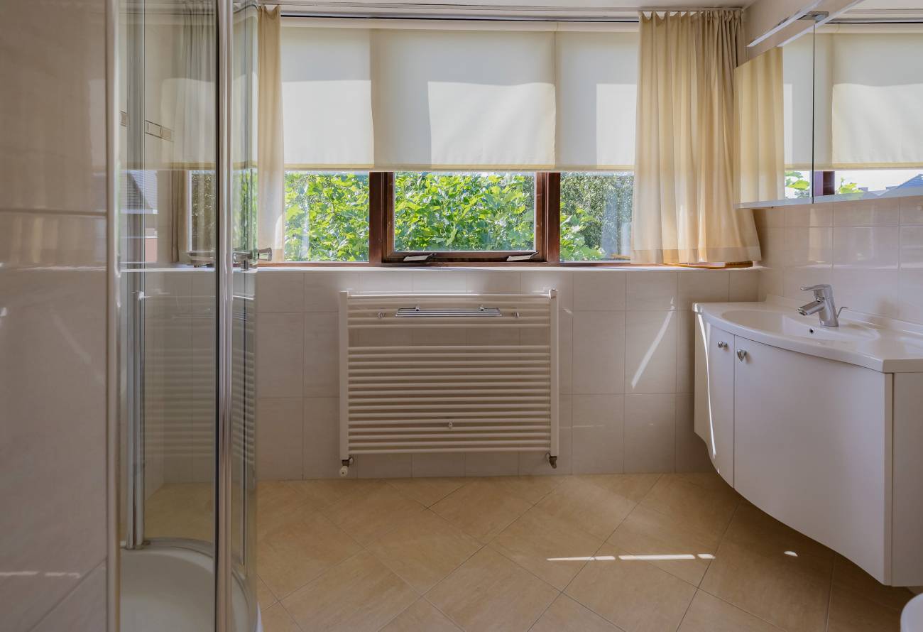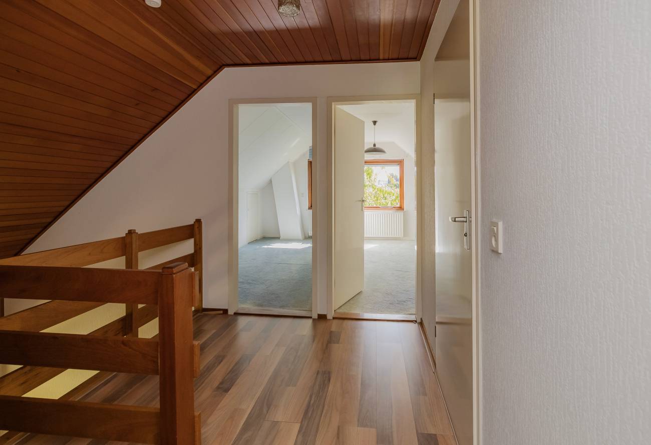 Boven vind je drie slaapkamers, waarvan één is voorzien van een dakkapel. Slimme opbergruimtes achter de knieschotten zorgen dat je alles netjes uit het zicht kunt bergen. De badkamer is royaal opgezet en compleet uitgerust met een dubbel wastafelmeubel, douchecabine en toilet.