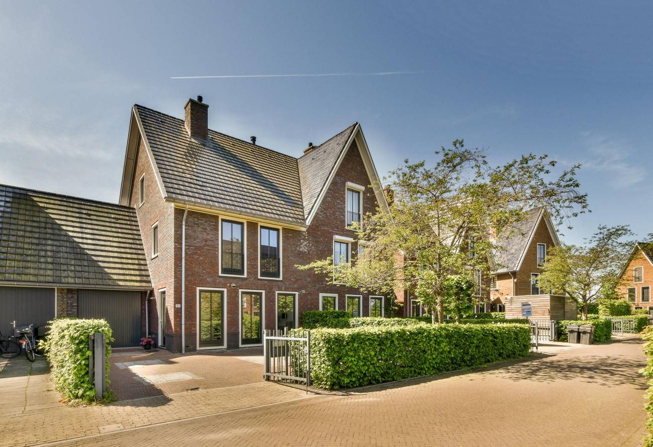 De achtergevel heeft een zonnescherm over het terras en er is genoeg ruimte voor een groot tuinset of loungehoek.
