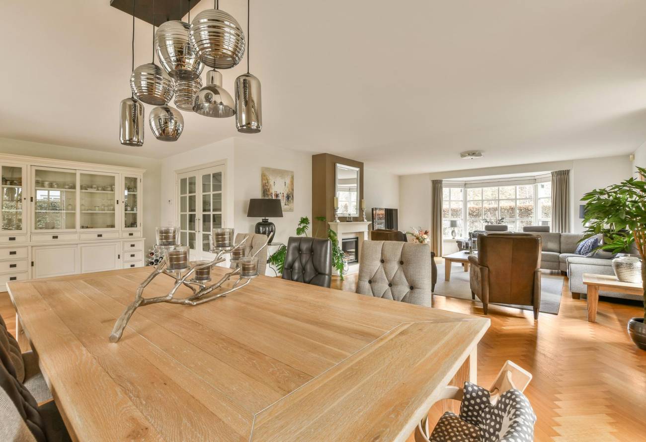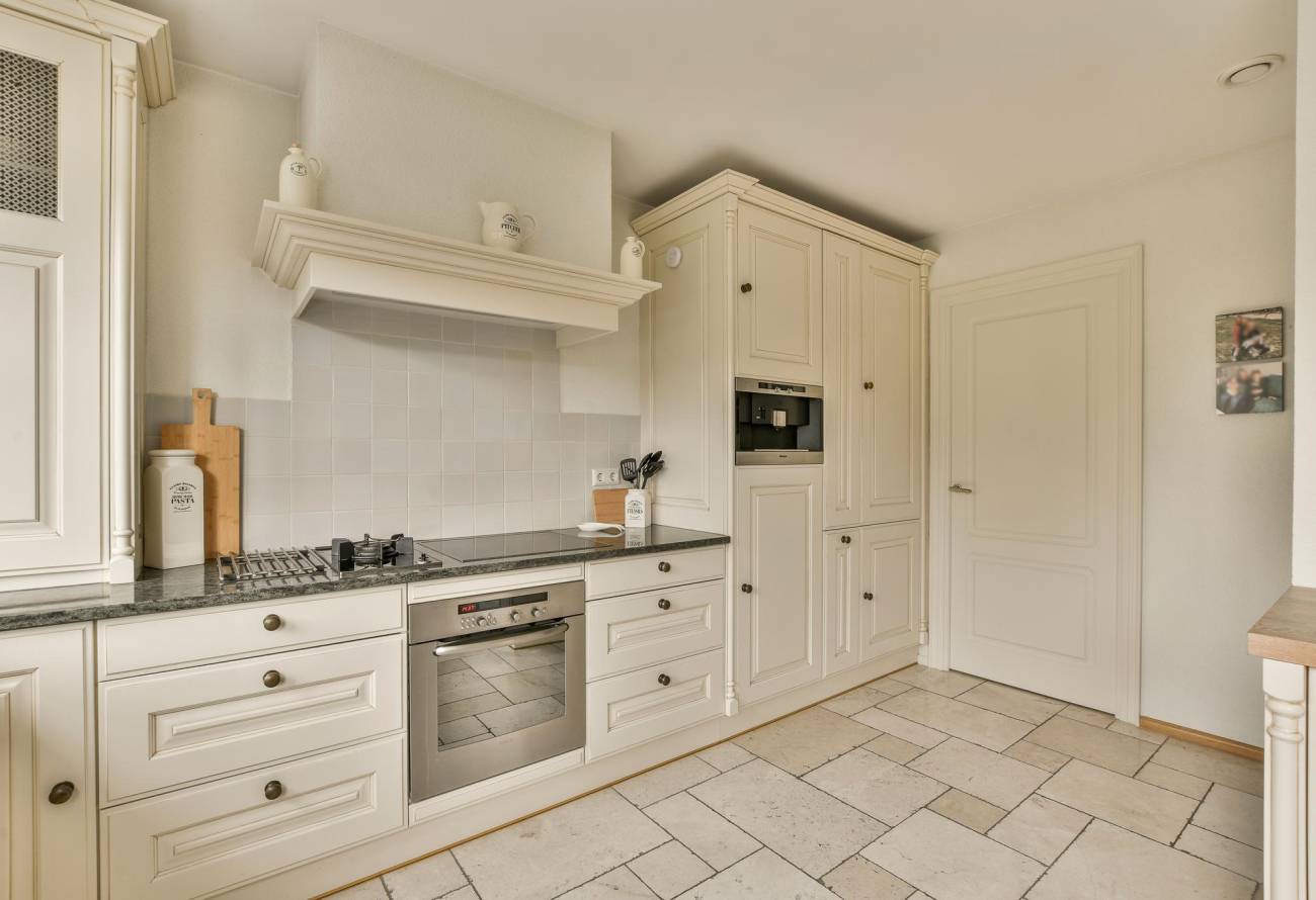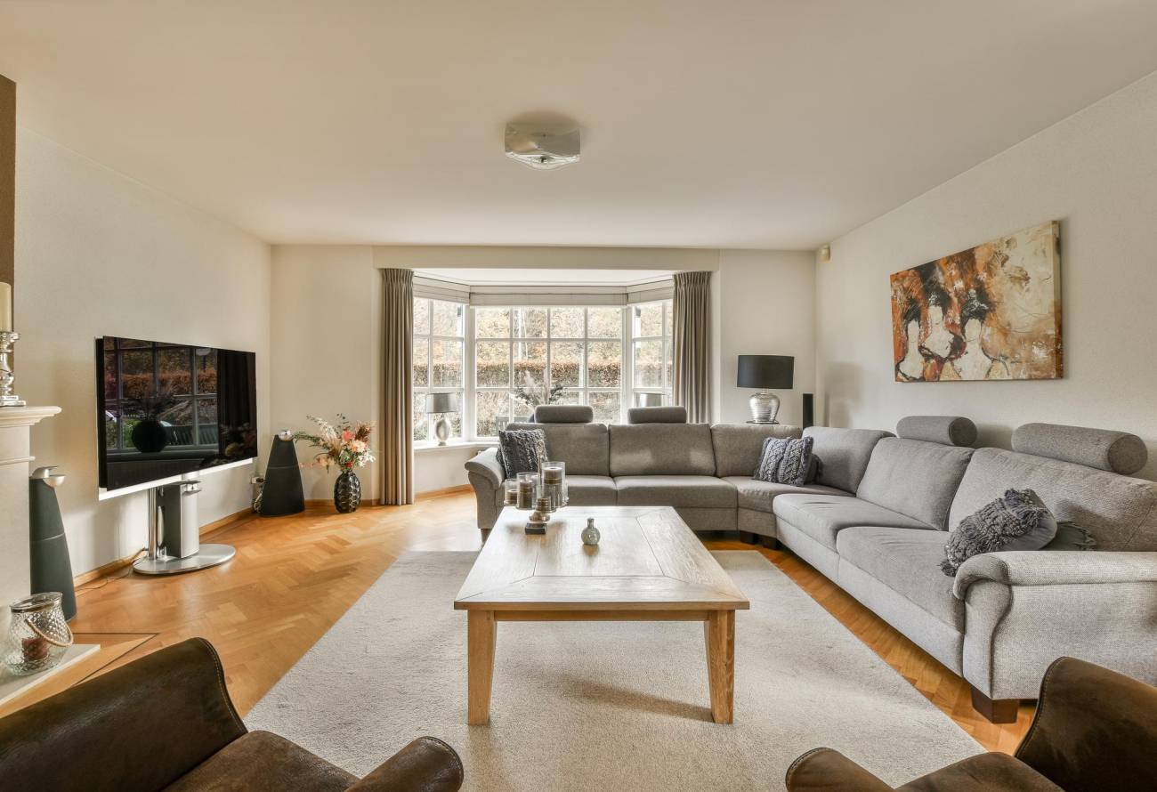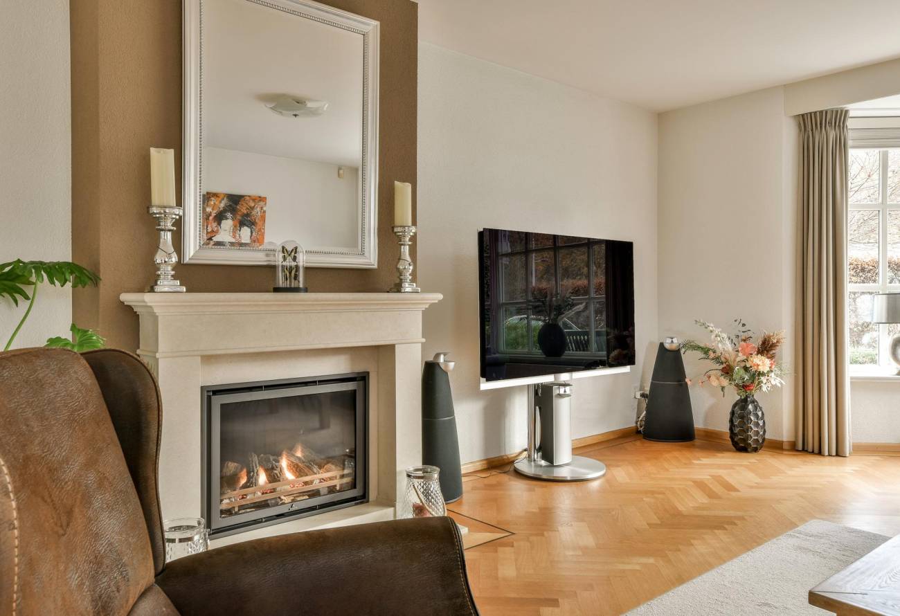 Ruime hal met luxe gastentoilet, garderobenis met meterkast en dubbele deuren naar de living. De sfeervolle living heeft een fraaie parketvloer, een gasgestookte haard en een in 2008 aangebouwde serre. De keuken is tevens in landhuisstijl en voorzien van luxe inbouwapparatuur. In de naastgelegen bijkeuken zijn de aansluitingen van de wasapparatuur en een deur naar de garage.
