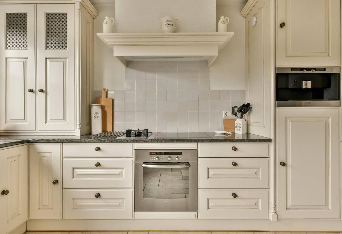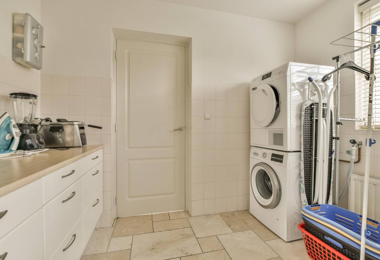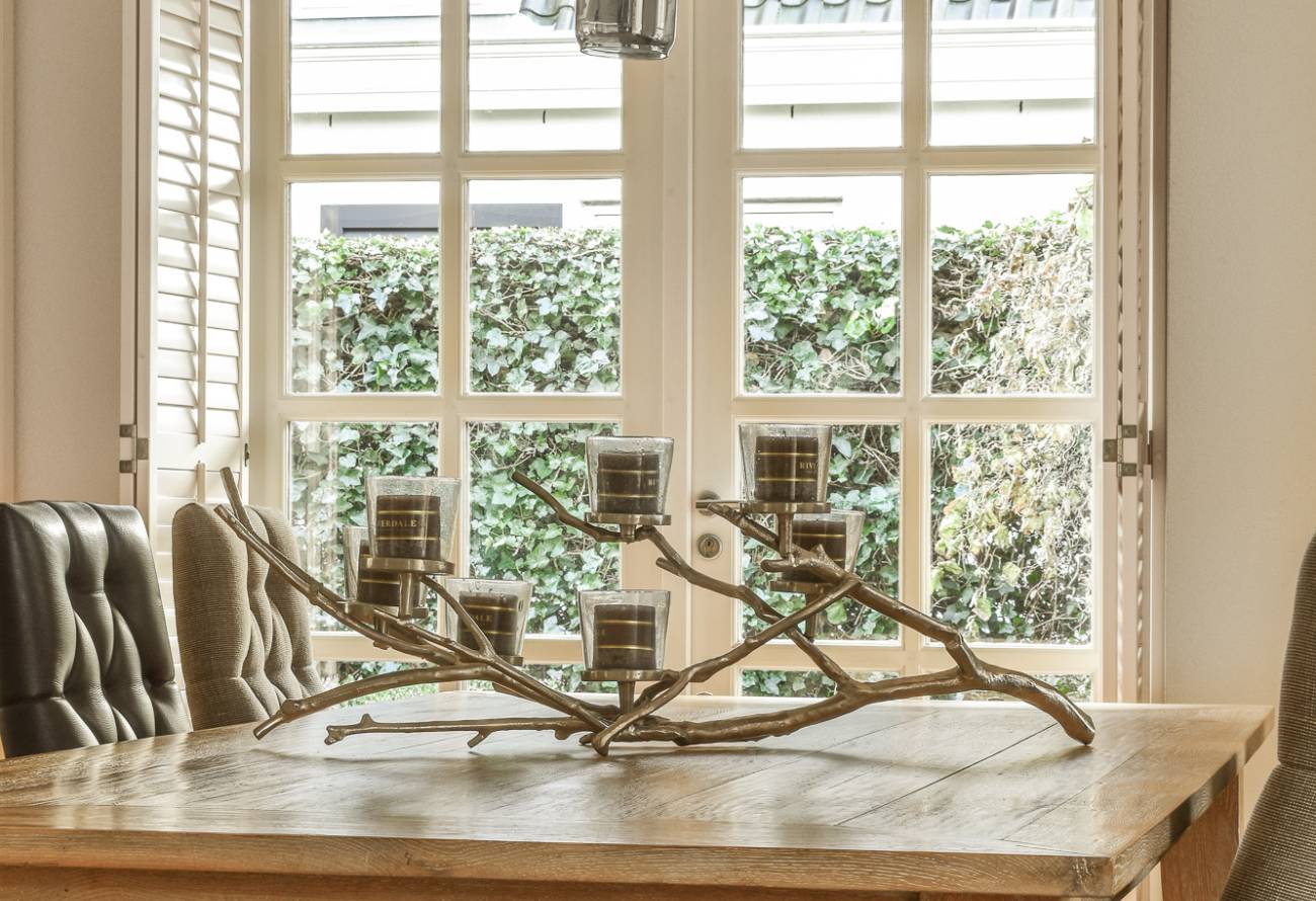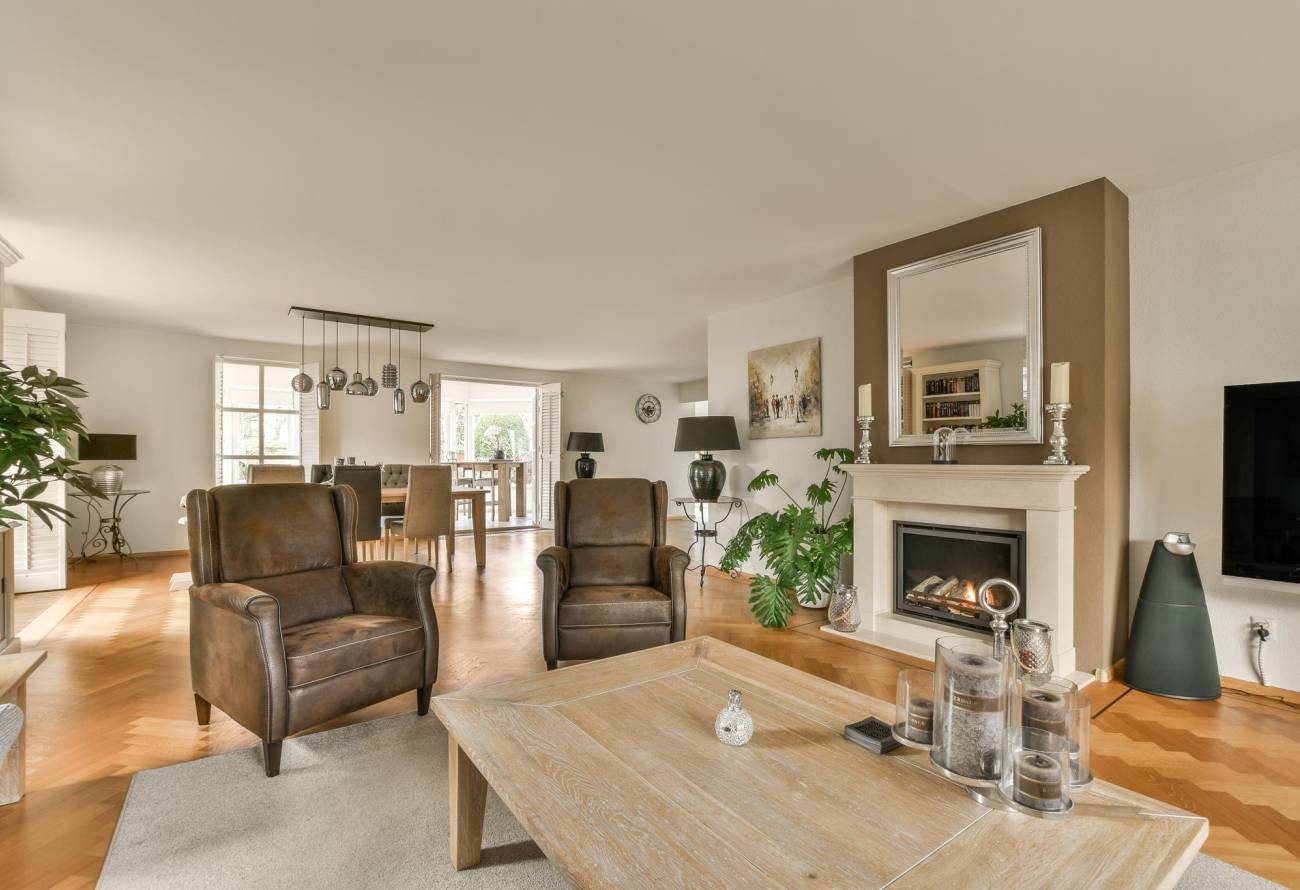 Ruime hal met luxe gastentoilet, garderobenis met meterkast en dubbele deuren naar de living. De sfeervolle living heeft een fraaie parketvloer, een gasgestookte haard en een in 2008 aangebouwde serre. De keuken is tevens in landhuisstijl en voorzien van luxe inbouwapparatuur. In de naastgelegen bijkeuken zijn de aansluitingen van de wasapparatuur en een deur naar de garage.
