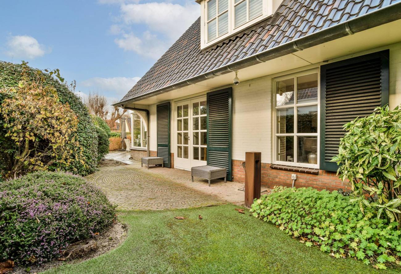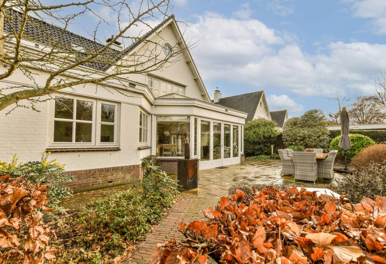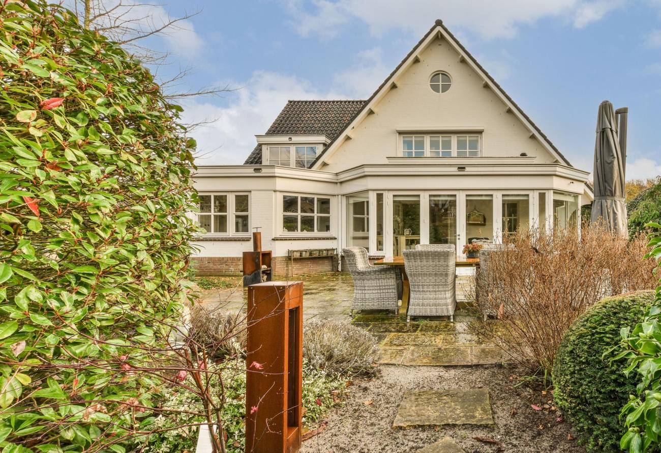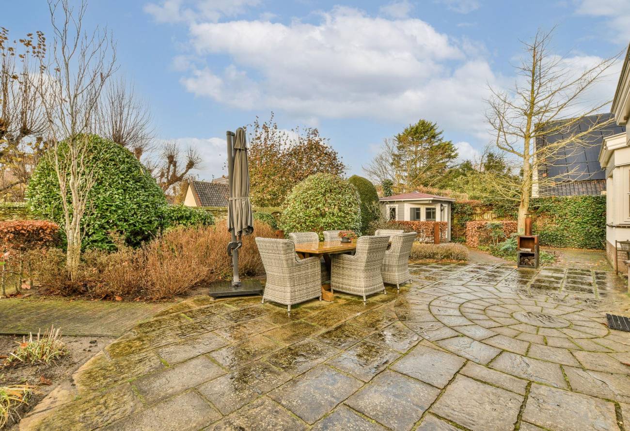De tuin rondom de woning is fraai aangelegd met diverse terrassen, plantperken, hagen en achter in de tuin staat nog een deel van de historische muur van 'Landgoed Offem'.