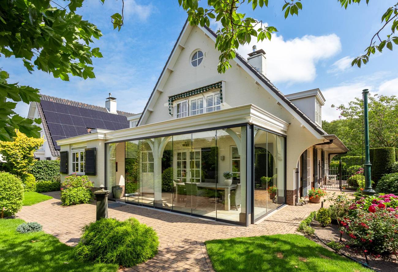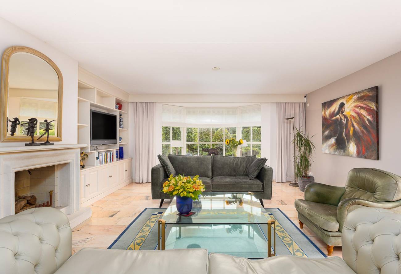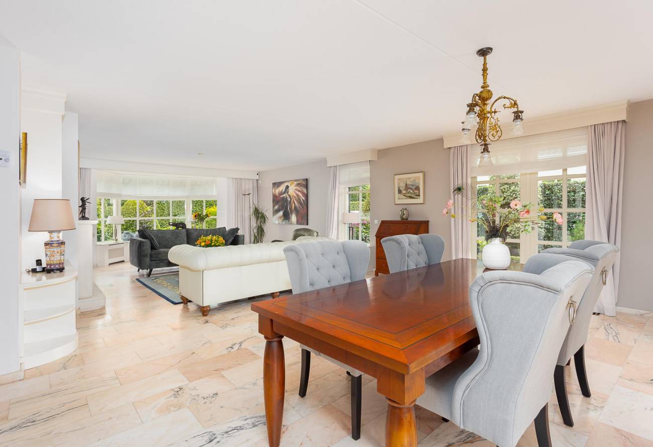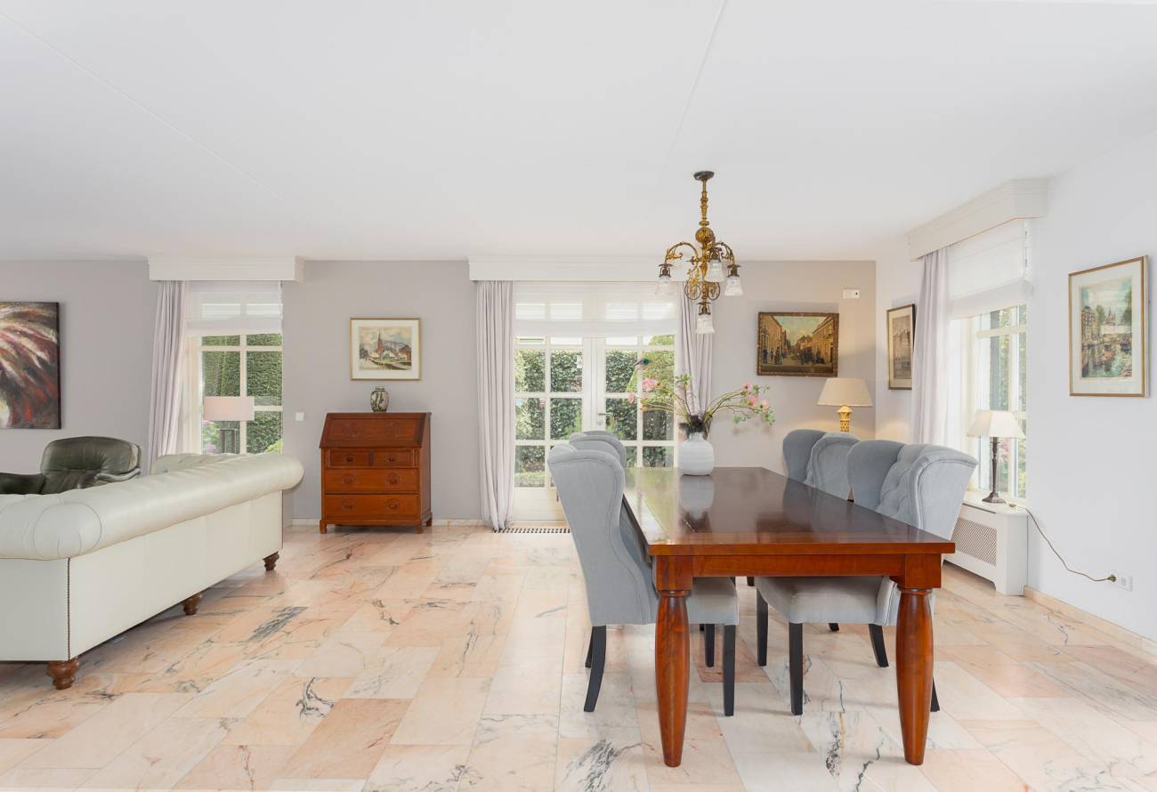 Royale living met erker en openslaande deuren naar de tuin en de veranda.