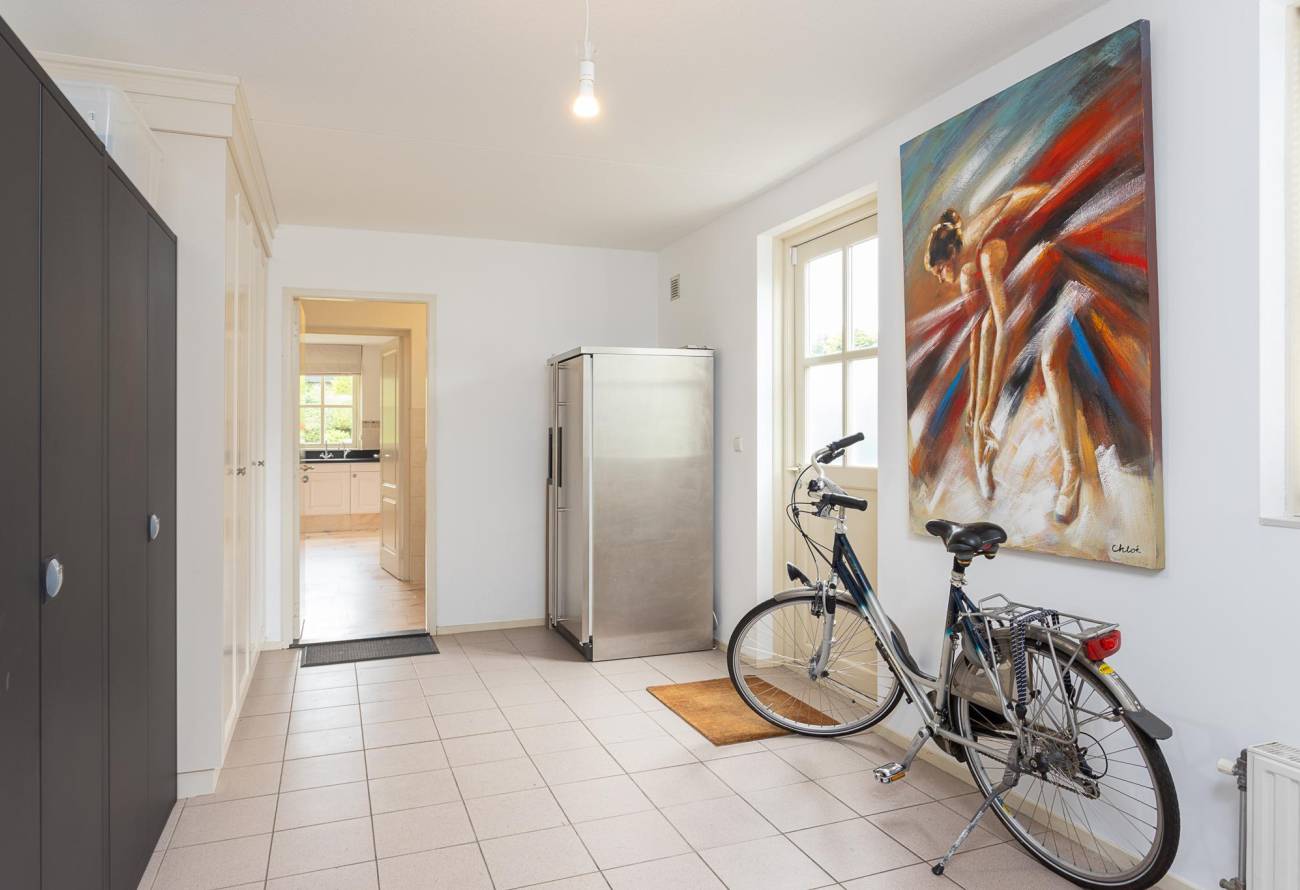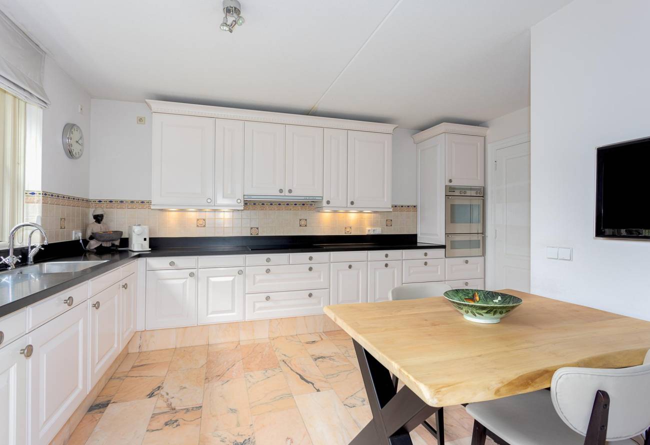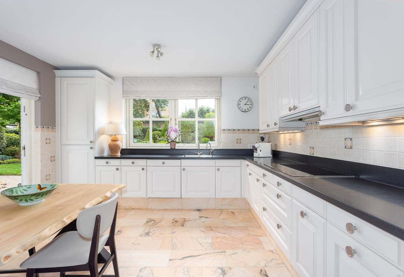 De ruime, luxe woonkeuken, ook in landhuisstijl, heeft een natuurstenen aanrechtblad en diverse inbouwapparatuur, zoals; 4-pits keramische kookplaat, afzuigkap, 2 ovens met grillfunctie, een close-in boiler, Quooker, koel/vries combinatie en een vaatwasmachine.