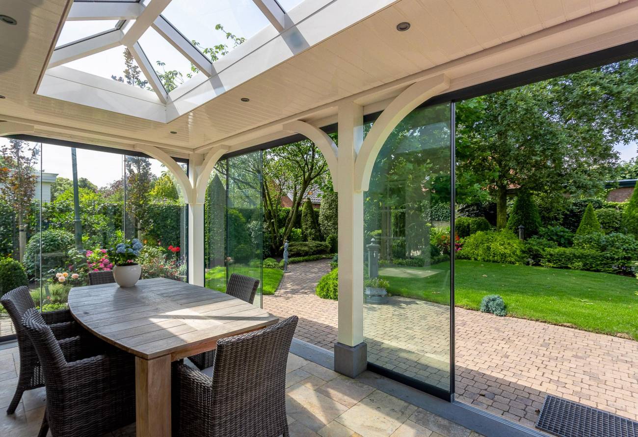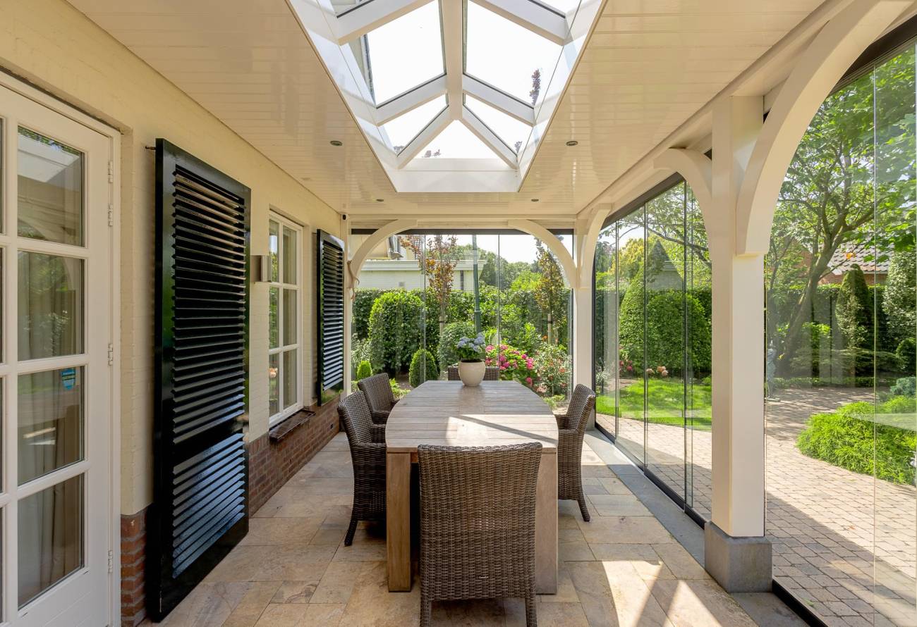 Vanuit de woonkamer en de keuken komt u in de aangebouwde luxe veranda. De veranda is in dezelfde stijl als de woning, heeft inbouwspots en een lichtstraat voor extra lichtinval.