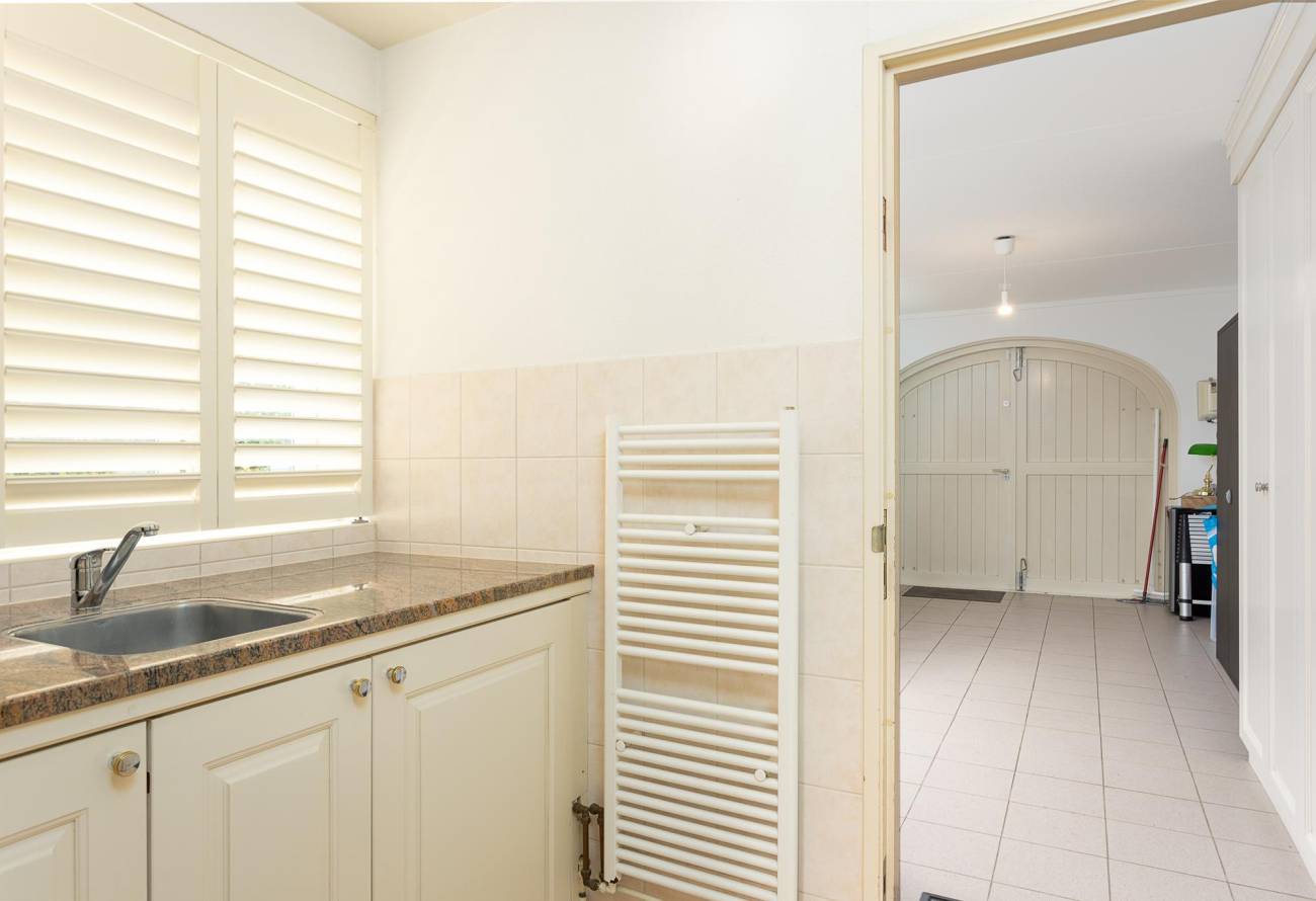 De bijkeuken heeft een keukenblok met een spoelbak, close-in boiler en er is een kastenwand.