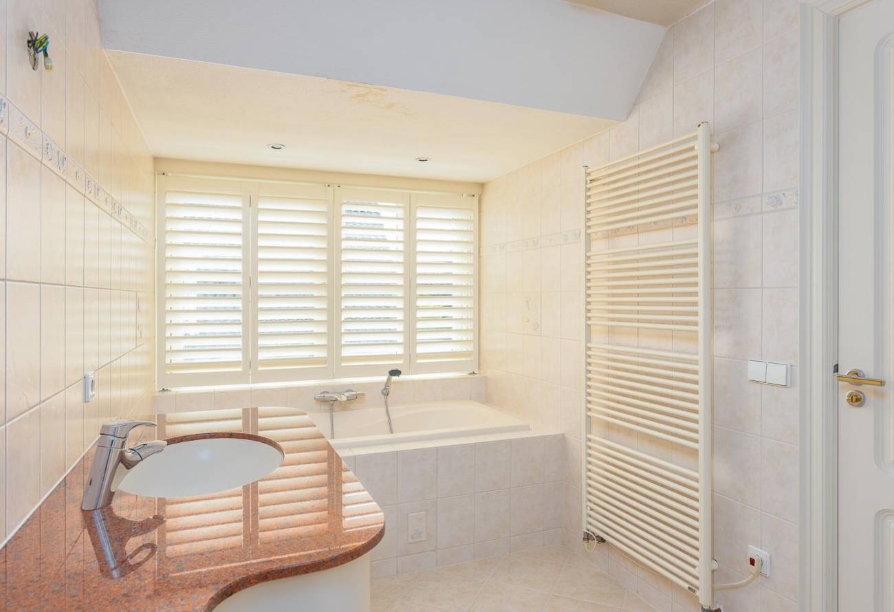 De badkamer heeft een ligbad, een inloopdouche, een wastafelmeubel met natuurstenen blad en vloerverwarming.