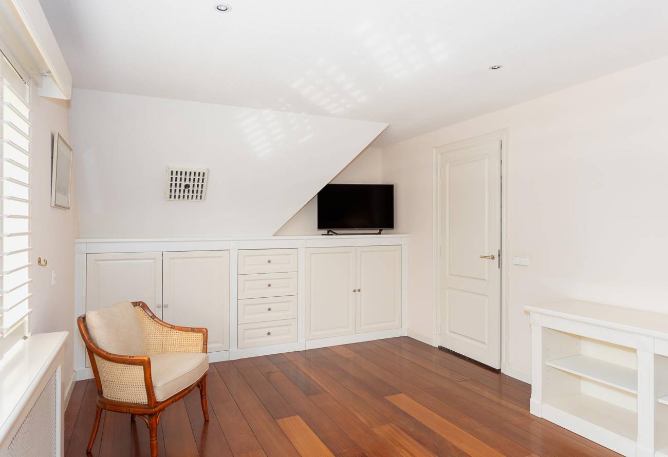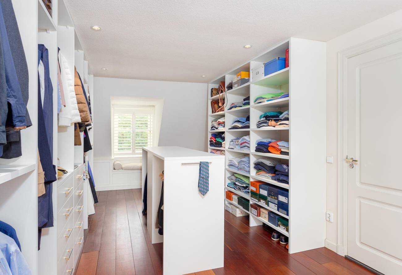 De kamer boven de garage is in gebruik als kleedkamer en heeft een zitbank in de vensterbank.