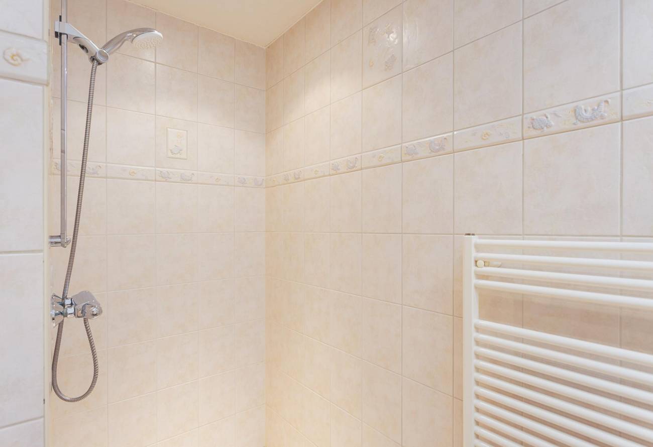 De 2e badkamer heeft een natuurstenenblad op het wastafelmeubel en ook hier is vloerverwarming.