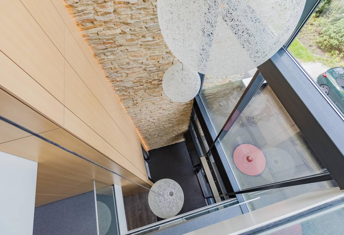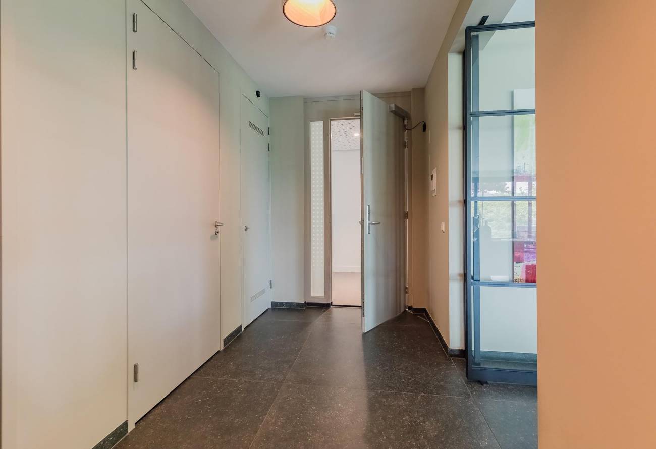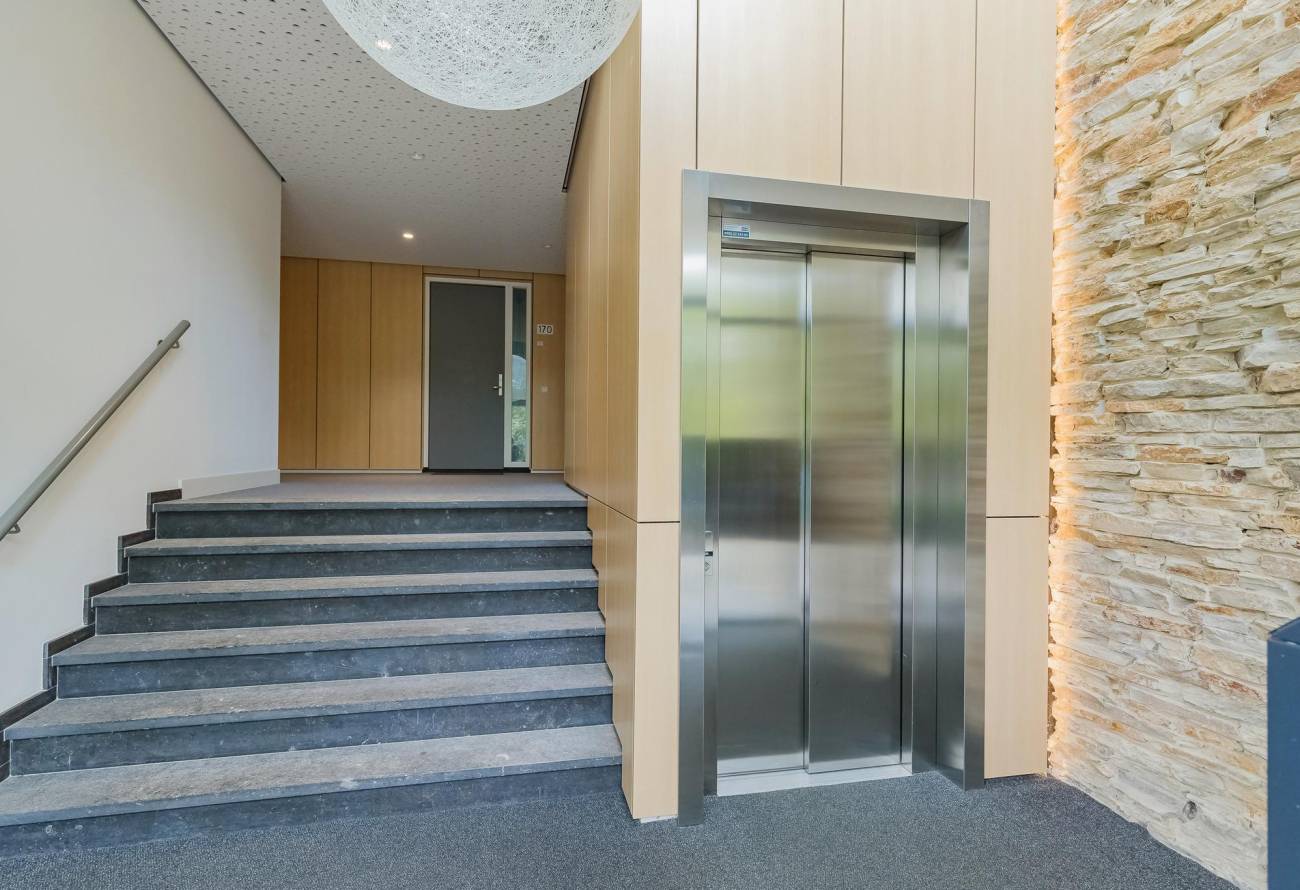 Fraai en ruim opgezette centrale entree, afgesloten door een elektrisch bedienbare toegangsdeur, met brievenbussen, intercominstallatie met video, trappenhuis en een handige liftinstallatie.