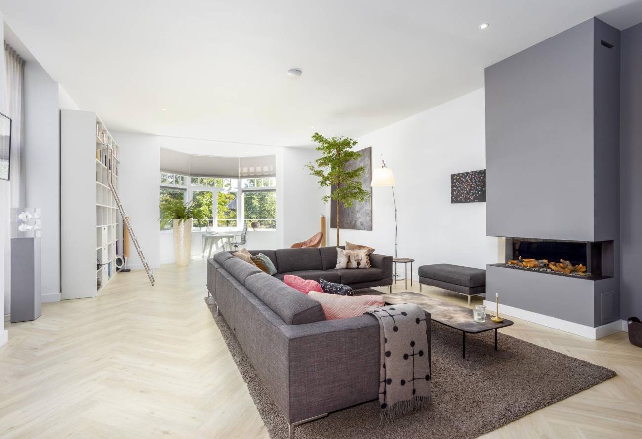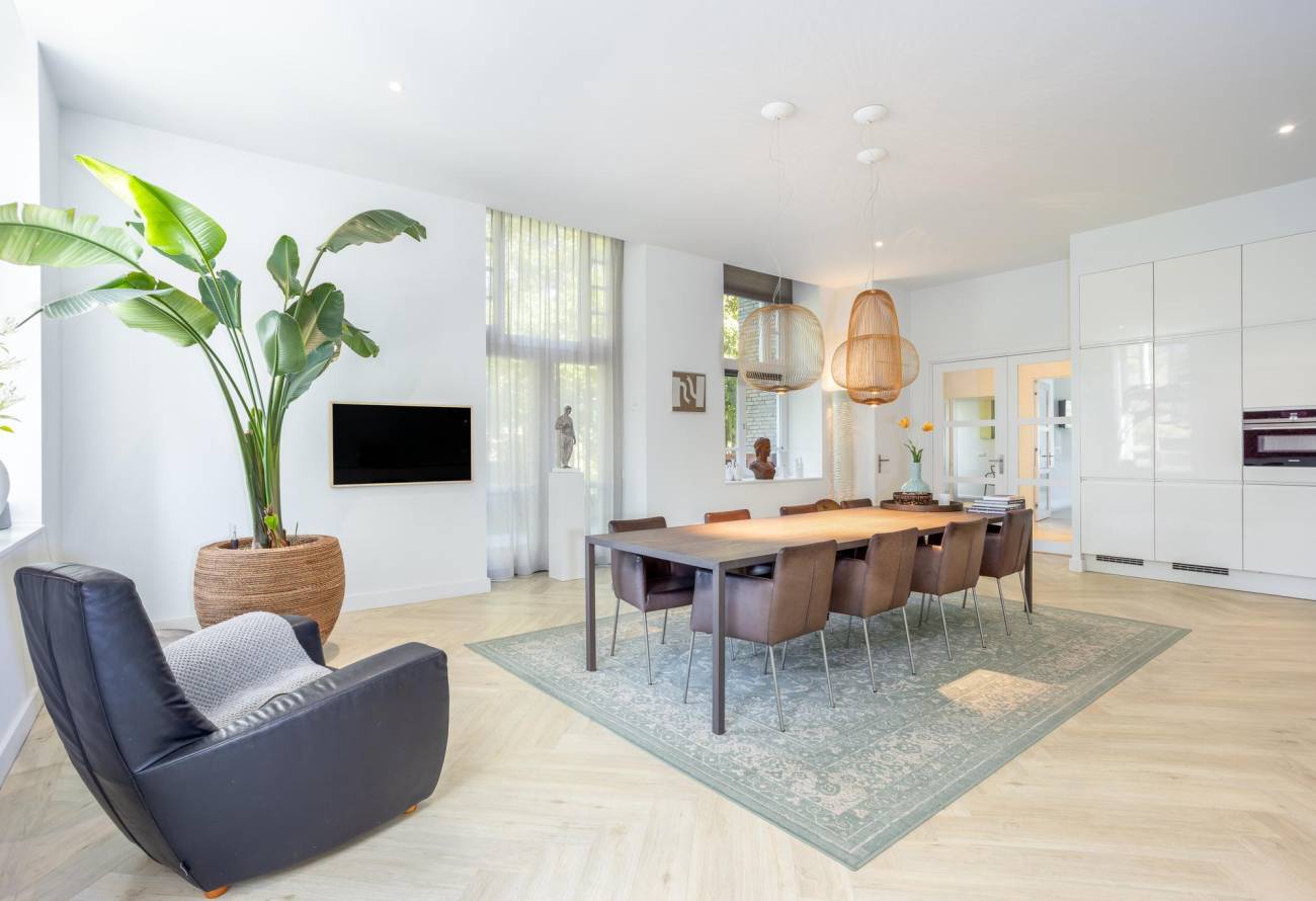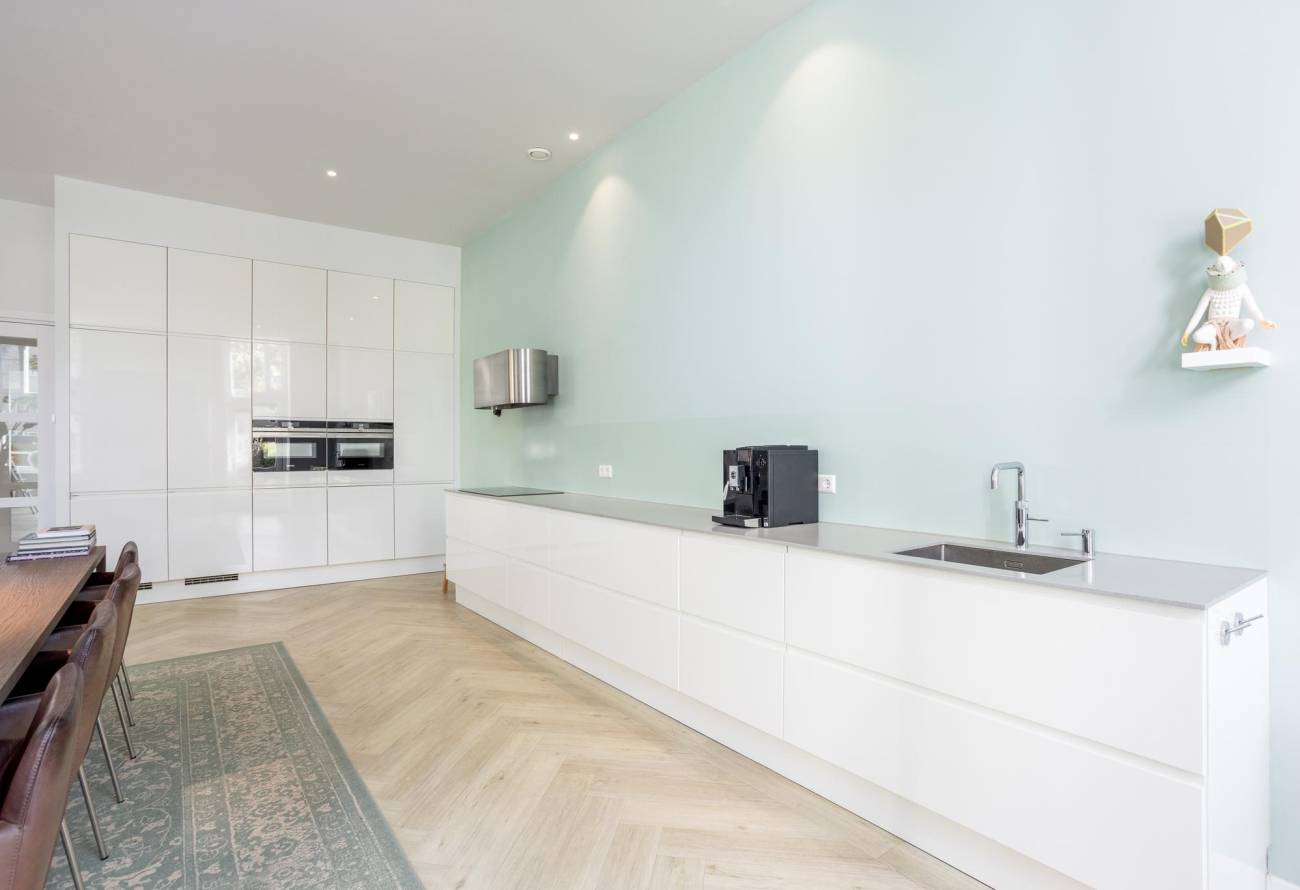 Een gashaard biedt warmte en sfeer, terwijl openslaande deuren leiden naar een sfeervol bordes. Aangrenzend trekt de eigentijdse luxe keuken uit 2019 de aandacht met zijn elegantie. De strakke moderne keuken is een droom voor elke chef-kok, compleet met een quooker, afzuigkap met plasmafilter en top-of-the-line apparatuur.