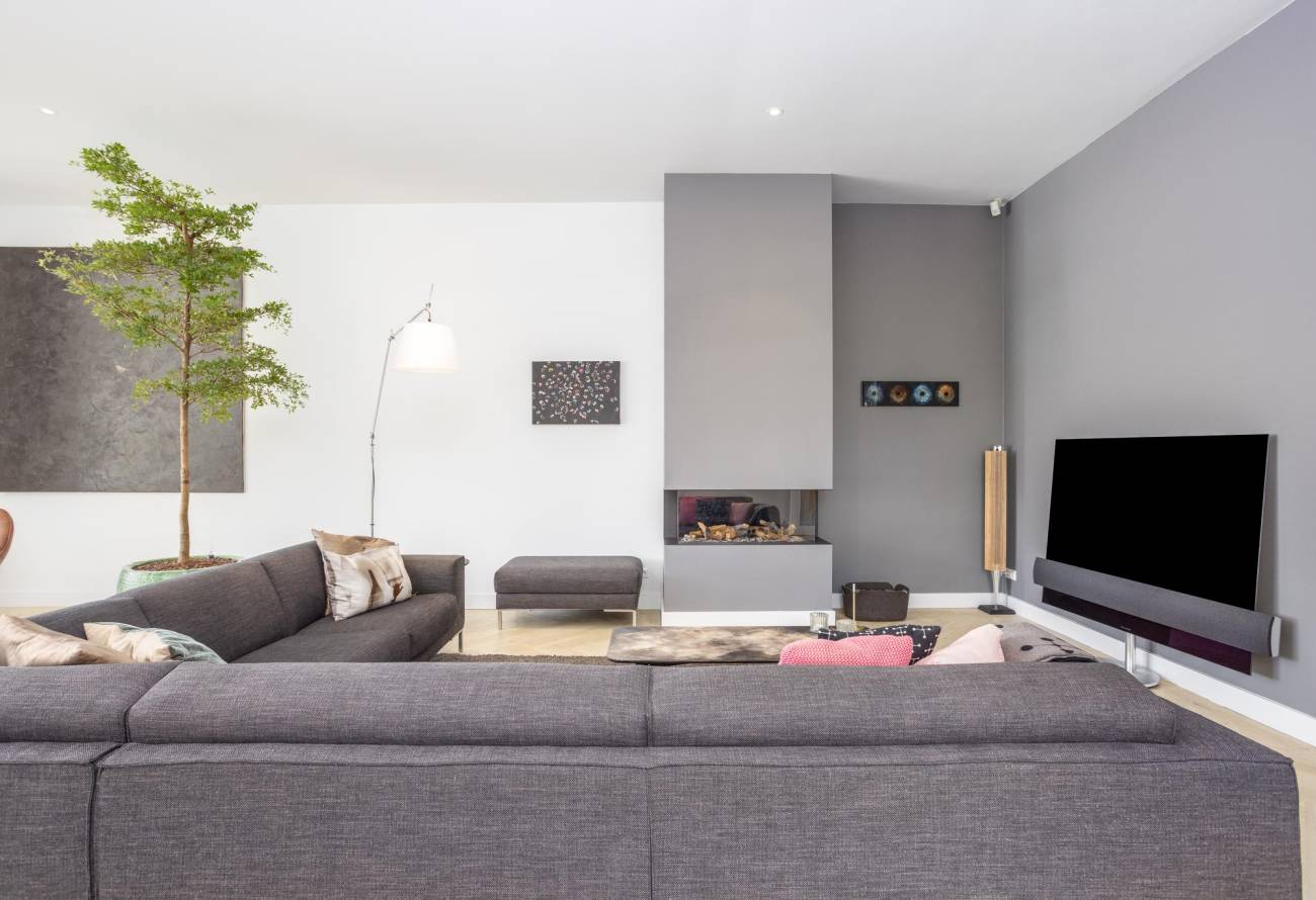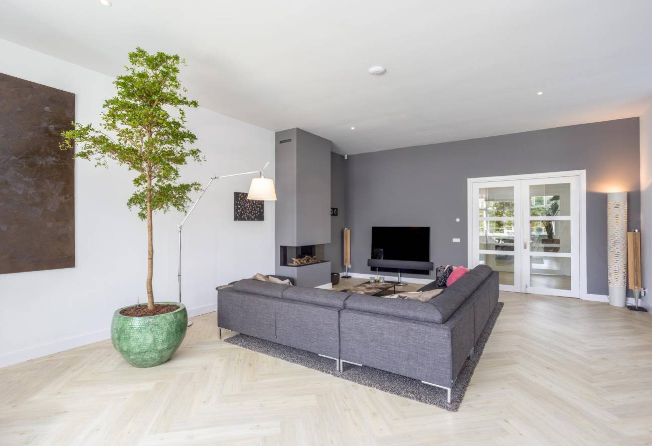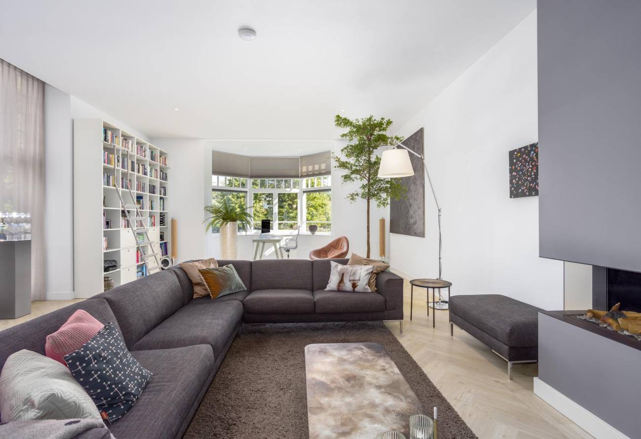 Een gashaard biedt warmte en sfeer, terwijl openslaande deuren leiden naar een sfeervol bordes. Aangrenzend trekt de eigentijdse luxe keuken uit 2019 de aandacht met zijn elegantie. De strakke moderne keuken is een droom voor elke chef-kok, compleet met een quooker, afzuigkap met plasmafilter en top-of-the-line apparatuur.