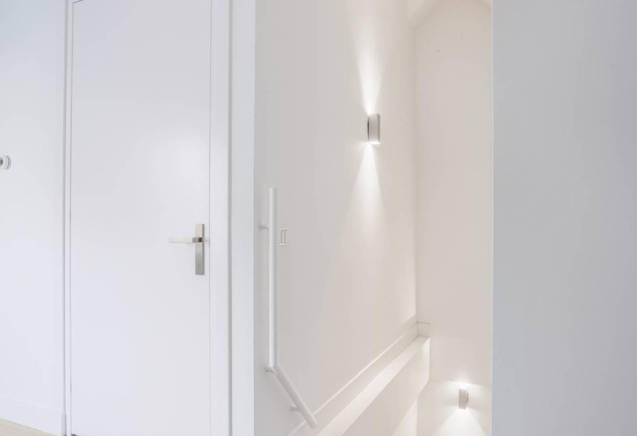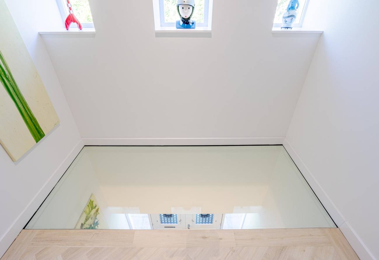 Een opvallend element in de overloop is de glazen vloer die een inkijk biedt naar de entreehal eronder. Dit architecturale pronkstuk, samen met vloerverwarming, uitstekende isolatie en een geavanceerde thermostaat met analoge en digitale zoneregeling, bevordert opmerkelijke energiezuinigheid doorheen de hele royale woning. De omhelzing van vloerverwarming strekt zich uit over deze verdieping, evenals over het hele huis. Centraal op de overloop is een opbergkast, ideaal voor de handdoeken en beddengoed.