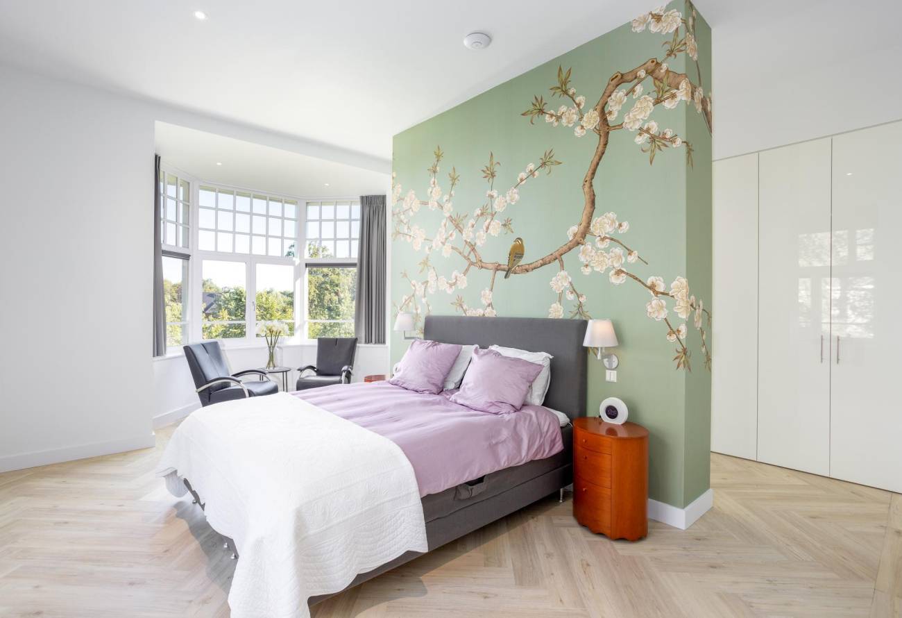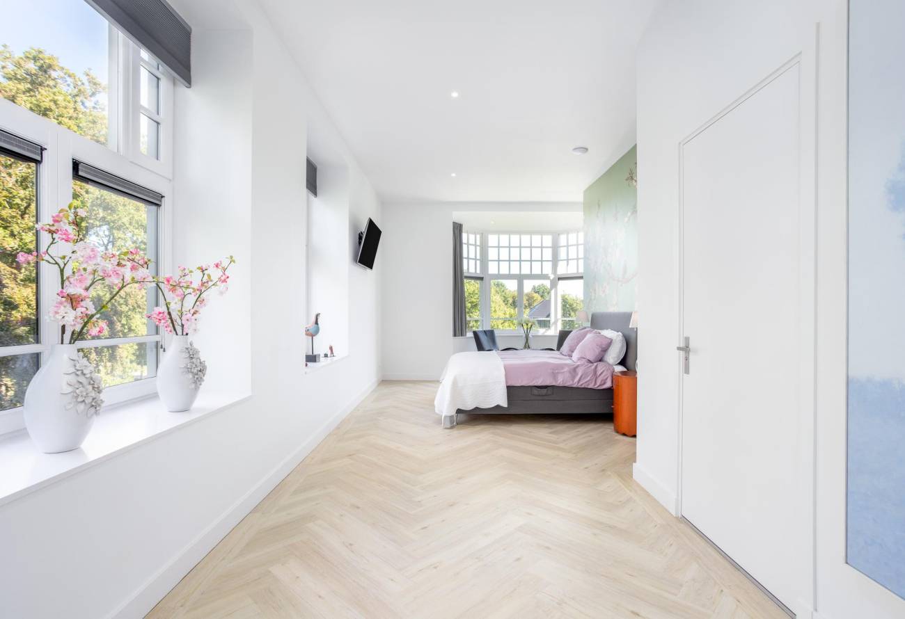 De trap leidend naar de 1e etage ontsluit een ruime overloop die toegang biedt tot twee weelderige slaapkamers. De ouderslaapkamer, gelegen aan de voorzijde van de woning, beschikt over een eigen badkamer met Sunbeam, een inloopkast en een prachtige erker. Ochtendstralen dringen door de omringende bomen en verlenen de ruimte natuurlijke luister. Aan de achterzijde wacht een riante slaapkamer. De moderne badkamers op deze verdieping zijn voorzien van een heldere gietvloeren, toiletten, ingebouwde kranen, een inloopdouche met glazen scheidingswand en twee design wastafels met onderbouw. De 2e badkamer grenzend aan de achter slaapkamer is tevens voorzien van een design ligbad.