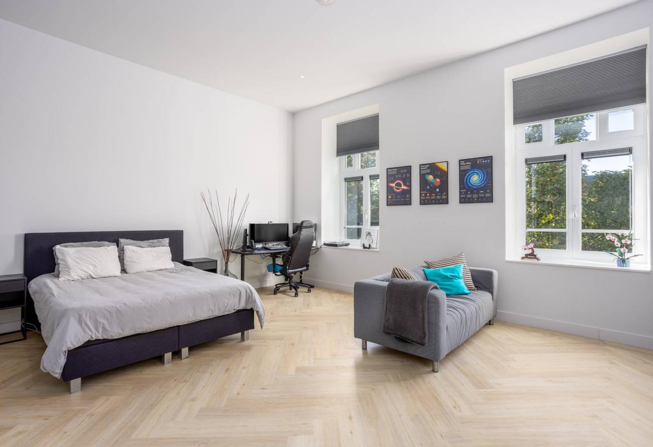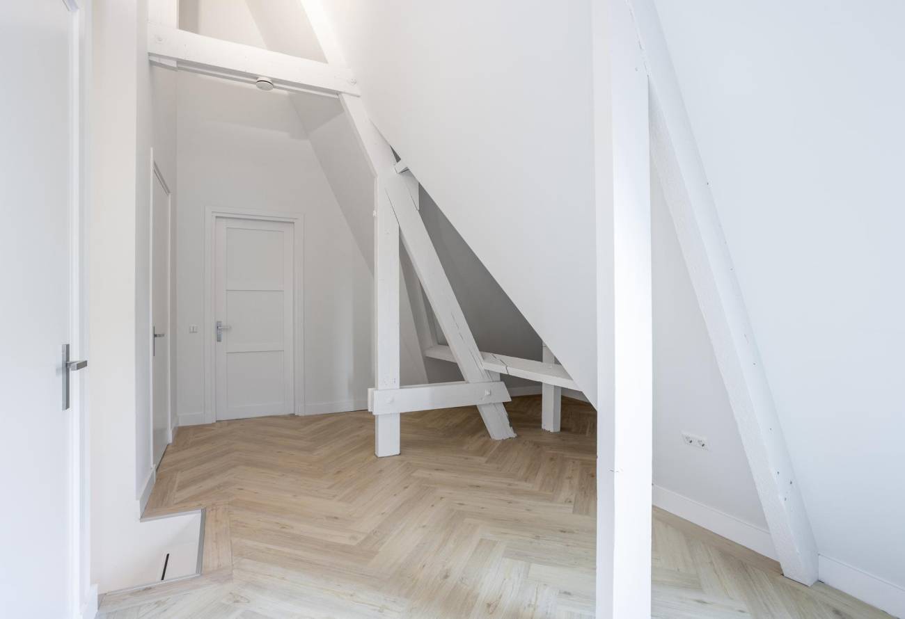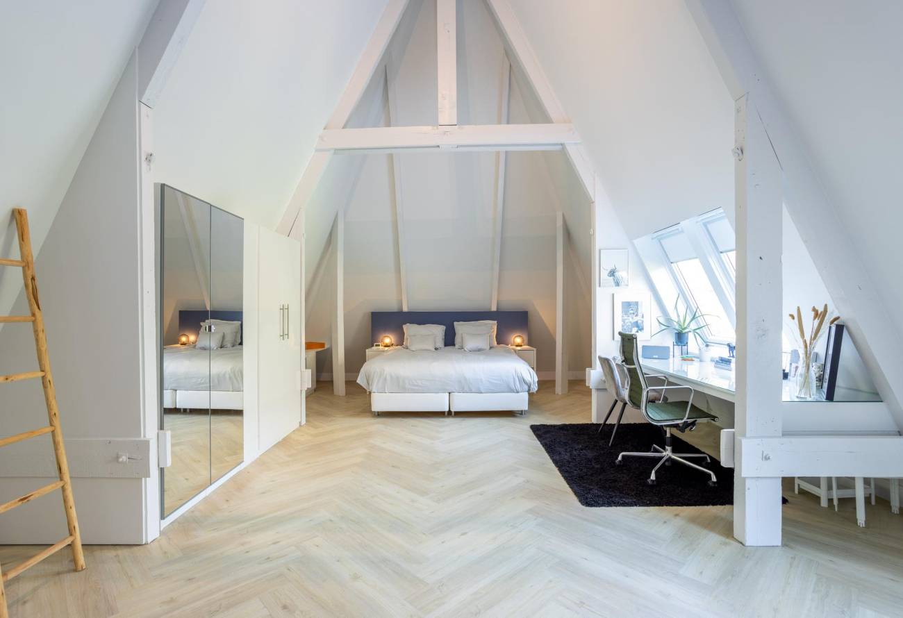 De gehele uitgestrektheid van de 2e etage wordt gesierd door authentiek zichtbare houten balken die sierlijk reiken tot aan het indrukwekkende zeven meter hoge hoogste punt. Deze rustieke balken voegen een tijdloze charme toe, typerend voor de bouwstijl van het pand. Deze etage omvat een betoverende hal met historische details en biedt ook onderdak aan 2 ruime slaapkamers, verlicht door meerdere Velux dakramen. Daarnaast bevindt zich op deze verdieping een 3e badkamer, die de gestroomlijnde esthetiek van zijn voorganger weerspiegelt. Compleet met een stralende gietvloer, een inloopdouche, een design wastafelmeubel, inbouwkranen en een toilet.