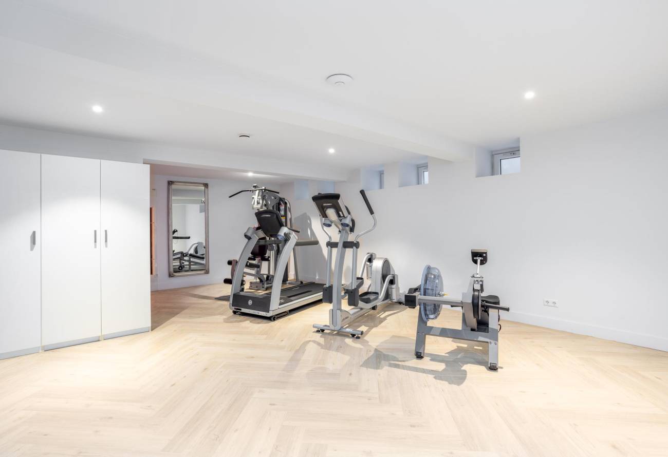 Een stevige trap leidt naar het souterrain, waar dezelfde warme vloerverwarming en charmante visgraatvloer te vinden zijn als op alle andere verdiepingen. Deze ruimte herbergt niet alleen een garderobe voor jassen, schoenen en sportuitrusting, maar ook een plek voor ontspanning en lichaamsbeweging, evenals een veelzijdige speel-/slaapkamer. Het souterrain is voorzien van een sauna en een ruime berging. Met daglicht dat door verschillende ramen binnenstroomt, straalt het souterrain een gastvrije sfeer uit.