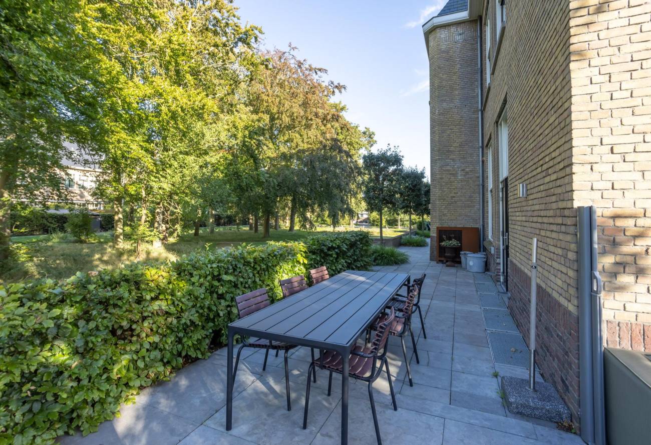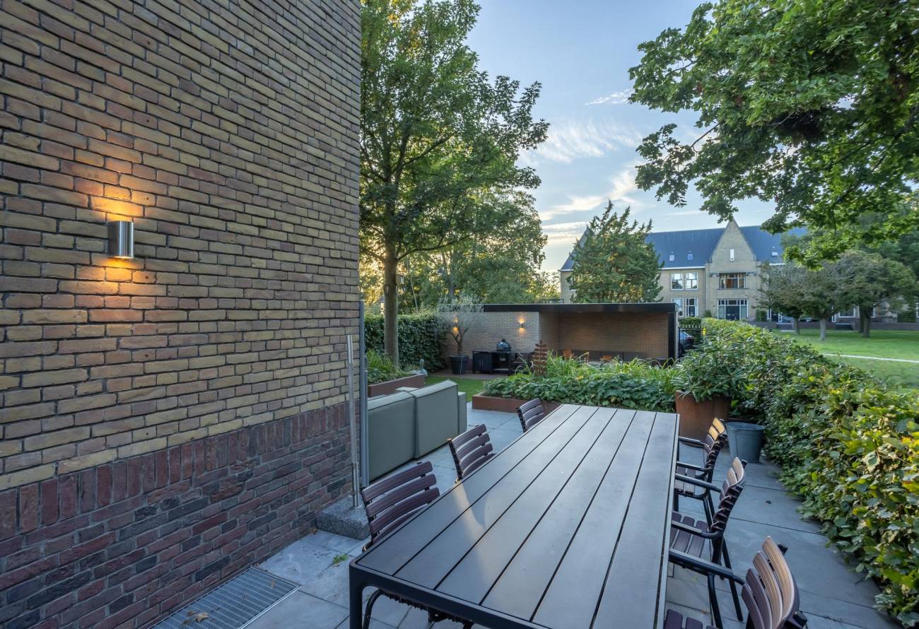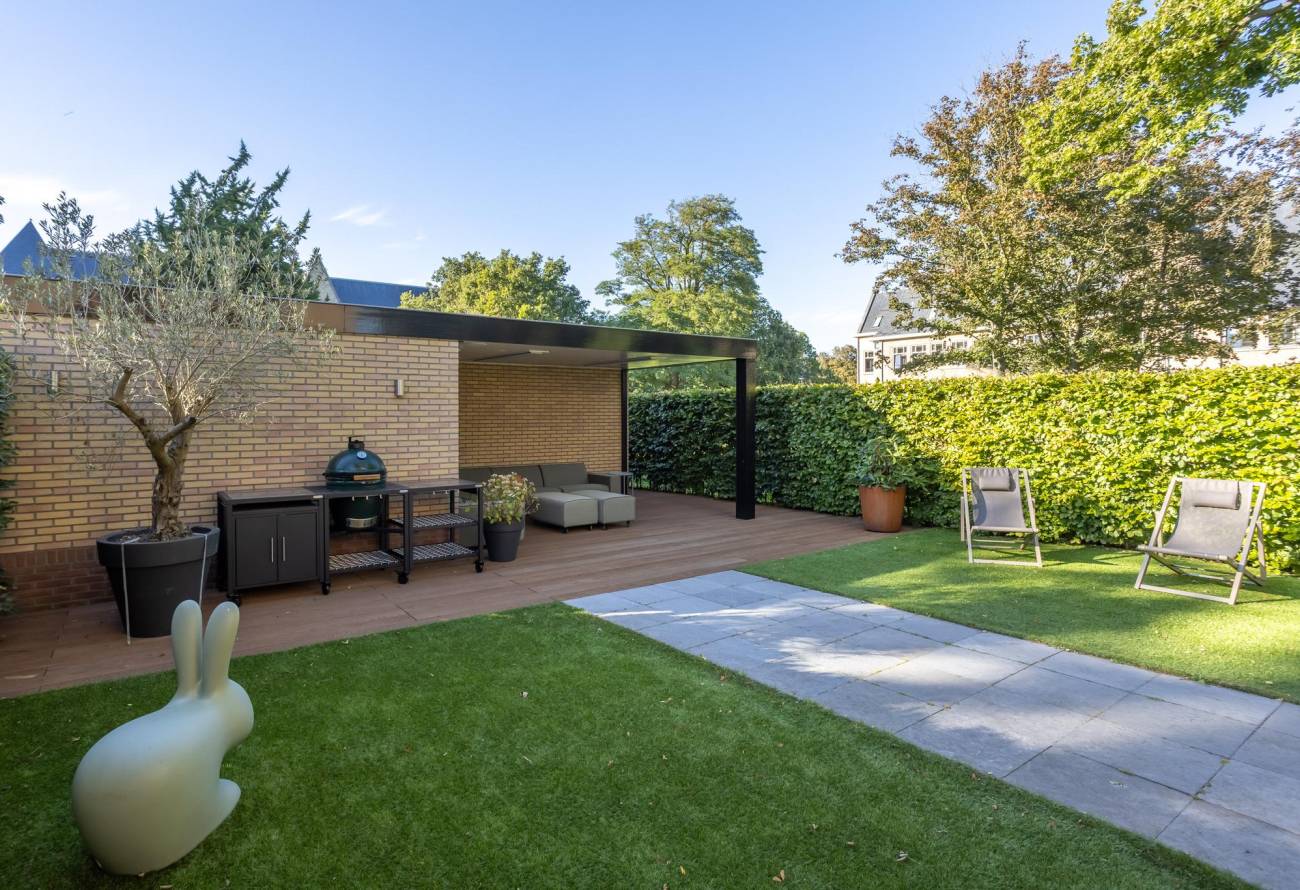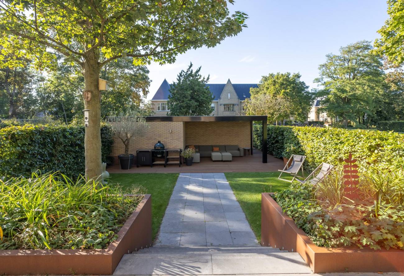 De met zorg aangelegde tuin ontvouwt zich met gratie en pronkt met diverse terrassen en sierlijke borders. Achter de tuin bij de garage liggen twee parkeerplaatsen, bereikbaar via een afsluitbare toegangspoort. De terrassen omarmen het huis en strekken zich uit naar de voor-, zij- en achterkant. Deze indeling biedt de mogelijkheid om op elk uur van de dag te genieten van zonneschijn of schaduw. 's Ochtends baadt de zon het voorbordes in haar stralen, terwijl het zijterras en het achterterras in de namiddag baden in het licht. Het tweede deel van de middag brengt de zonneschijn naar de hele achtertuin, inclusief het bordes. Bovendien nodigen uitgestrekte grasvelden aan de voor-, zij- en achterkant van de woning uit tot gemeenschappelijk gebruik.