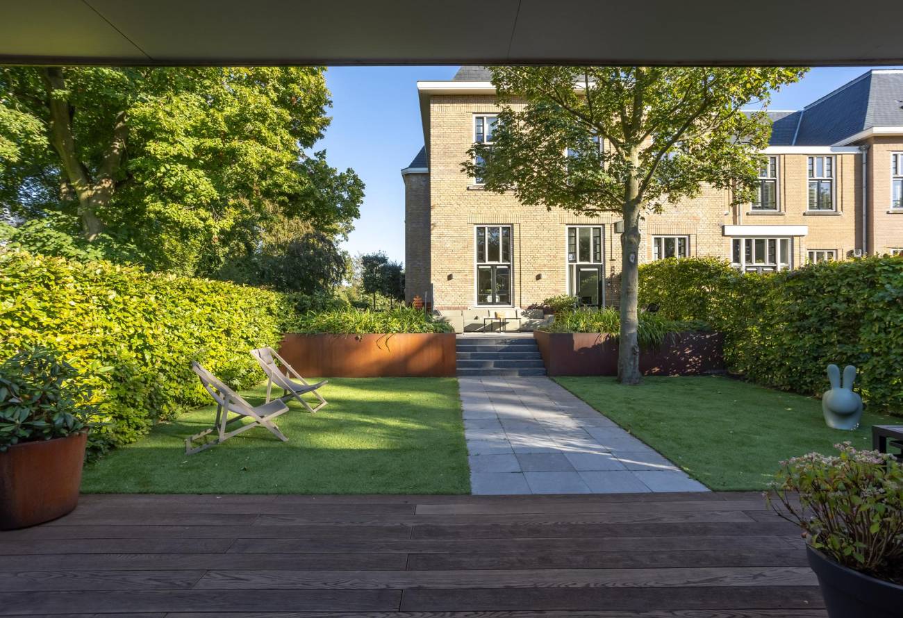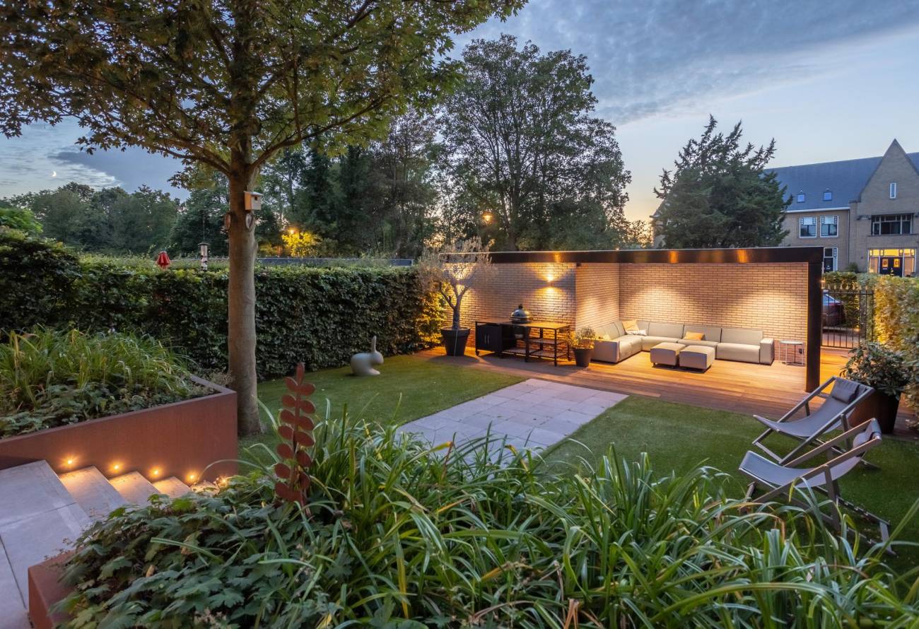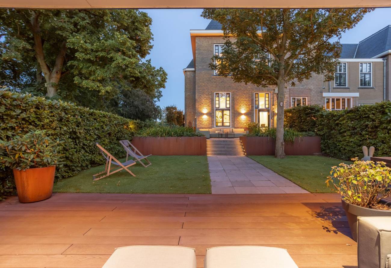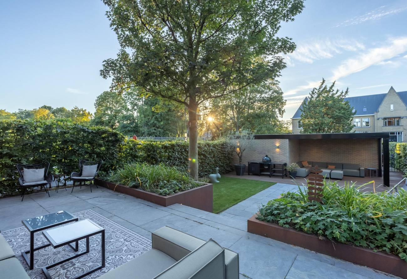 De met zorg aangelegde tuin ontvouwt zich met gratie en pronkt met diverse terrassen en sierlijke borders. Achter de tuin bij de garage liggen twee parkeerplaatsen, bereikbaar via een afsluitbare toegangspoort. De terrassen omarmen het huis en strekken zich uit naar de voor-, zij- en achterkant. Deze indeling biedt de mogelijkheid om op elk uur van de dag te genieten van zonneschijn of schaduw. 's Ochtends baadt de zon het voorbordes in haar stralen, terwijl het zijterras en het achterterras in de namiddag baden in het licht. Het tweede deel van de middag brengt de zonneschijn naar de hele achtertuin, inclusief het bordes. Bovendien nodigen uitgestrekte grasvelden aan de voor-, zij- en achterkant van de woning uit tot gemeenschappelijk gebruik.