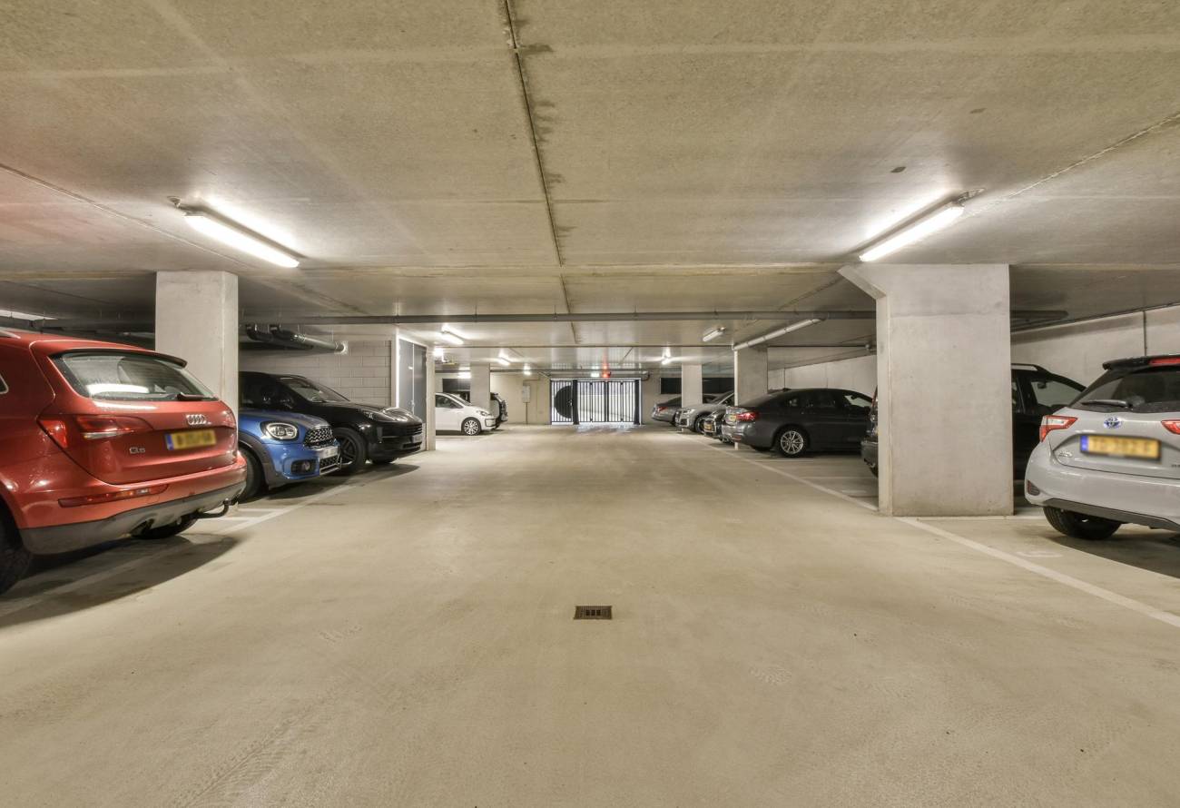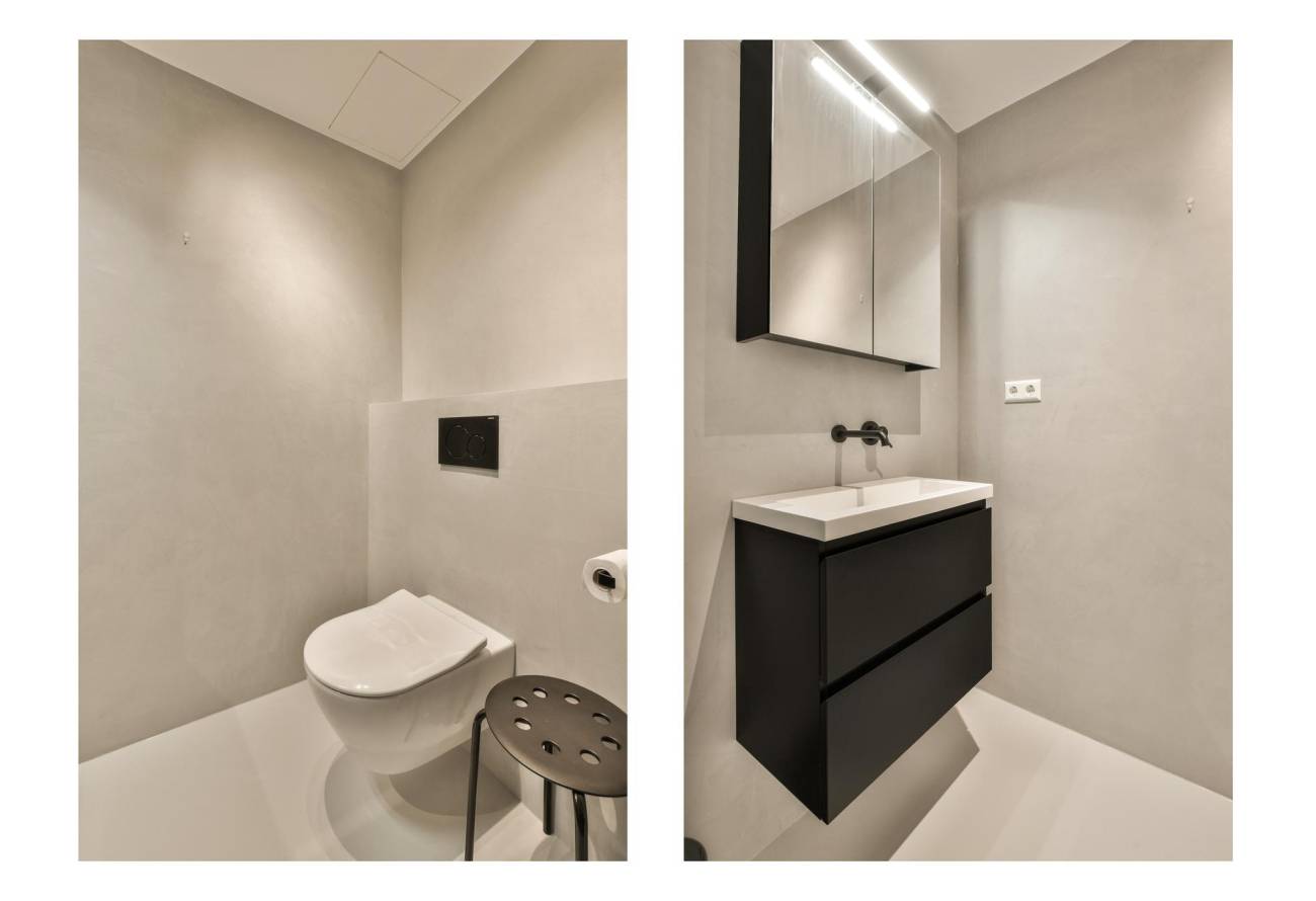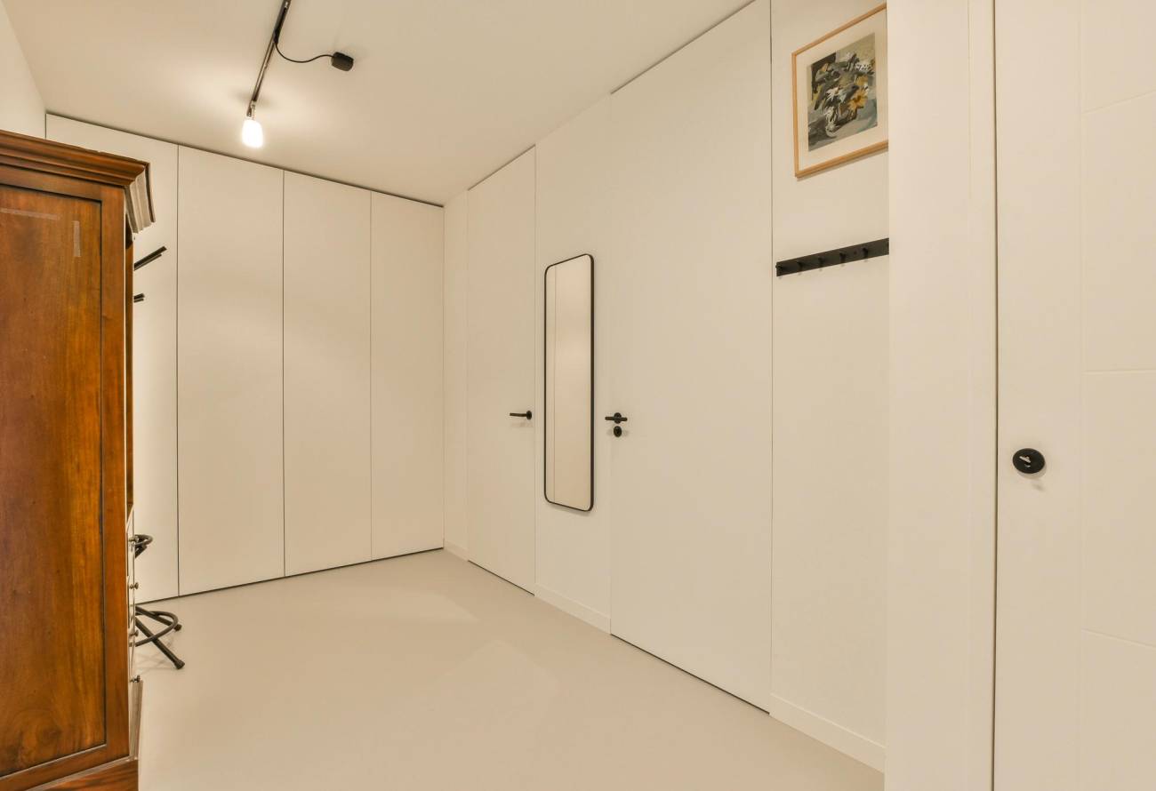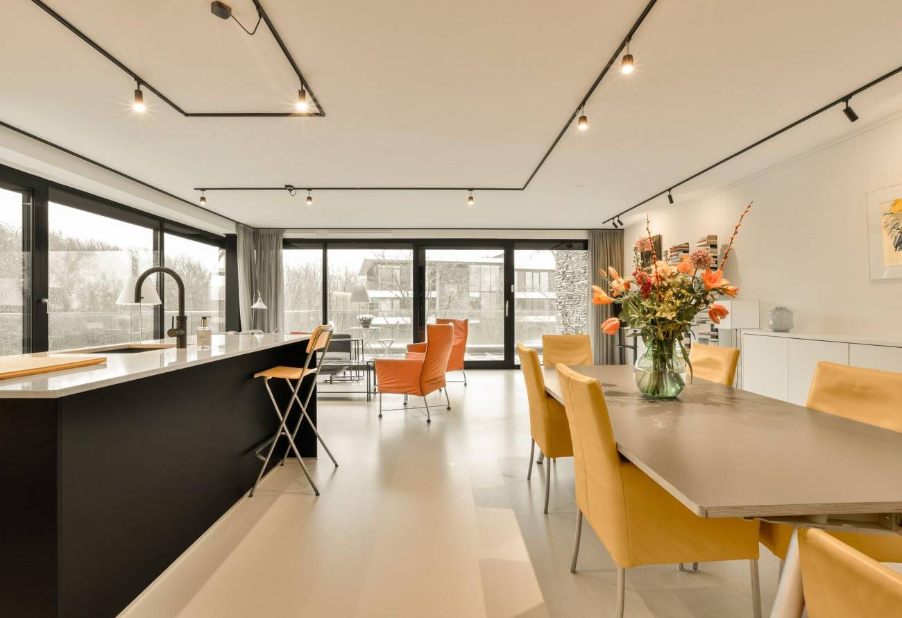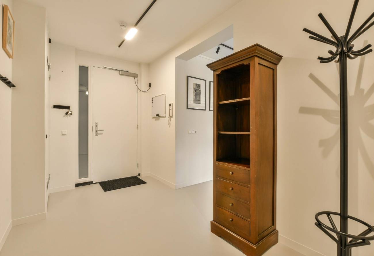 Ruime entree met fraaie epoxy gietvloer met vloerverwarming welke is doorgevoerd in het gehele appartement. De entree biedt toegang tot alle ruimtes waaronder aan de rechterzijde een modern separaat toilet met fonteintje, meterkast en inpandig berging waar zich de tevens de aansluitingen van de wasapparatuur bevinden. De living is voorzien van veel glazen raampartijen over de gehele hoogte en mede hierdoor heeft u prachtig uitzicht. Middels de glazen schuifpui bereikt u het royale terras van maar liefst 24m². De luxe open keuken met kookeiland is uitgevoerd in een matzwarte kleurstelling en voorzien van allerhande inbouwapparatuur en Bora afzuigsysteem De prachtige badkamer is voorzien van matzwarte accenten en beschikt over een dubbele douche, zwevend toilet met bidet, designradiator en dubbele wastafel met luxe meubel.
