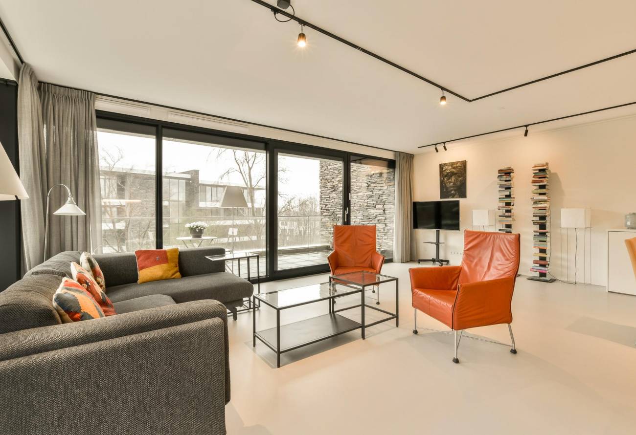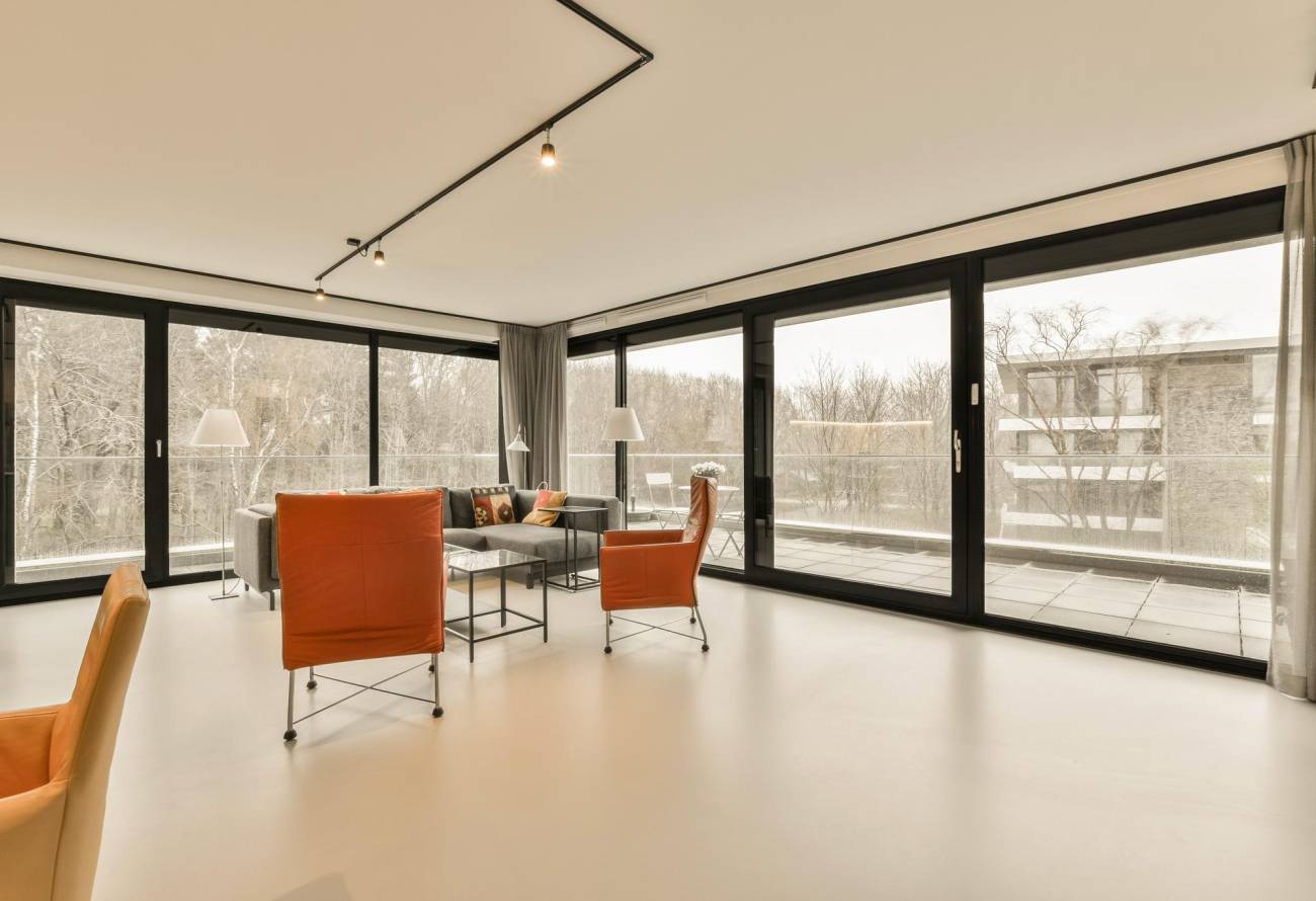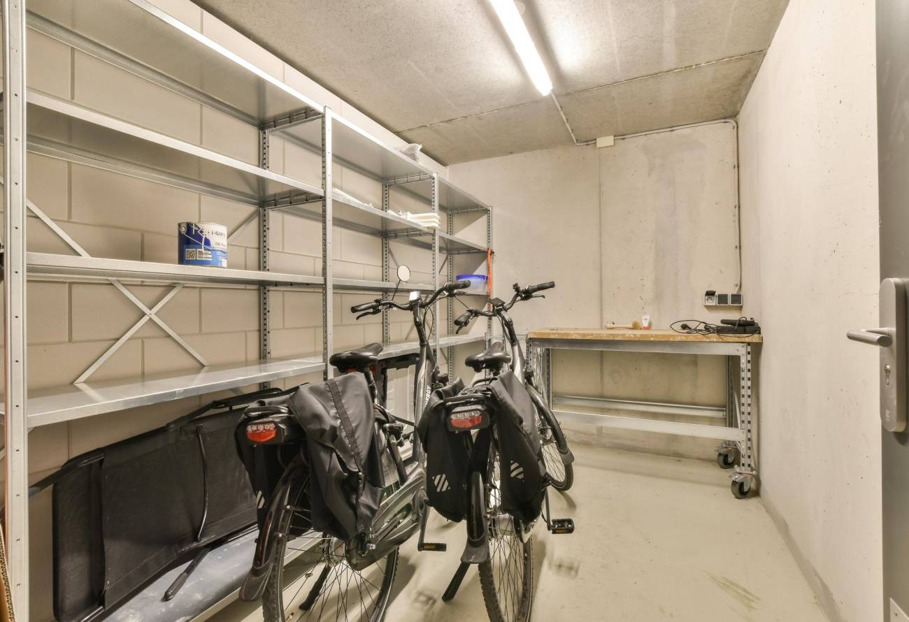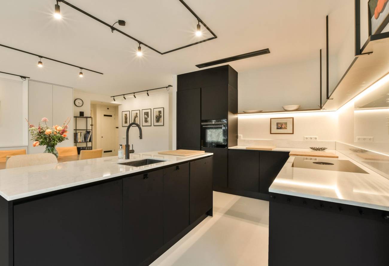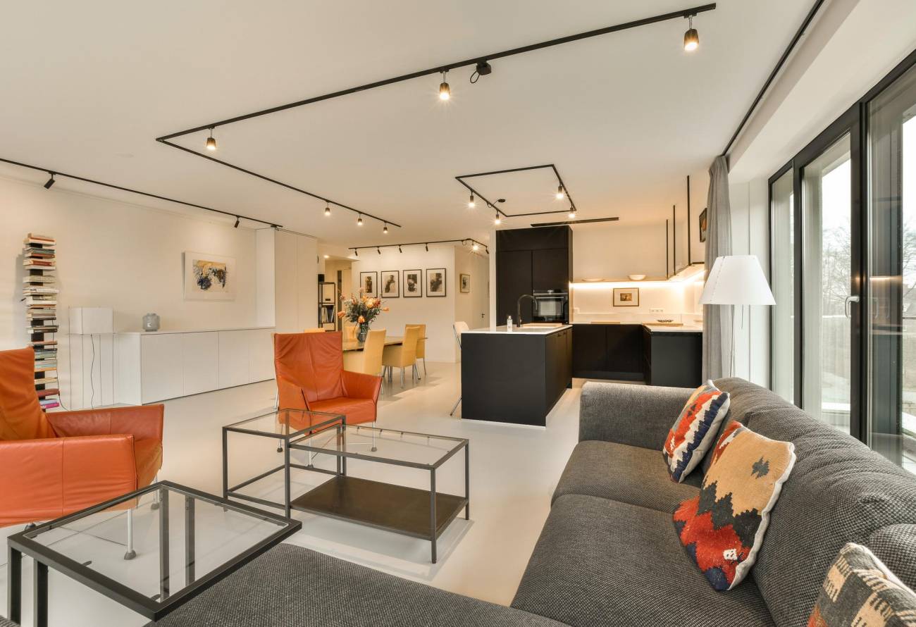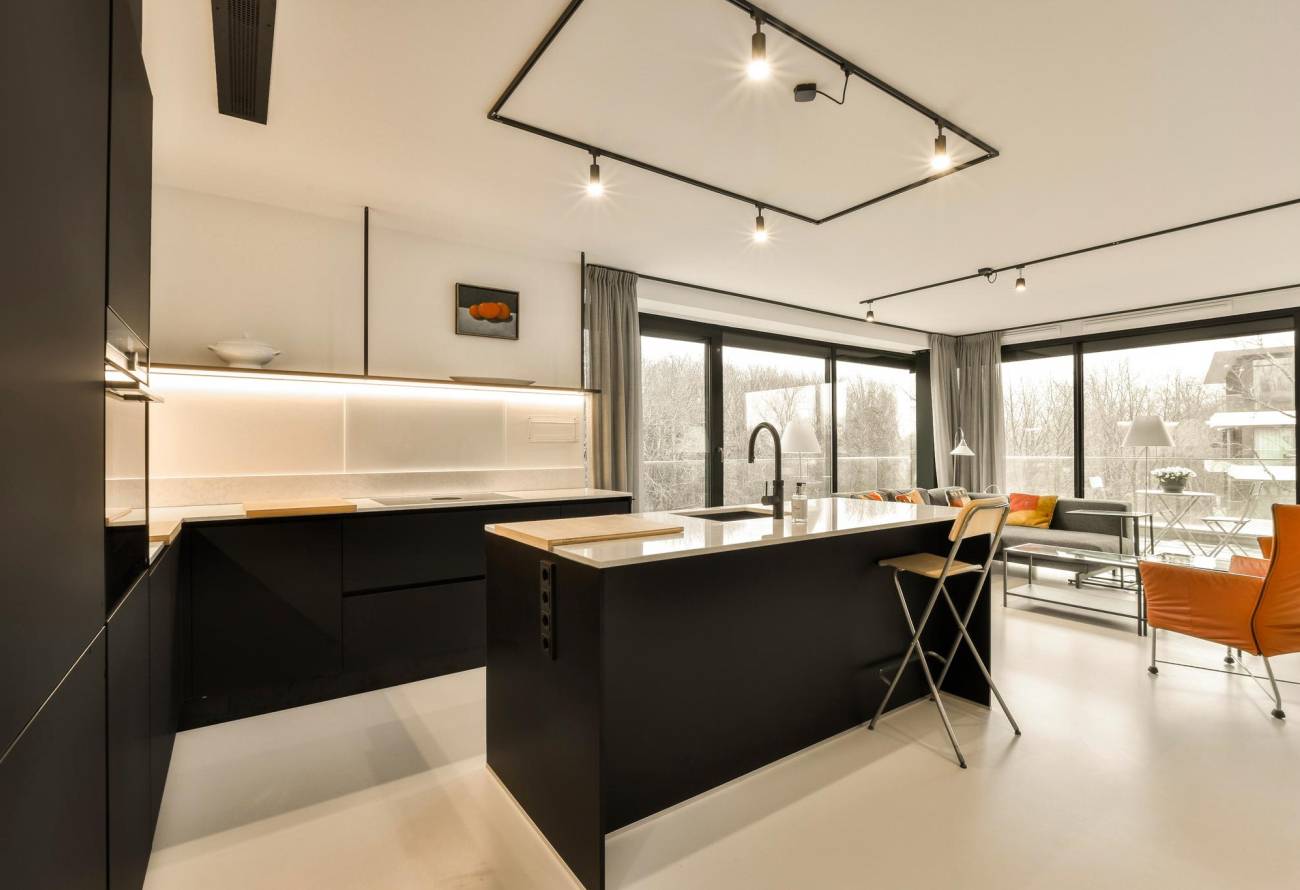 Ruime entree met fraaie epoxy gietvloer met vloerverwarming welke is doorgevoerd in het gehele appartement. De entree biedt toegang tot alle ruimtes waaronder aan de rechterzijde een modern separaat toilet met fonteintje, meterkast en inpandig berging waar zich de tevens de aansluitingen van de wasapparatuur bevinden. De living is voorzien van veel glazen raampartijen over de gehele hoogte en mede hierdoor heeft u prachtig uitzicht. Middels de glazen schuifpui bereikt u het royale terras van maar liefst 24m². De luxe open keuken met kookeiland is uitgevoerd in een matzwarte kleurstelling en voorzien van allerhande inbouwapparatuur en Bora afzuigsysteem De prachtige badkamer is voorzien van matzwarte accenten en beschikt over een dubbele douche, zwevend toilet met bidet, designradiator en dubbele wastafel met luxe meubel.