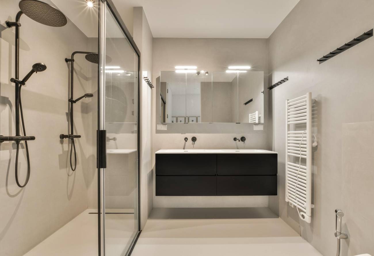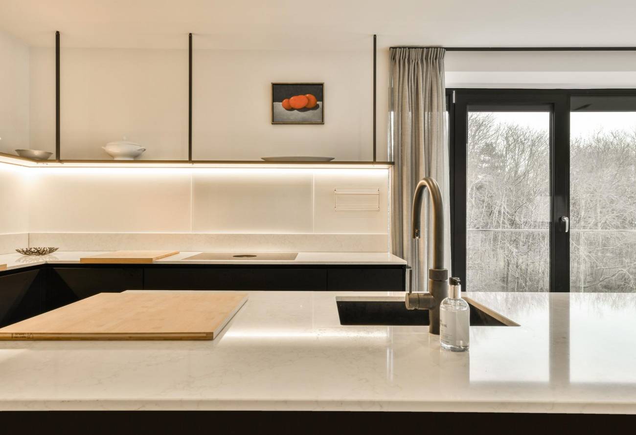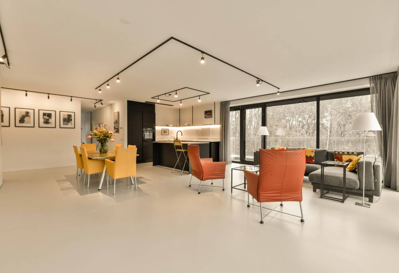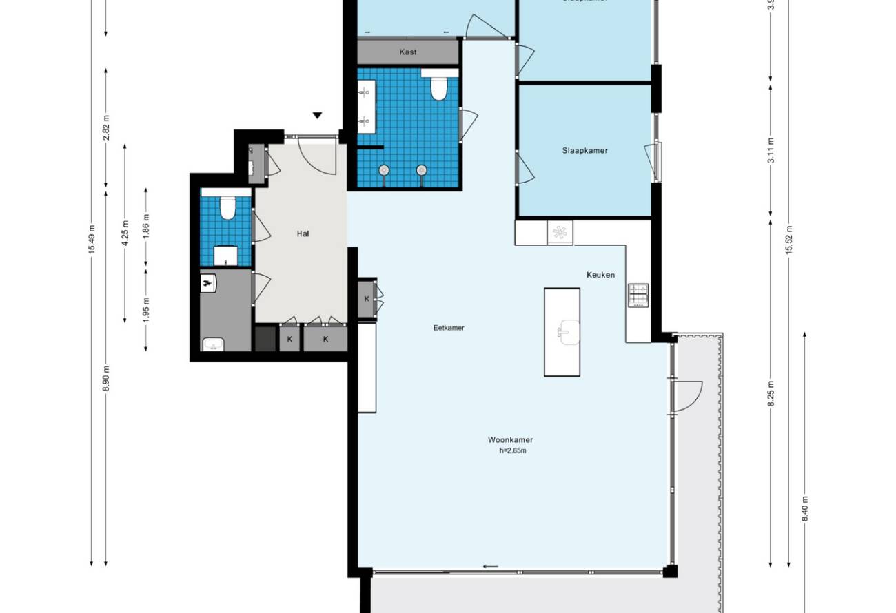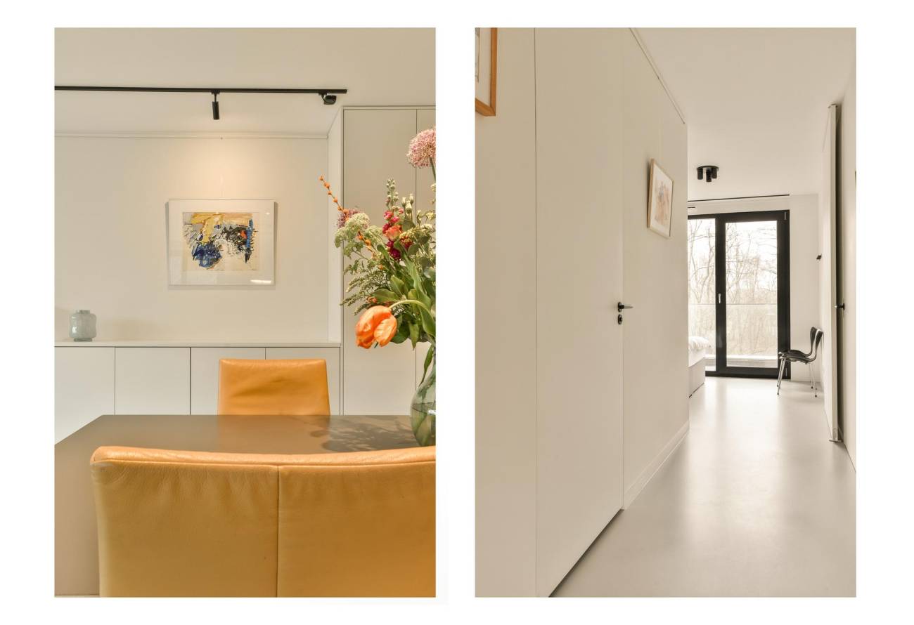 Ruime entree met fraaie epoxy gietvloer met vloerverwarming welke is doorgevoerd in het gehele appartement. De entree biedt toegang tot alle ruimtes waaronder aan de rechterzijde een modern separaat toilet met fonteintje, meterkast en inpandig berging waar zich de tevens de aansluitingen van de wasapparatuur bevinden. De living is voorzien van veel glazen raampartijen over de gehele hoogte en mede hierdoor heeft u prachtig uitzicht. Middels de glazen schuifpui bereikt u het royale terras van maar liefst 24m². De luxe open keuken met kookeiland is uitgevoerd in een matzwarte kleurstelling en voorzien van allerhande inbouwapparatuur en Bora afzuigsysteem De prachtige badkamer is voorzien van matzwarte accenten en beschikt over een dubbele douche, zwevend toilet met bidet, designradiator en dubbele wastafel met luxe meubel.