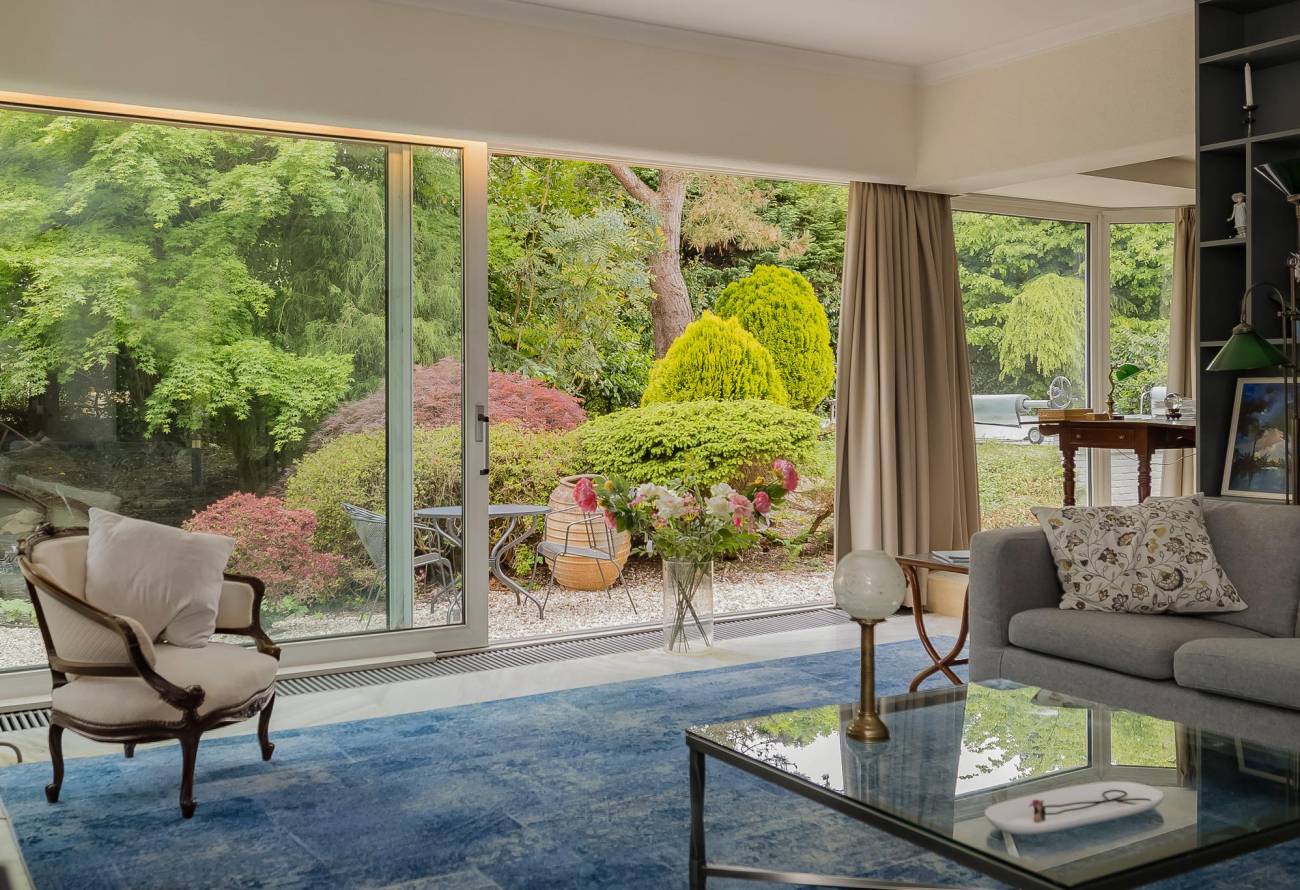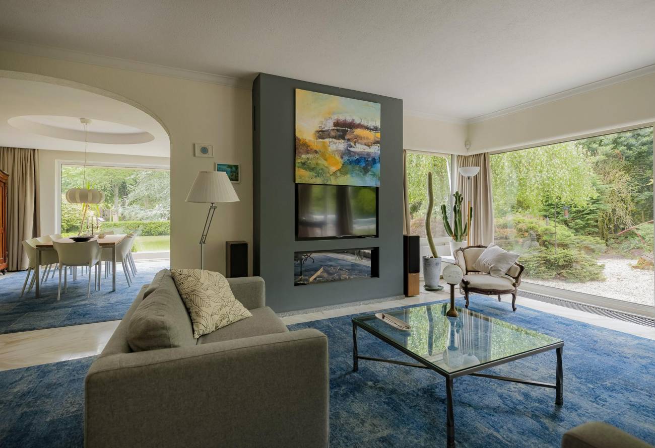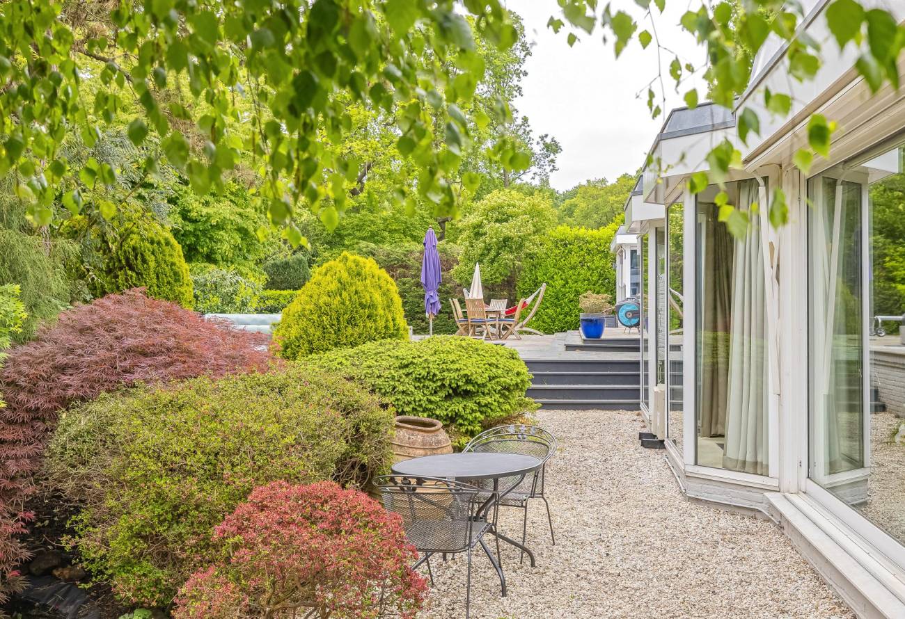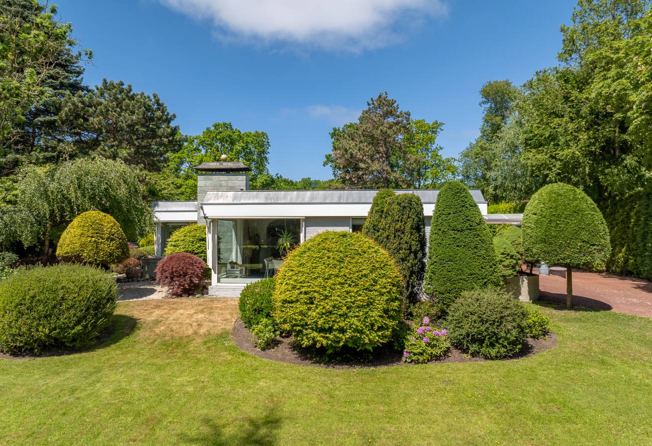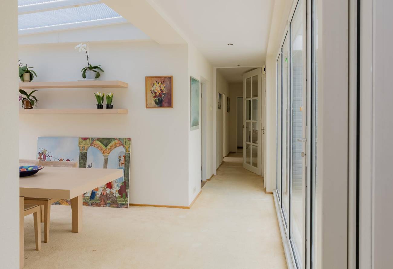 Vanaf de statige oprijlaan, omzoomd met hagen en volwassen bomen, voel je direct de rust en het royale karakter van dit perceel. Via de dubbele voordeur betreed je een indrukwekkende ontvangsthal, die leidt naar een royale, lichte woonkamer met haard. De eetkamer en de gezellige study met erker lopen hier naadloos in over. Grote schuifpuien en raampartijen zorgen voor een prachtig zicht op de Japanse tuin en een overvloed aan daglicht.