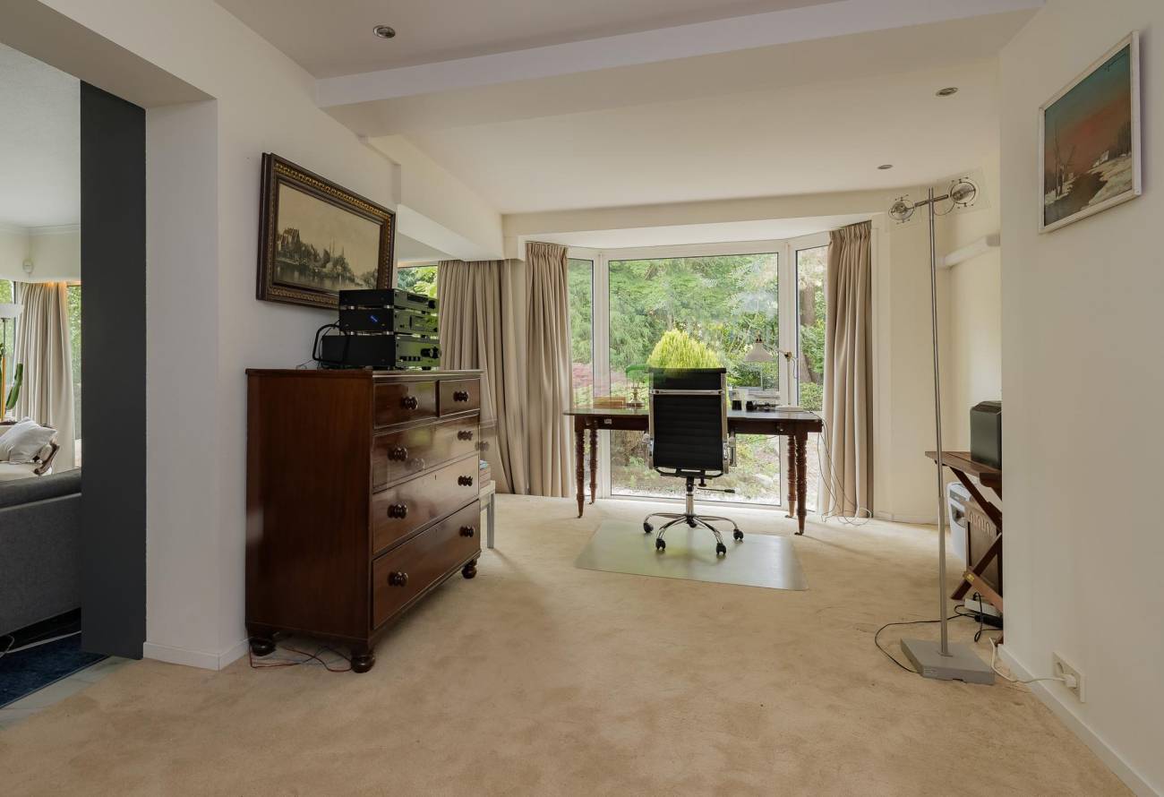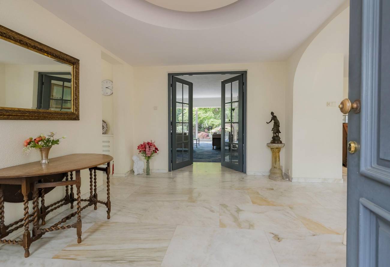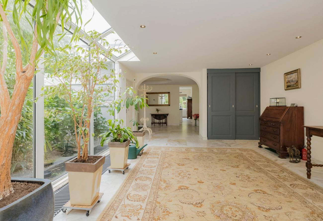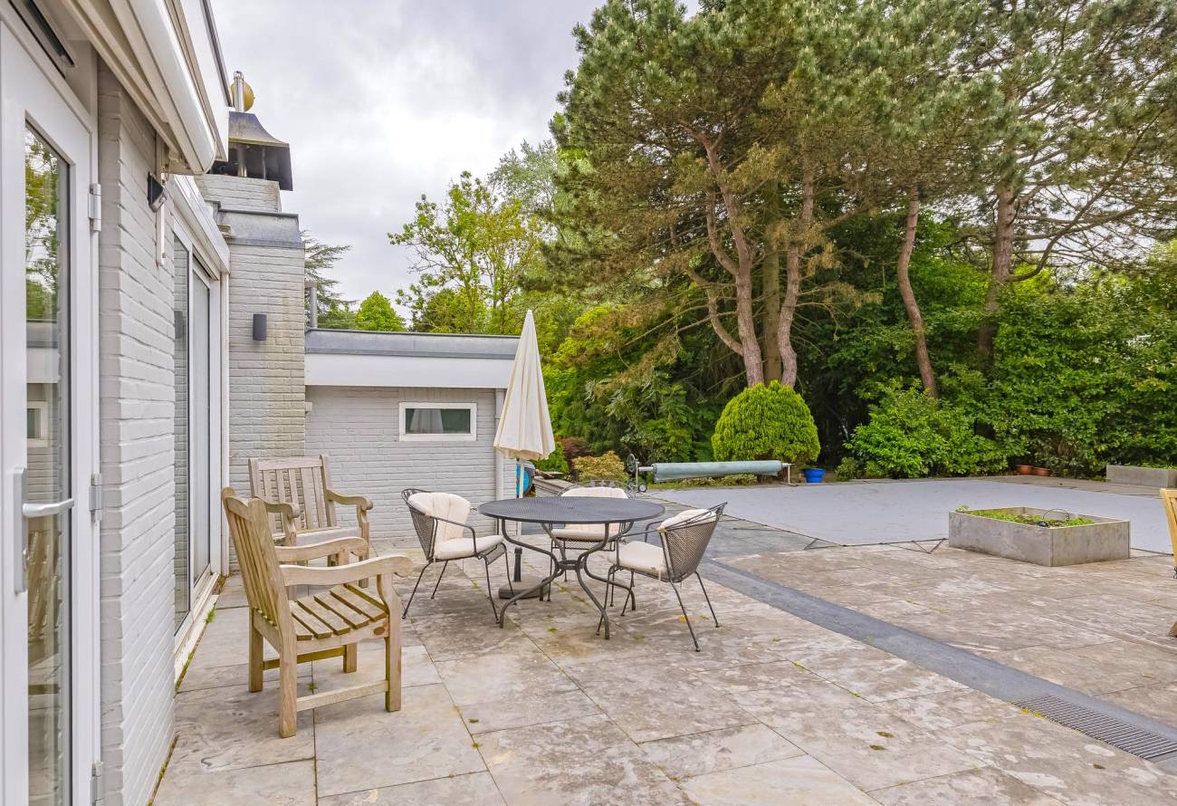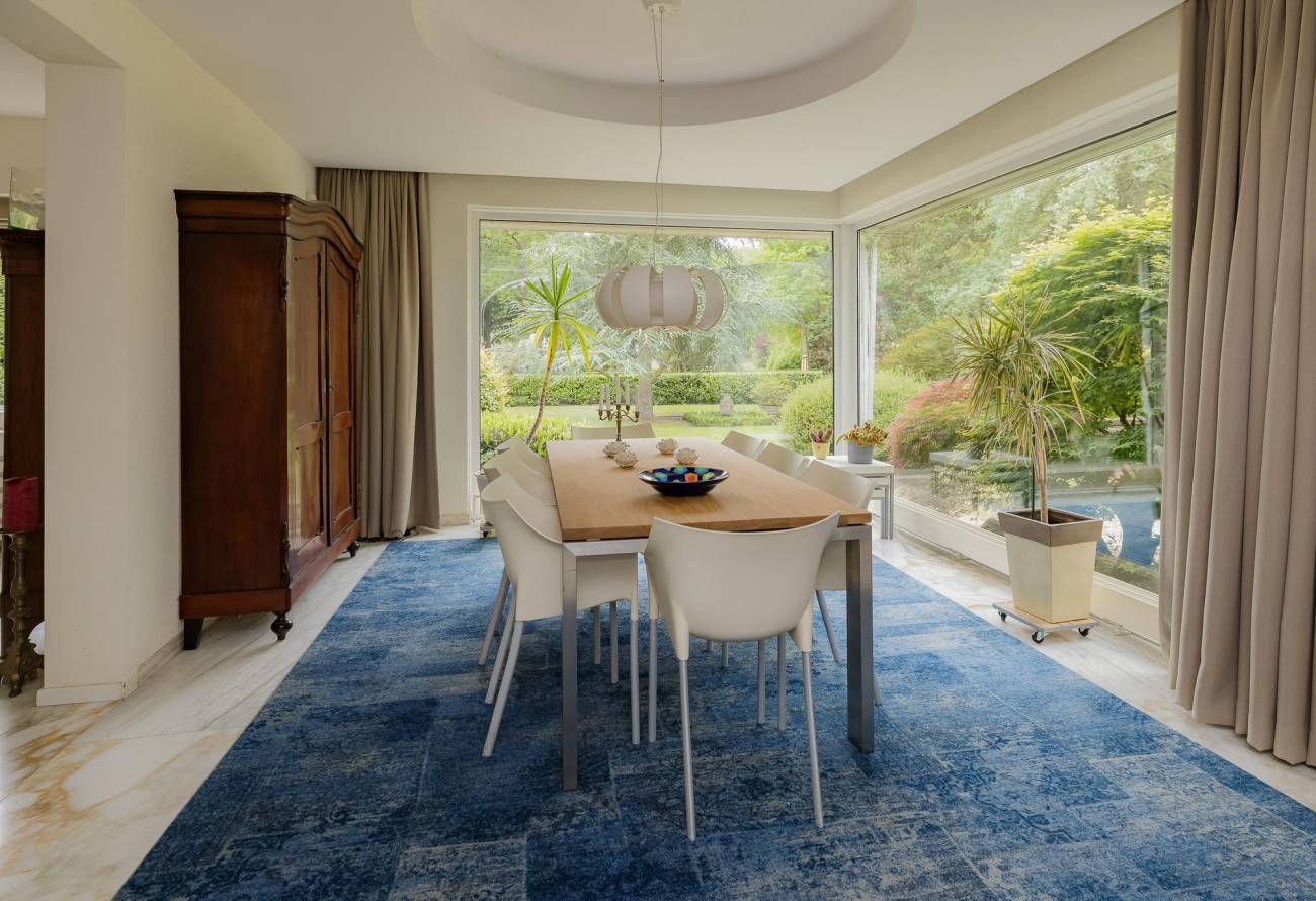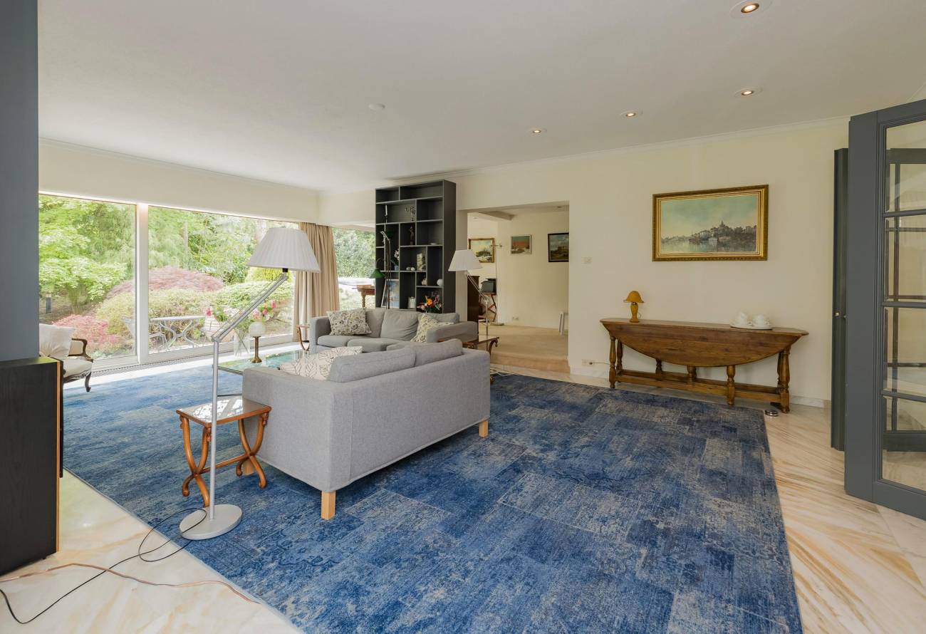 Vanaf de statige oprijlaan, omzoomd met hagen en volwassen bomen, voel je direct de rust en het royale karakter van dit perceel. Via de dubbele voordeur betreed je een indrukwekkende ontvangsthal, die leidt naar een royale, lichte woonkamer met haard. De eetkamer en de gezellige study met erker lopen hier naadloos in over. Grote schuifpuien en raampartijen zorgen voor een prachtig zicht op de Japanse tuin en een overvloed aan daglicht.