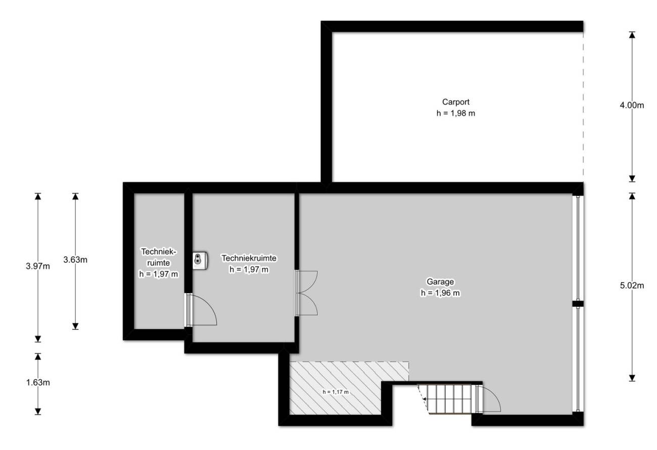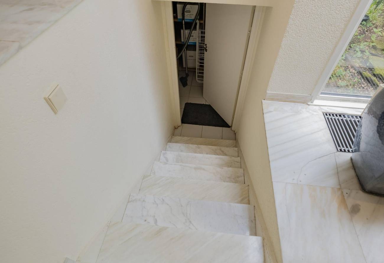 Vanuit de hal leidt een trap naar het souterrain, waar je een ruime inpandige garage en technische ruimtes vindt, inclusief de cv-ketel (2021) en de installatie tbv het zwembad.