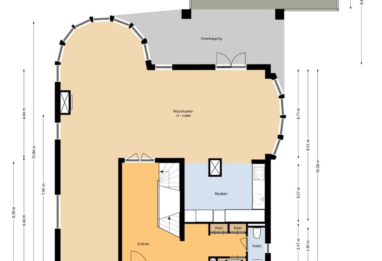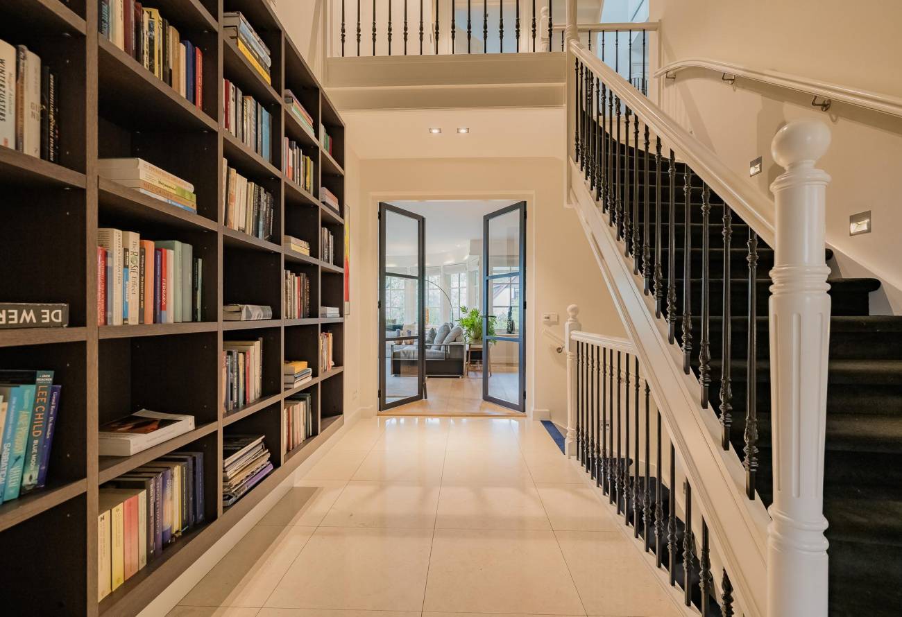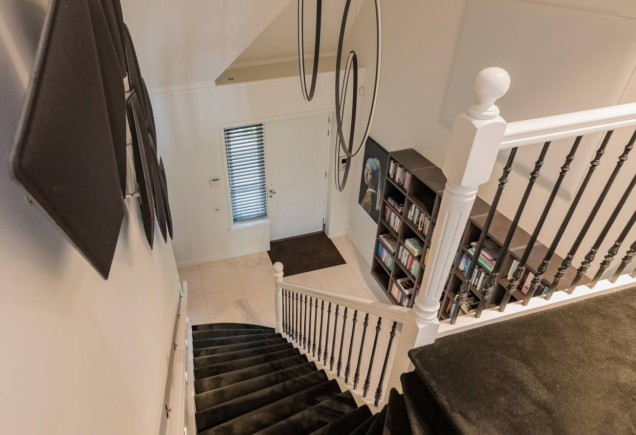Bij binnenkomst is er een royale hal met vide en garderobenis, gastentoilet en de fraaie bordestrap naar de 1e verdieping.