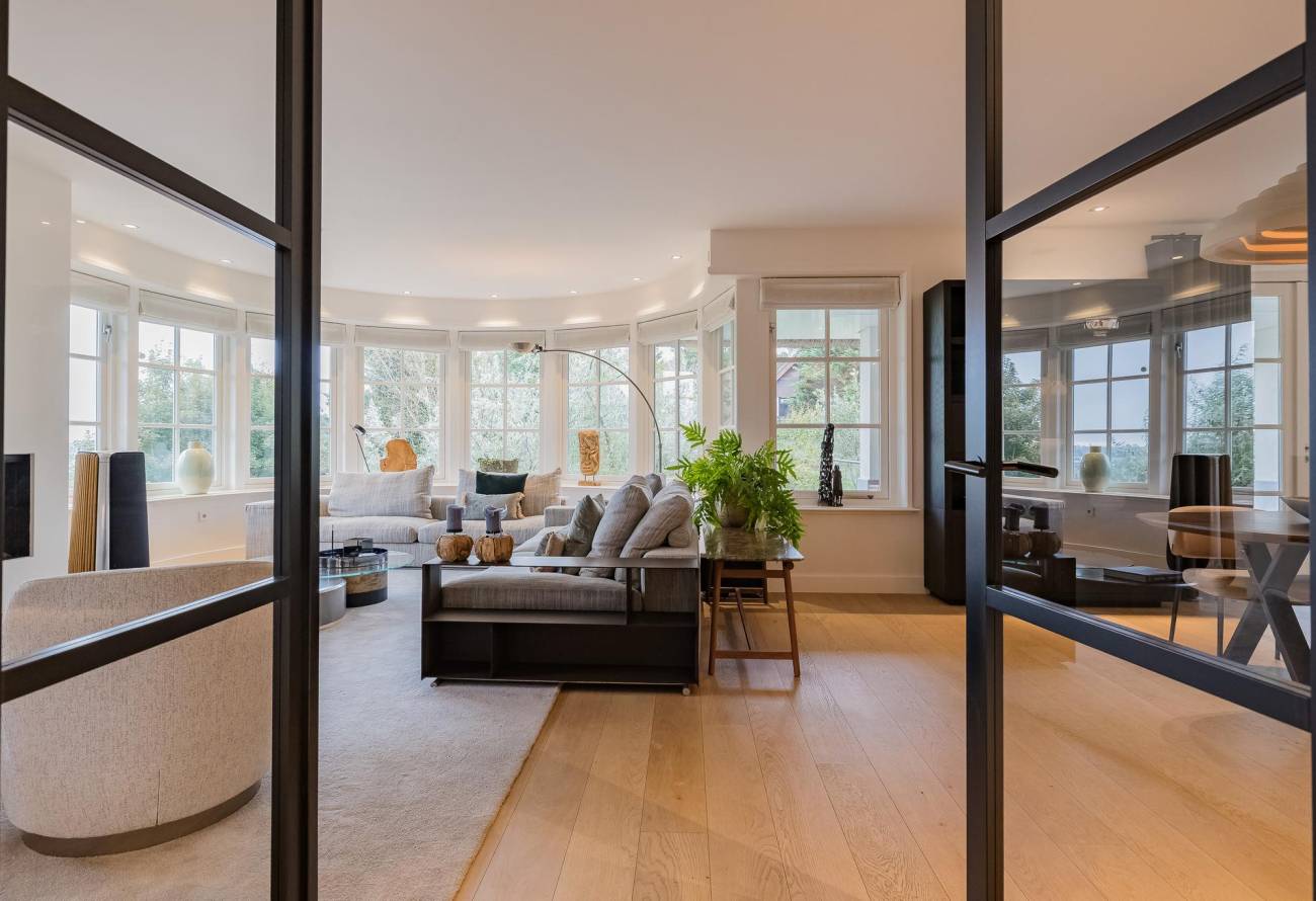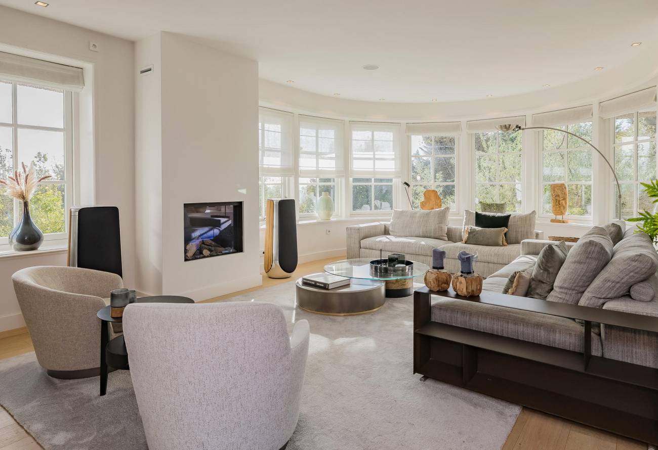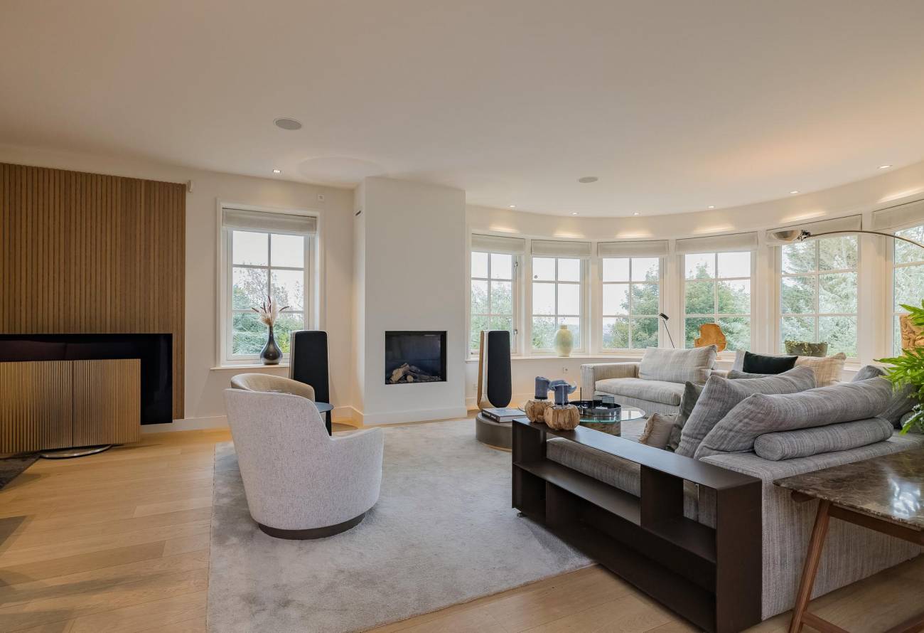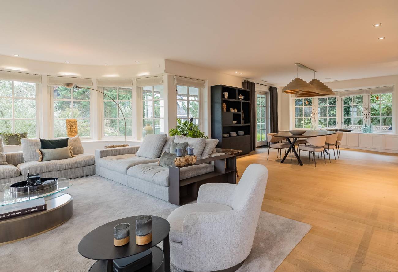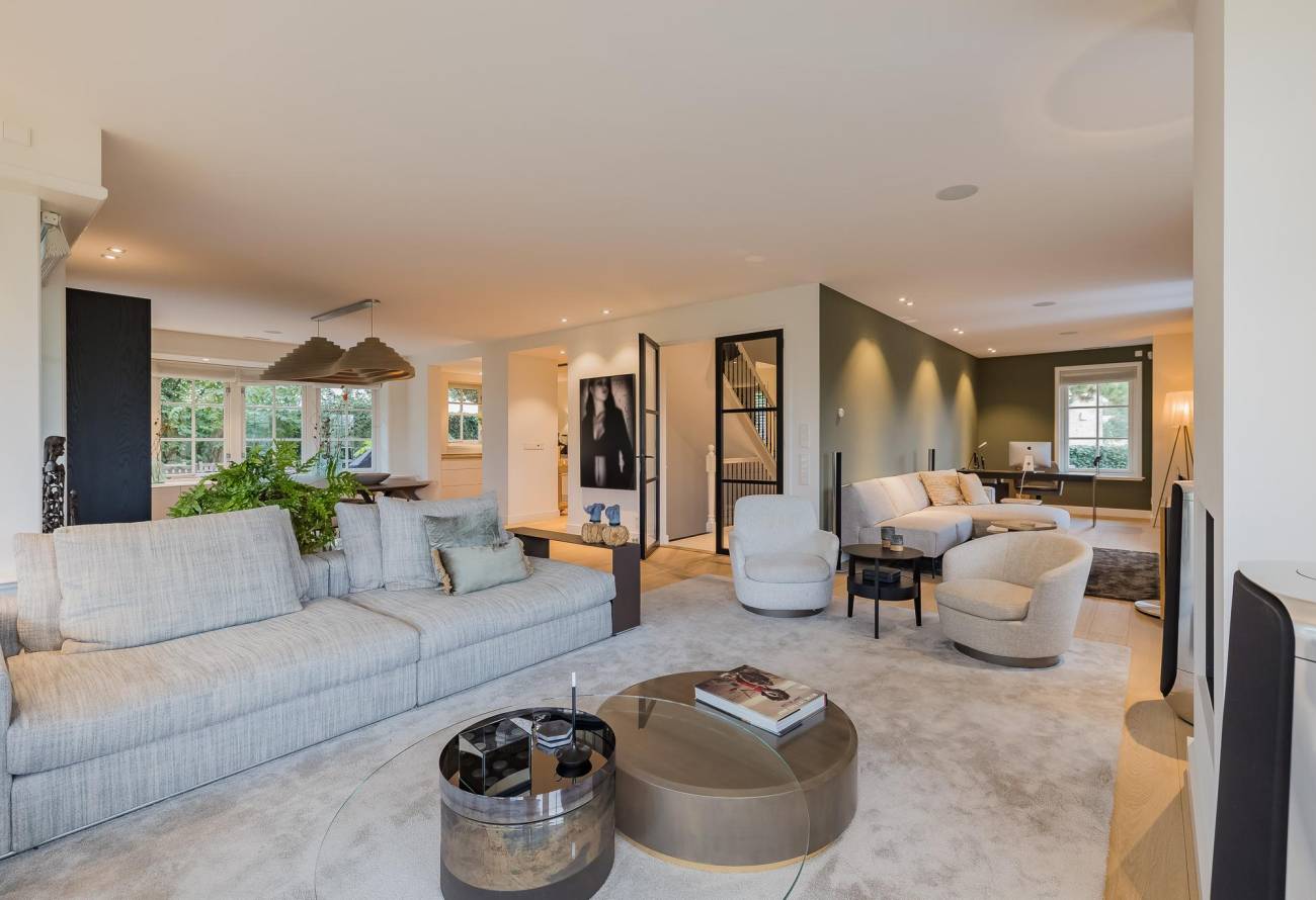De zeer royale living met haard heeft een zithoek met panoramisch uitzicht, een werkhoek en een grote eethoek met deuren naar een heerlijk ruim terras. De open keuken heeft luxe inbouwapparatuur en staat in open verbinding met de eetkamer.
