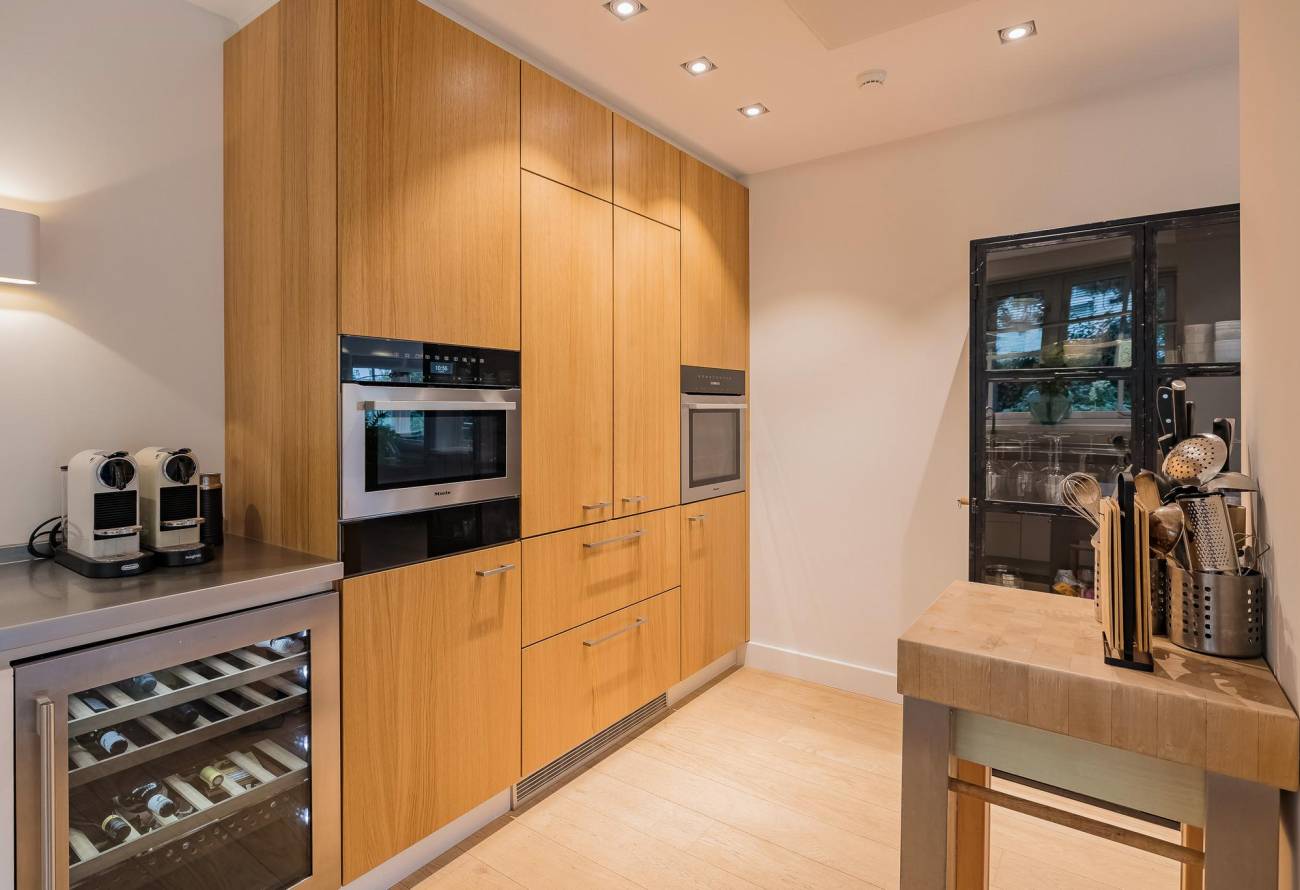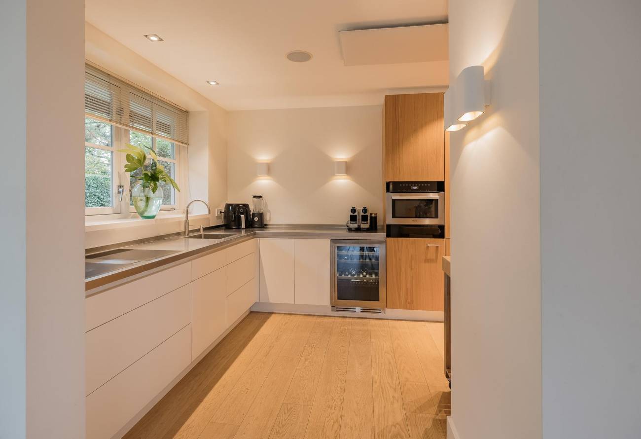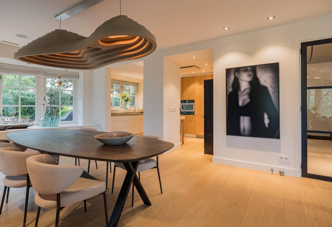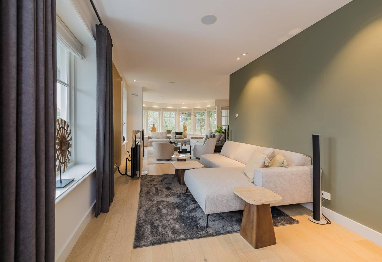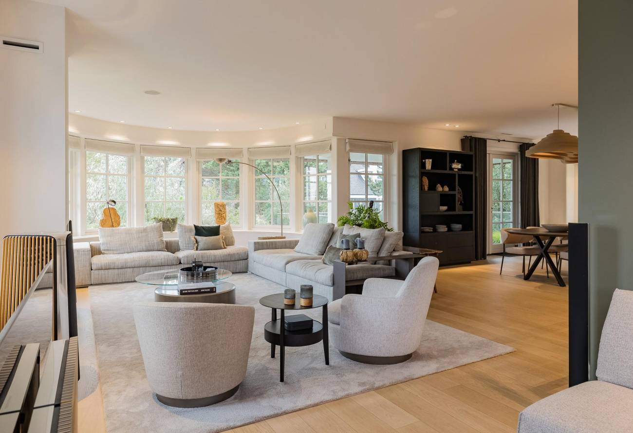 De zeer royale living met haard heeft een zithoek met panoramisch uitzicht, een werkhoek en een grote eethoek met deuren naar een heerlijk ruim terras. De open keuken heeft luxe inbouwapparatuur en staat in open verbinding met de eetkamer.