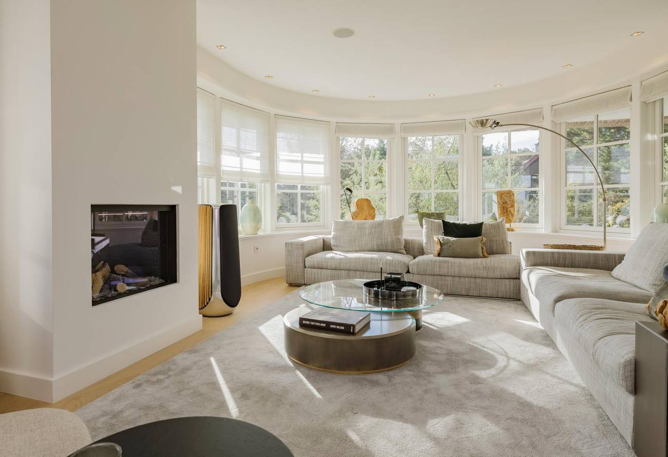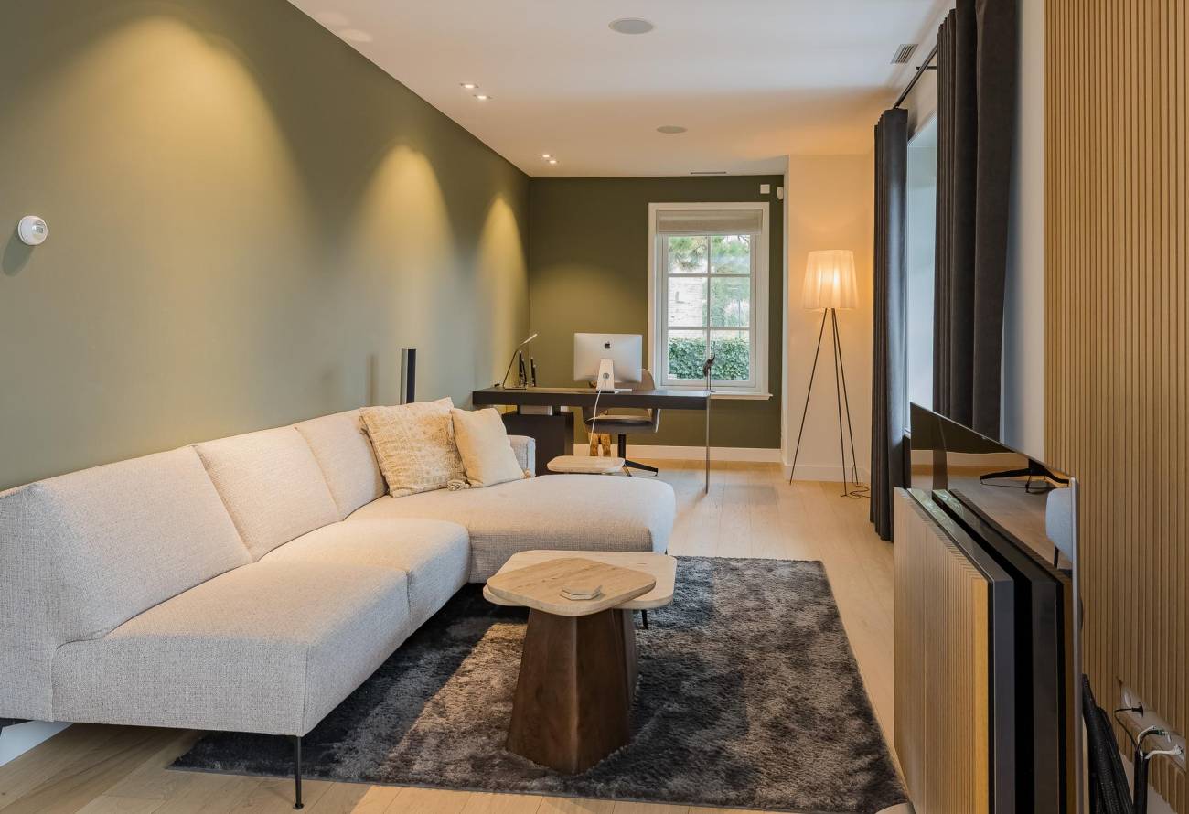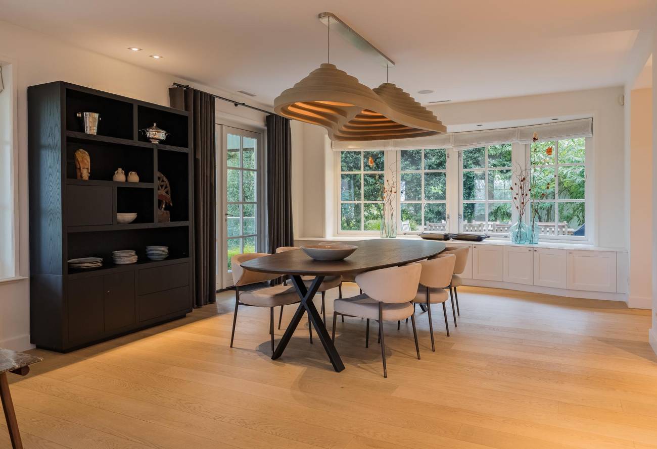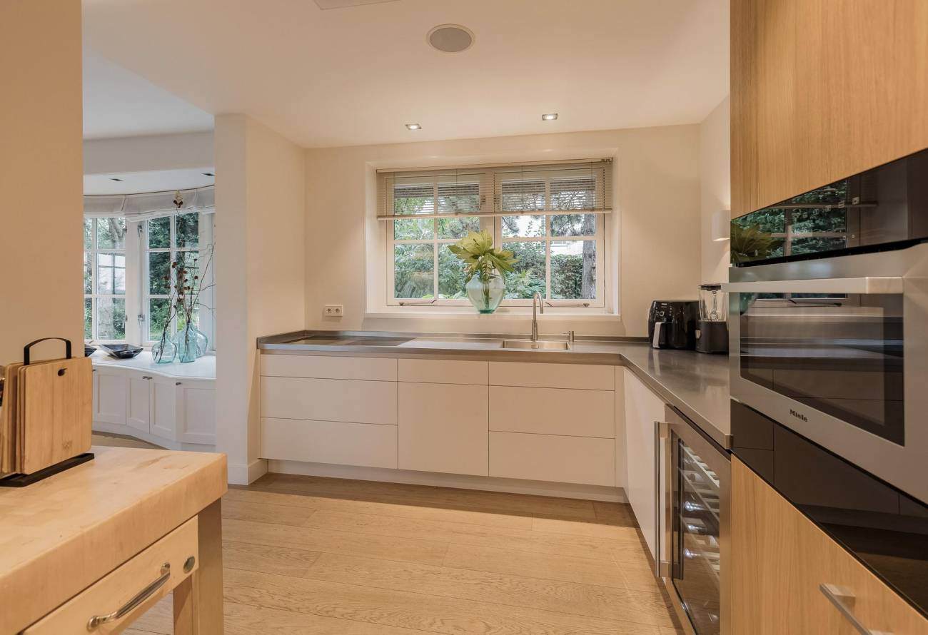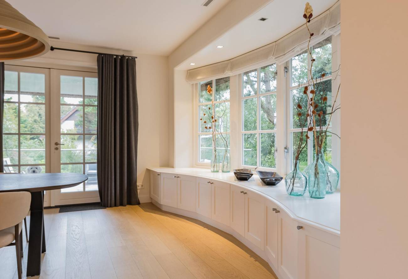 De zeer royale living met haard heeft een zithoek met panoramisch uitzicht, een werkhoek en een grote eethoek met deuren naar een heerlijk ruim terras. De open keuken heeft luxe inbouwapparatuur en staat in open verbinding met de eetkamer.