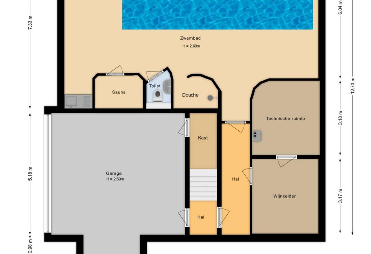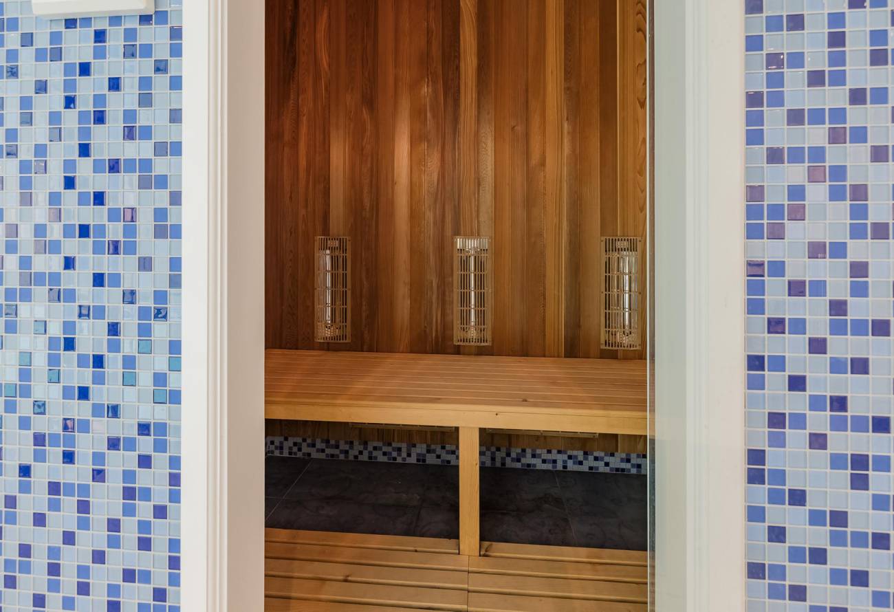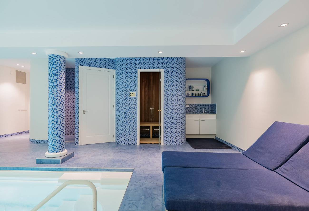 • Een grote, betegelde recreatieruimte met vloerverwarming, voorzien van een verwarmd zwembad, een douche- en een toiletruimte, een infrarood sauna en een pantry