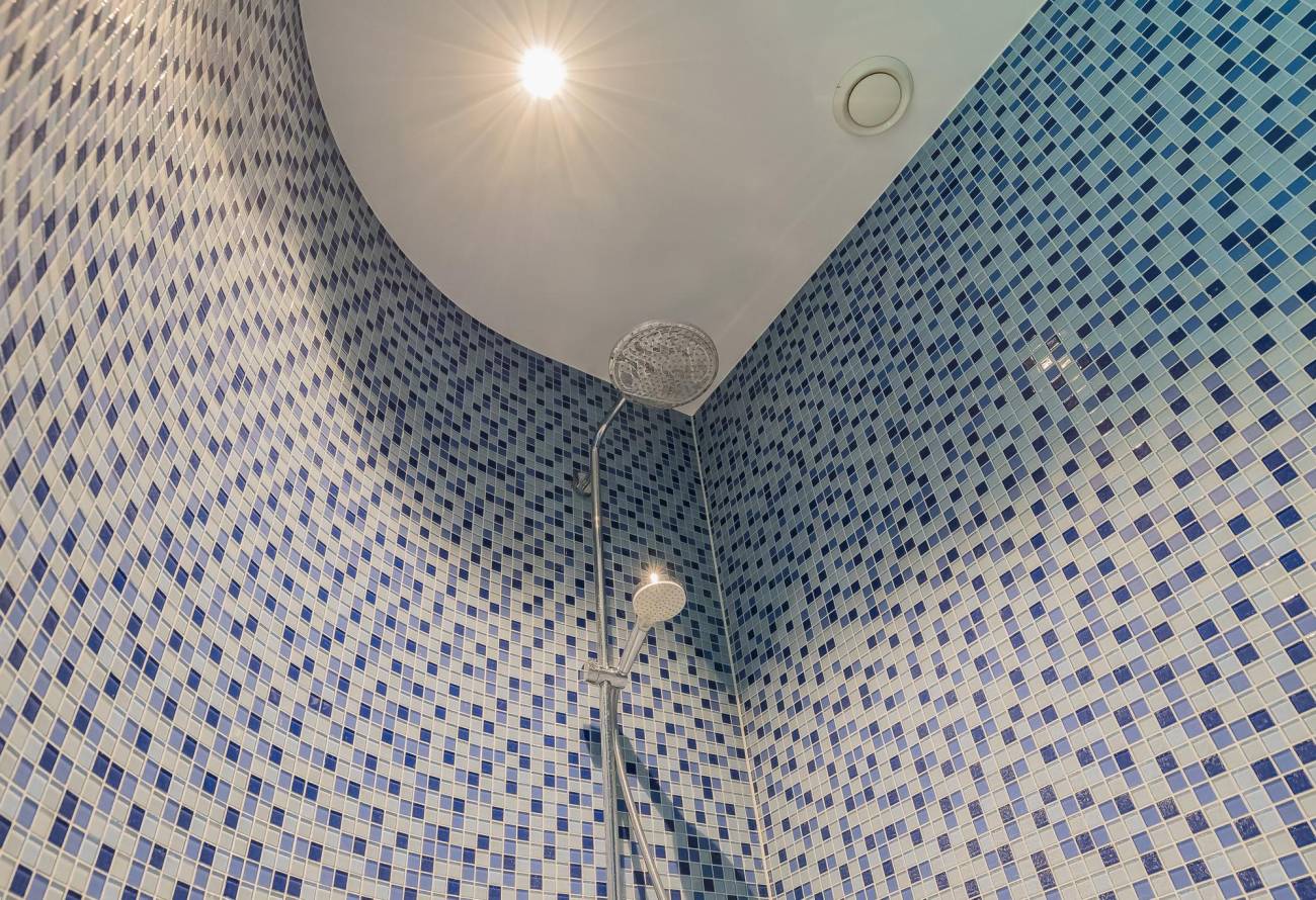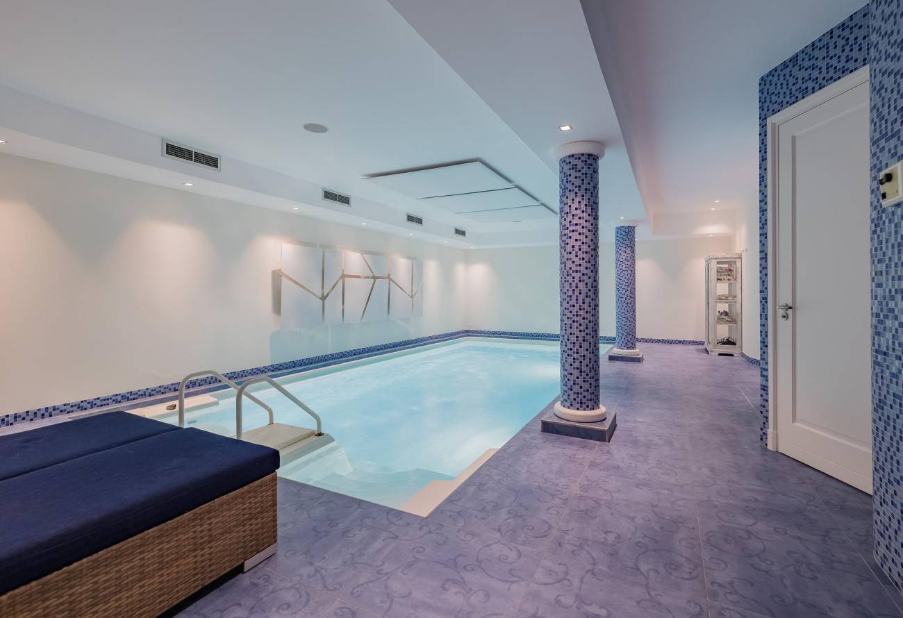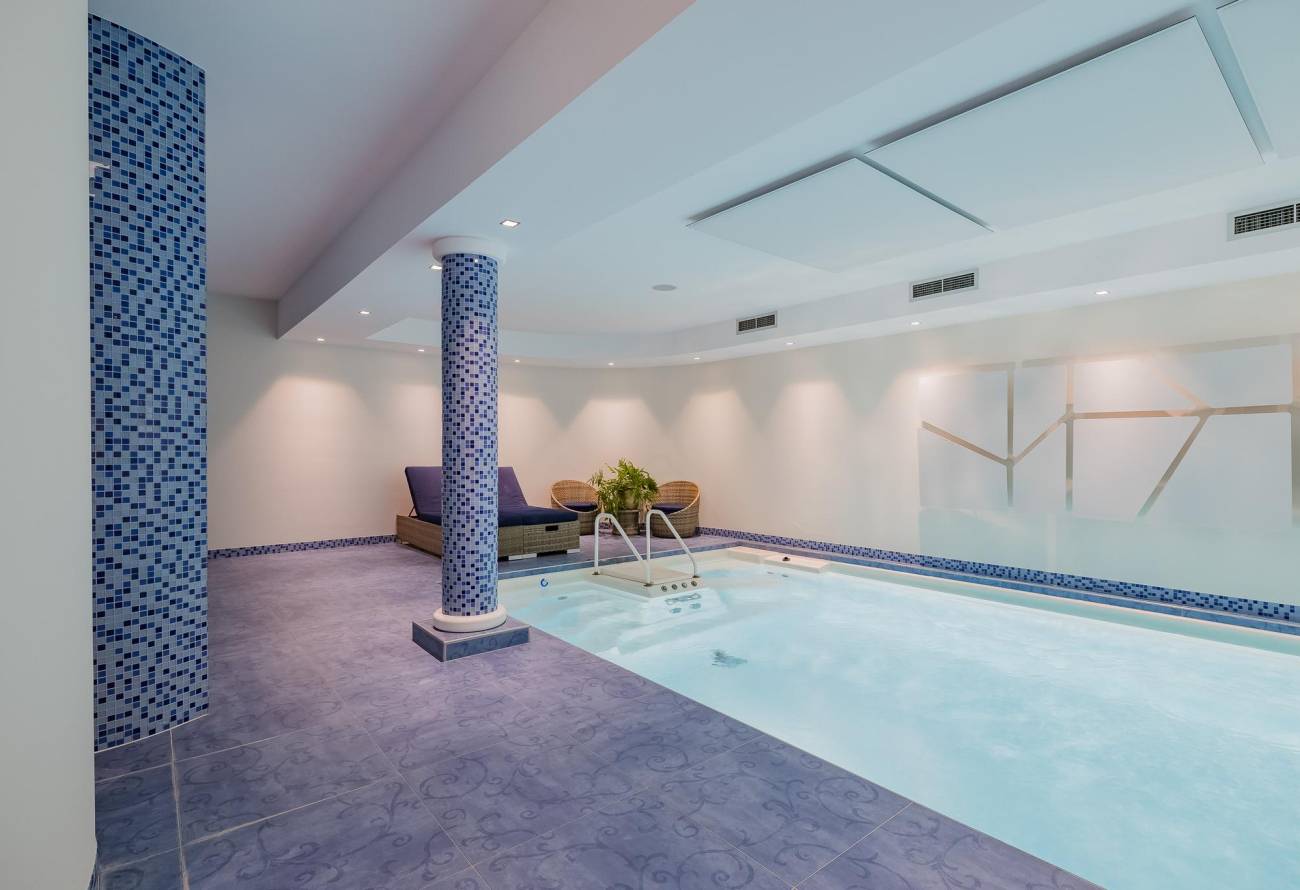 • Een grote, betegelde recreatieruimte met vloerverwarming, voorzien van een verwarmd zwembad, een douche- en een toiletruimte, een infrarood sauna en een pantry