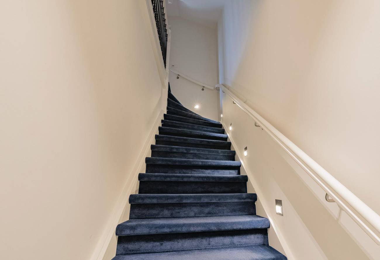 Via de speels aangelegde trap komen we bij de entree van de woning.
