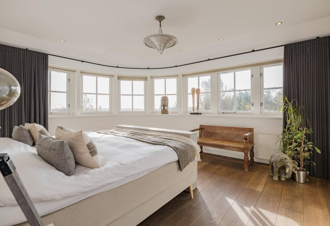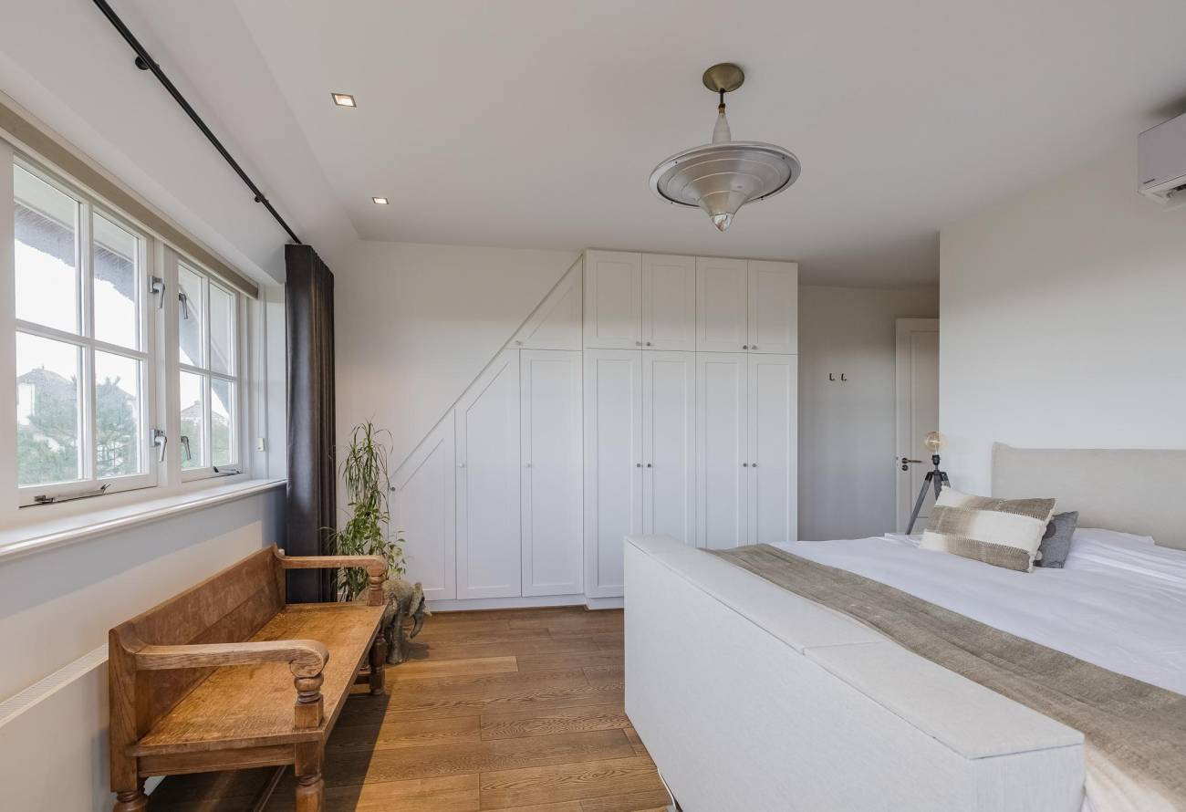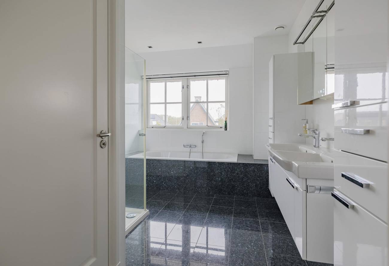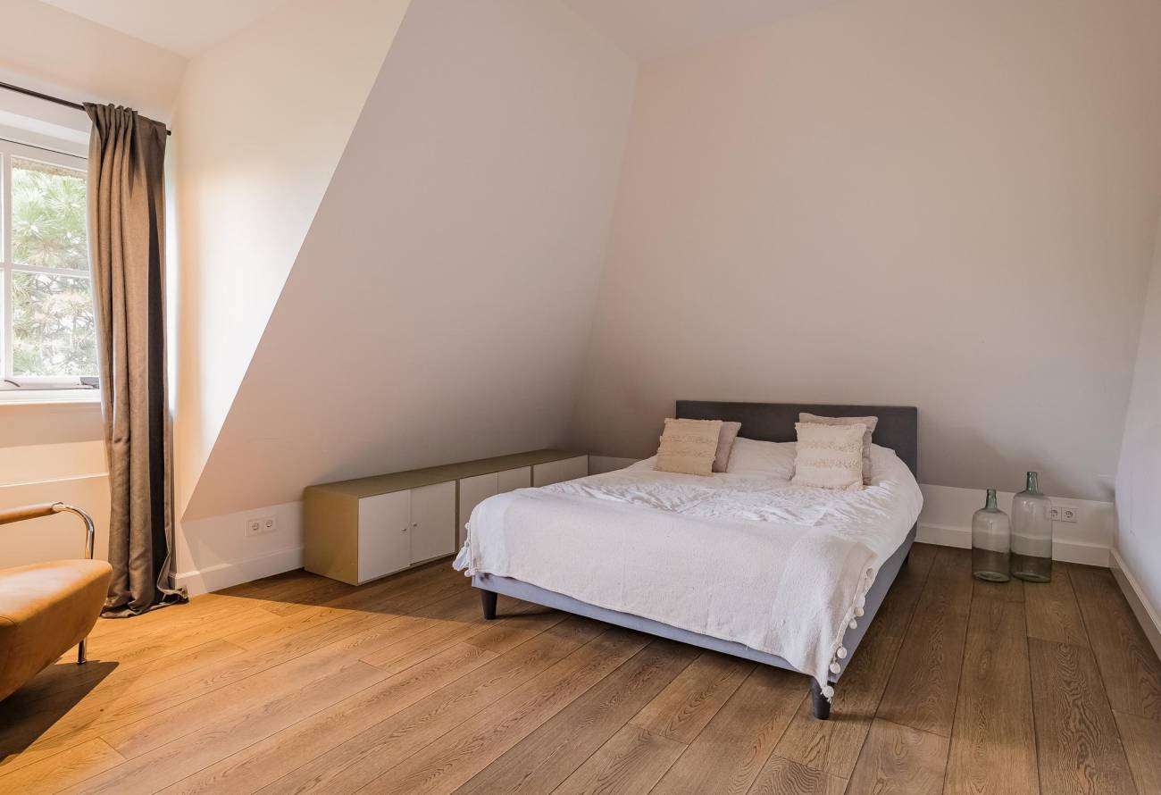 De fraaie trap brengt ons naar de ruime overloop van de 1e verdieping. Hier zijn 4 ruime slaapkamers en 2 badkamers. De grote hoofdslaapkamer heeft een geweldig uitzicht over Noordwijk. Bovendien heeft de kamer inbouwkasten en een eigen luxe badkamer met separaat toilet. Beide badkamers zijn voorzien van vloerverwarming.