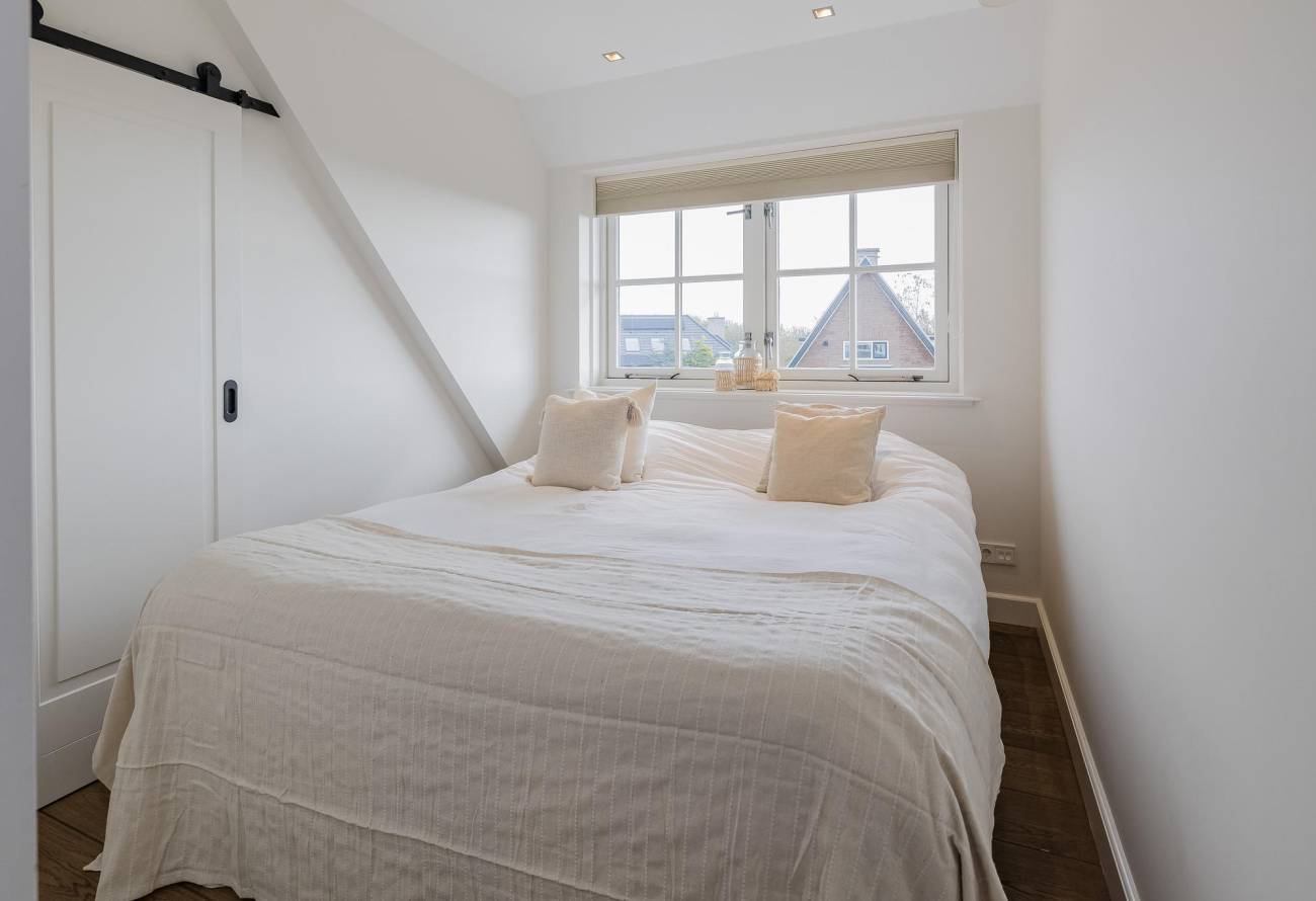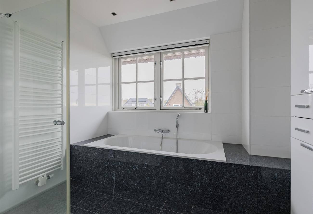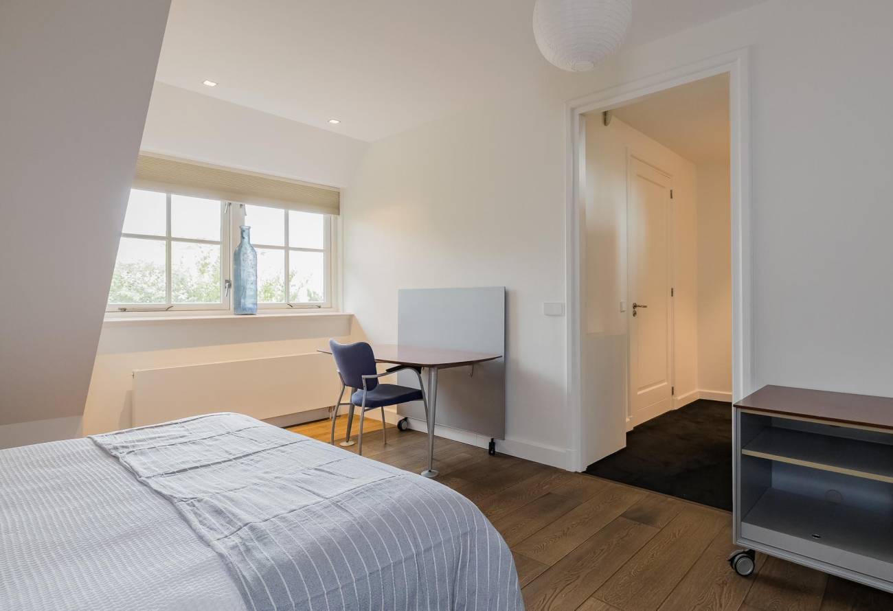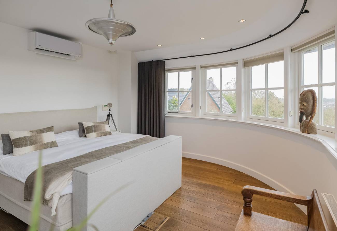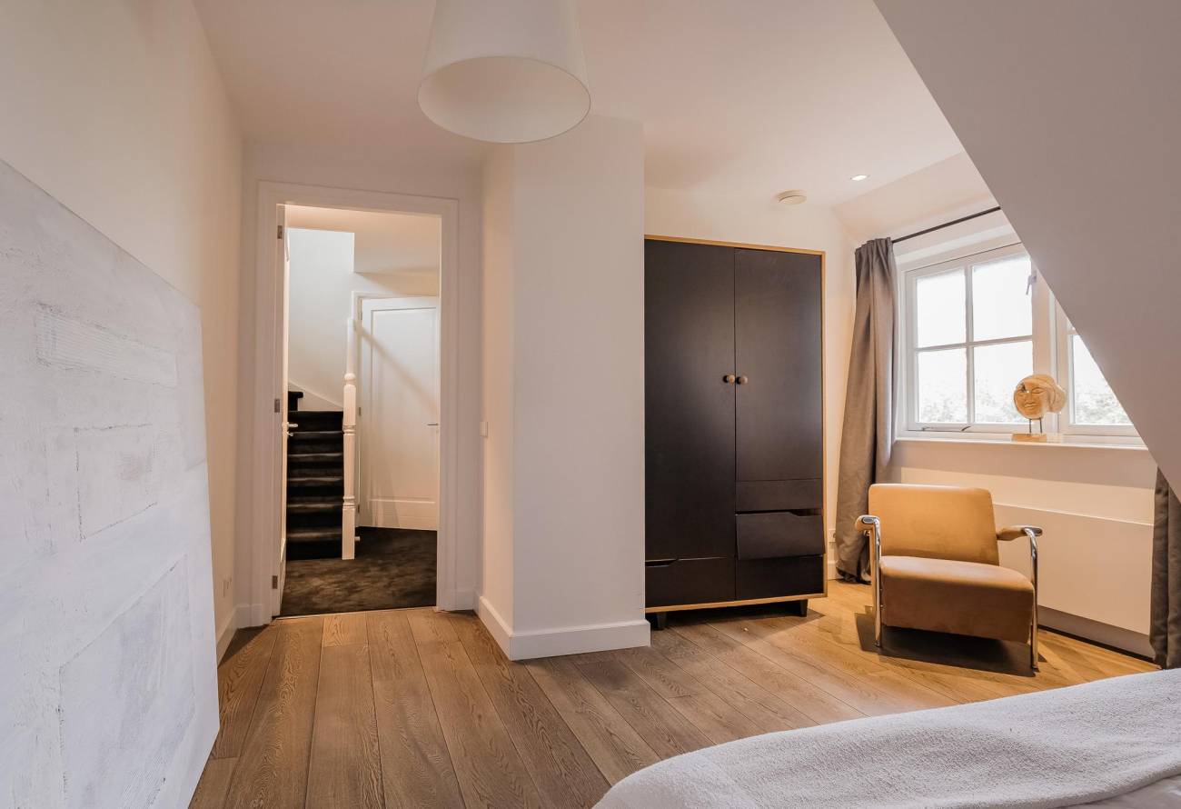De fraaie trap brengt ons naar de ruime overloop van de 1e verdieping. Hier zijn 4 ruime slaapkamers en 2 badkamers. De grote hoofdslaapkamer heeft een geweldig uitzicht over Noordwijk. Bovendien heeft de kamer inbouwkasten en een eigen luxe badkamer met separaat toilet. Beide badkamers zijn voorzien van vloerverwarming.