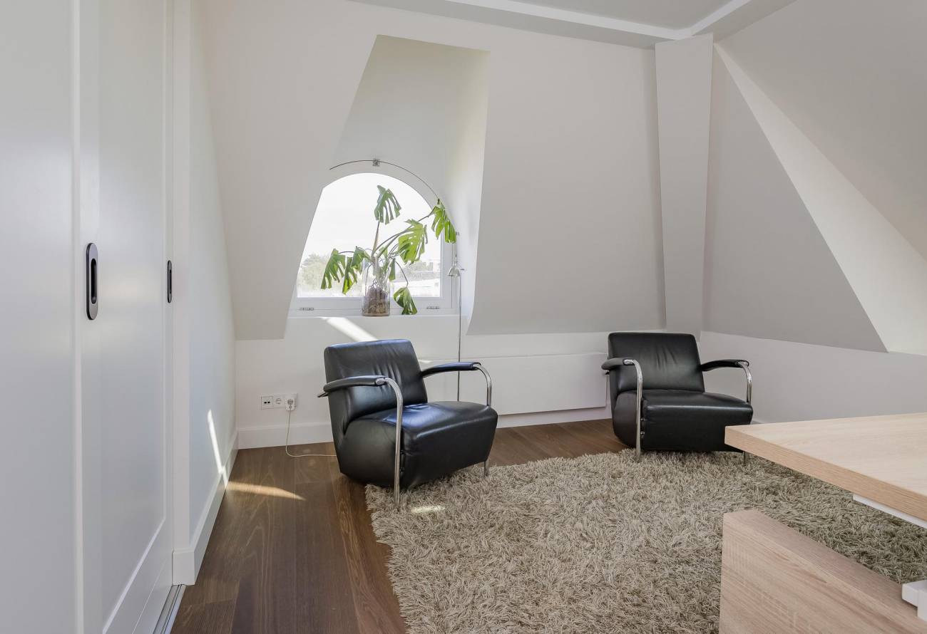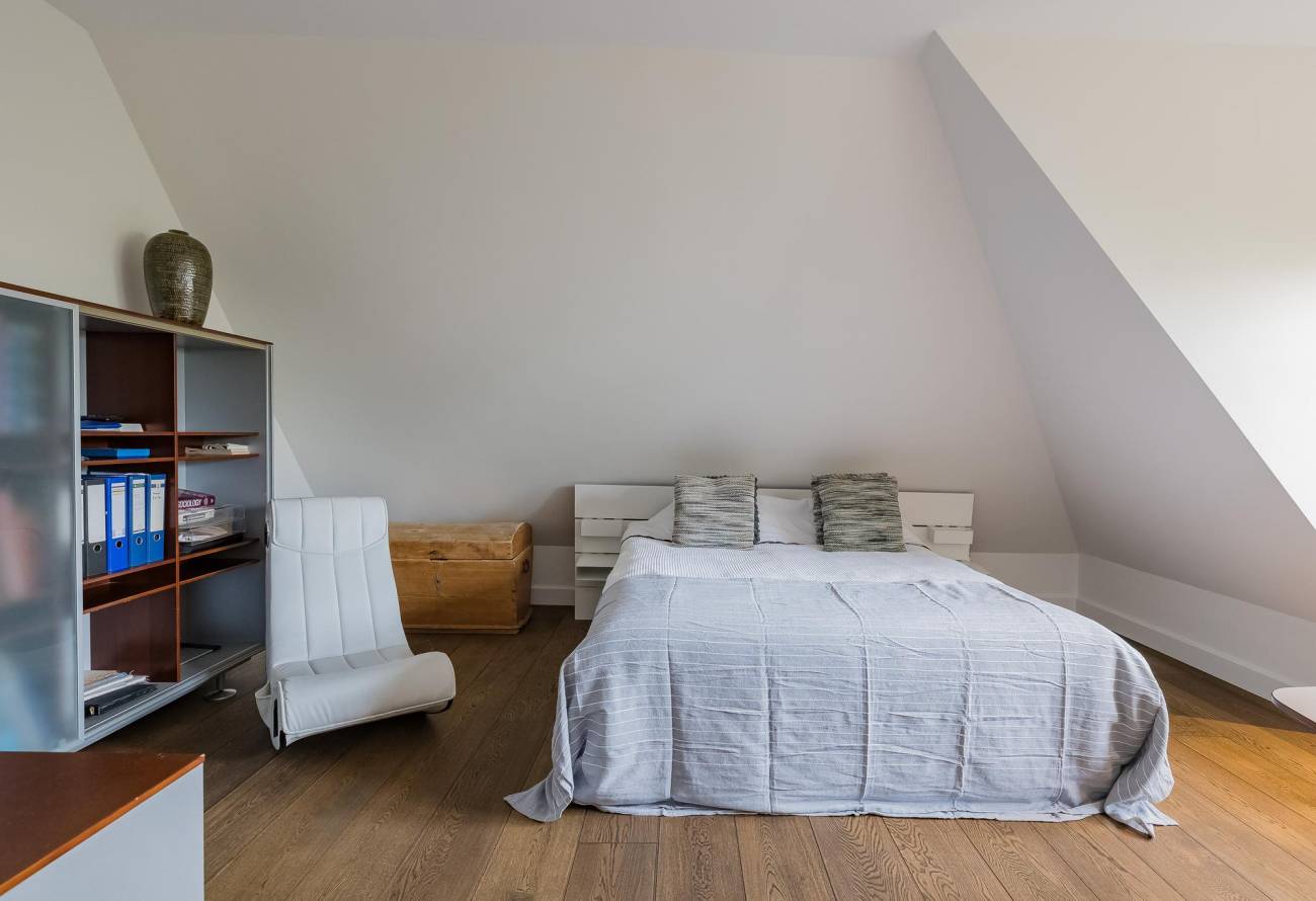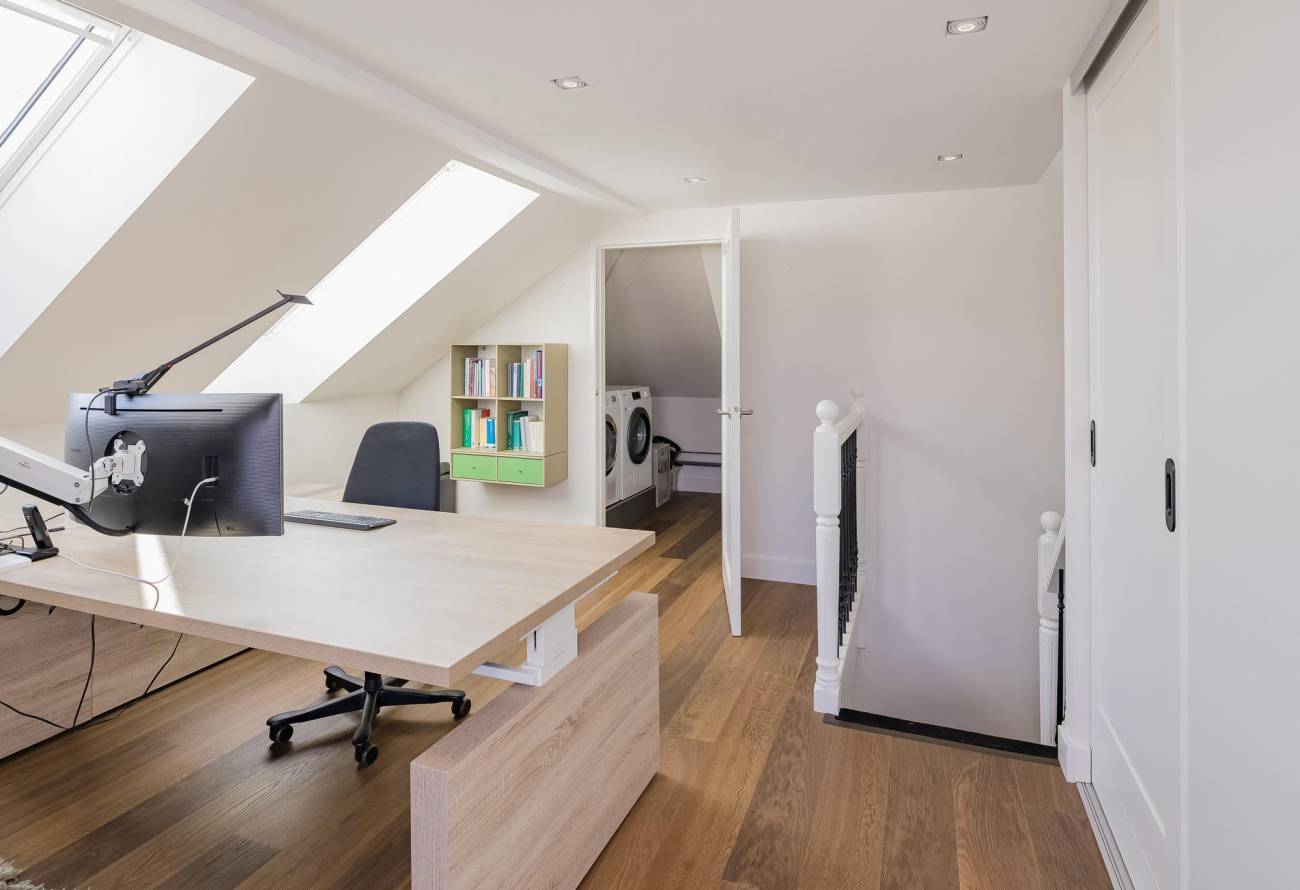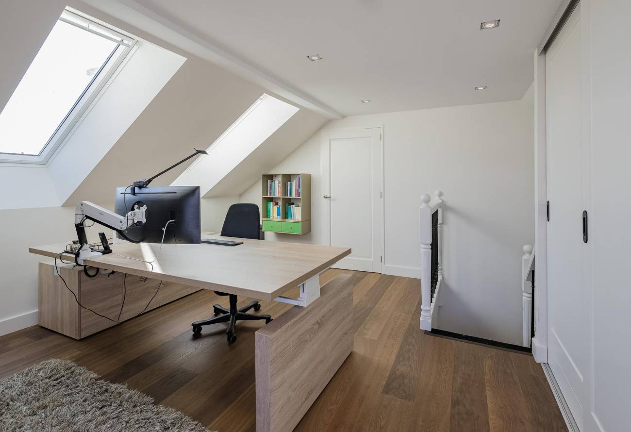 Met een vaste trap komen we op de 2e verdieping waar een grote werkkamer met kastenwand is gerealiseerd en vanwaar er uitzicht is op zee.