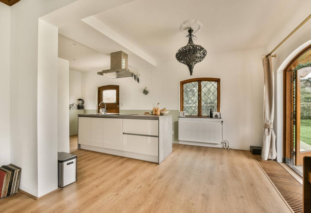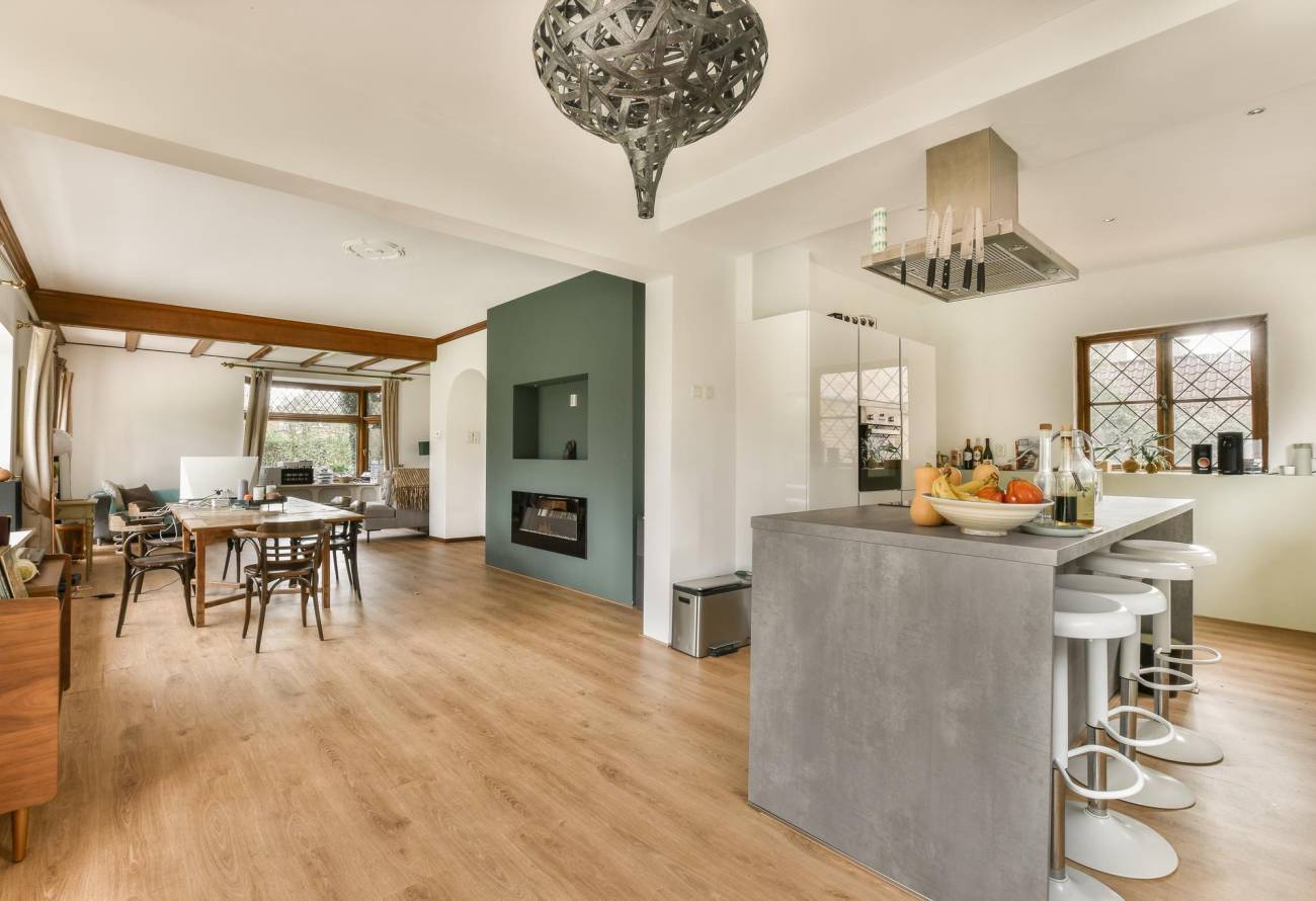 De woonkamer met erker heeft een lichte vloer, een gashaard fraai verwerkt in de muur en een nieuwe open keuken en deuren naar terras en tuin.