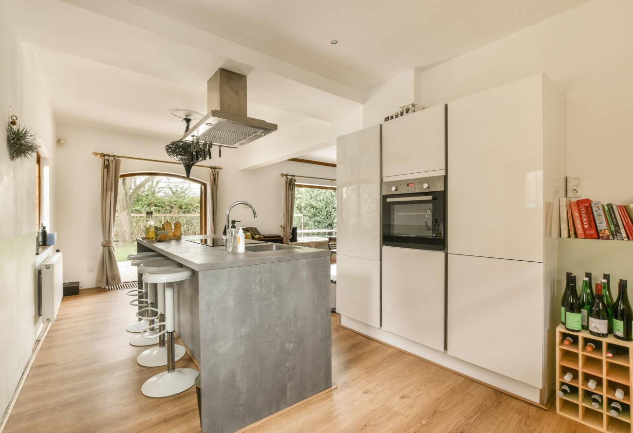 De nieuwe open keuken in ijsgrijs is voorzien van een kookeiland met afzuigschouw en fraaie hoogglans witte fronten met inbouwapparatuur.