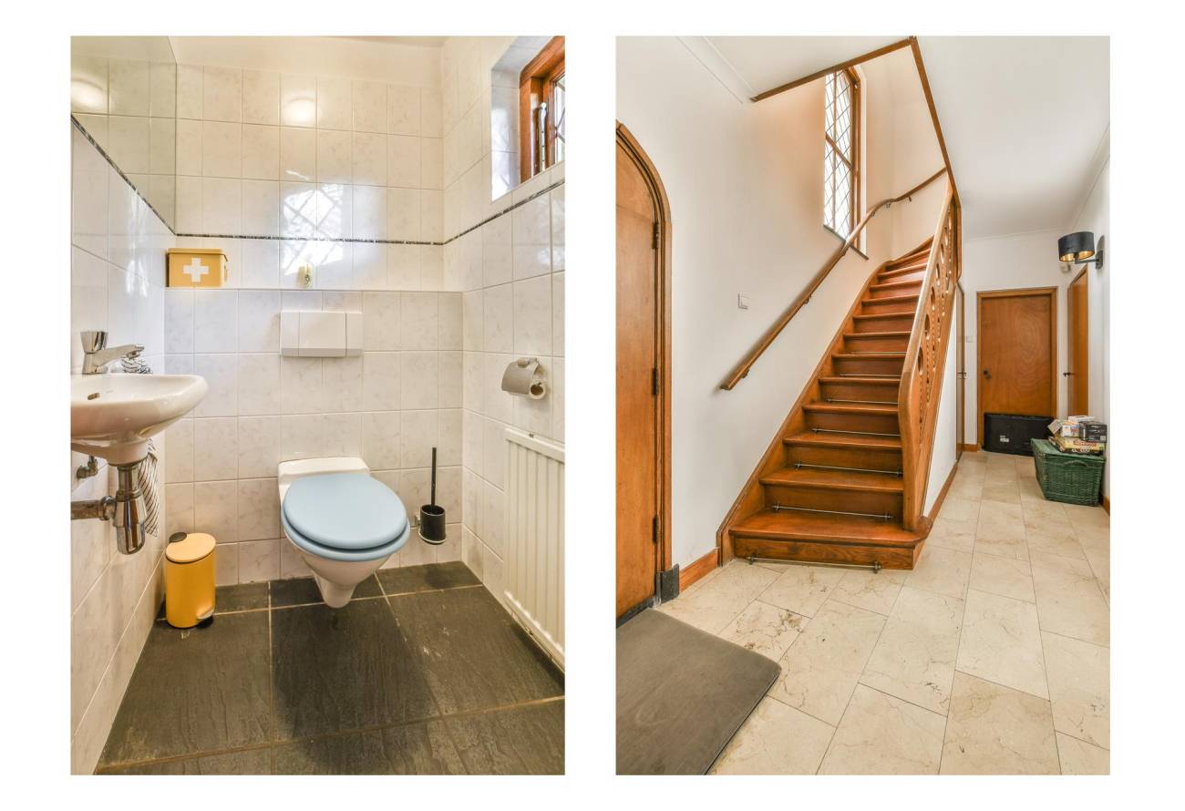 Aan de zijkant van de garage is de overdekte trap naar het onderliggende grote souterrain. Het biedt volop mogelijkheden voor bijvoorbeeld een fitnessruimte, werkplaats,