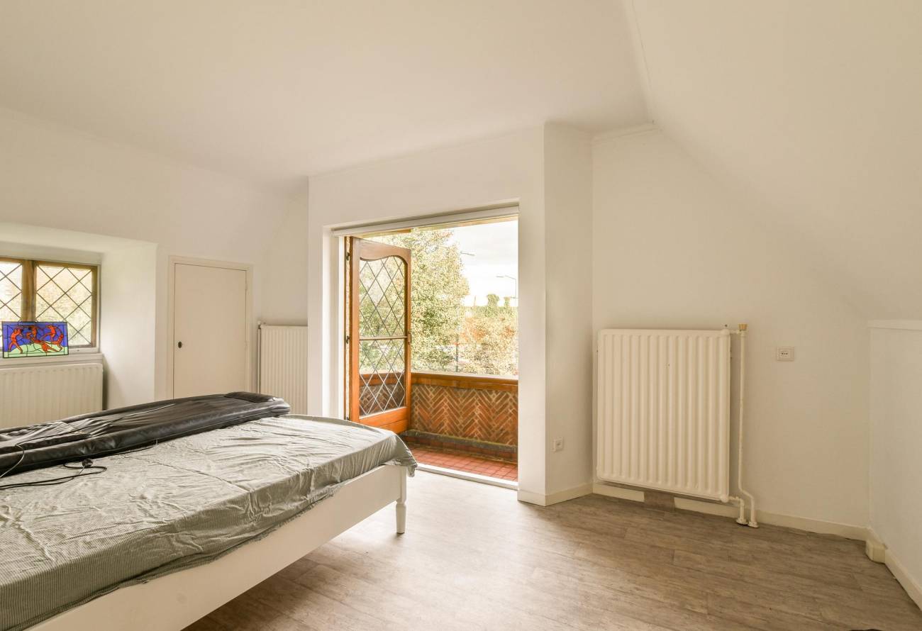 Via eiken trap naar de overloop met vide, hoofdslaapkamer aan de achterzijde met balkon en inbouwkasten. Een 2e kleine kamer met dakkapel en inbouwkast.