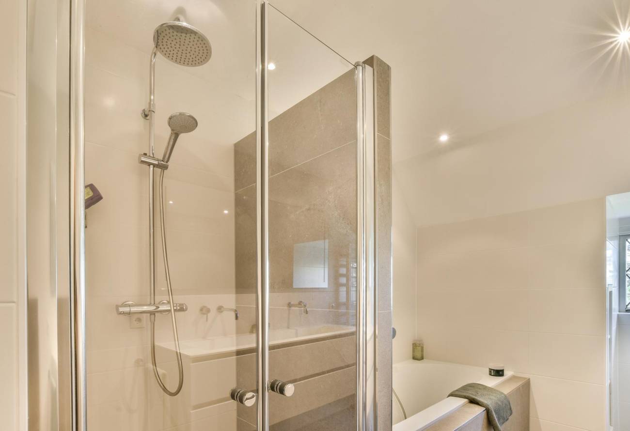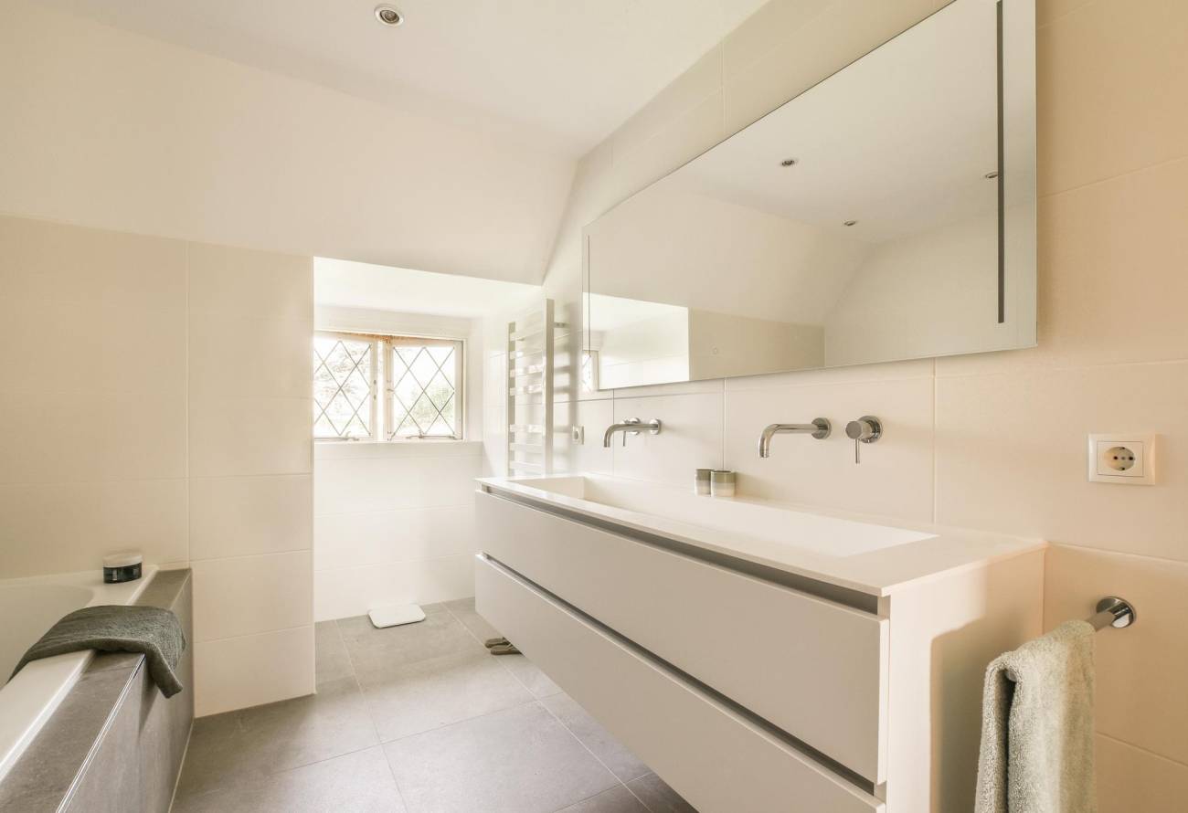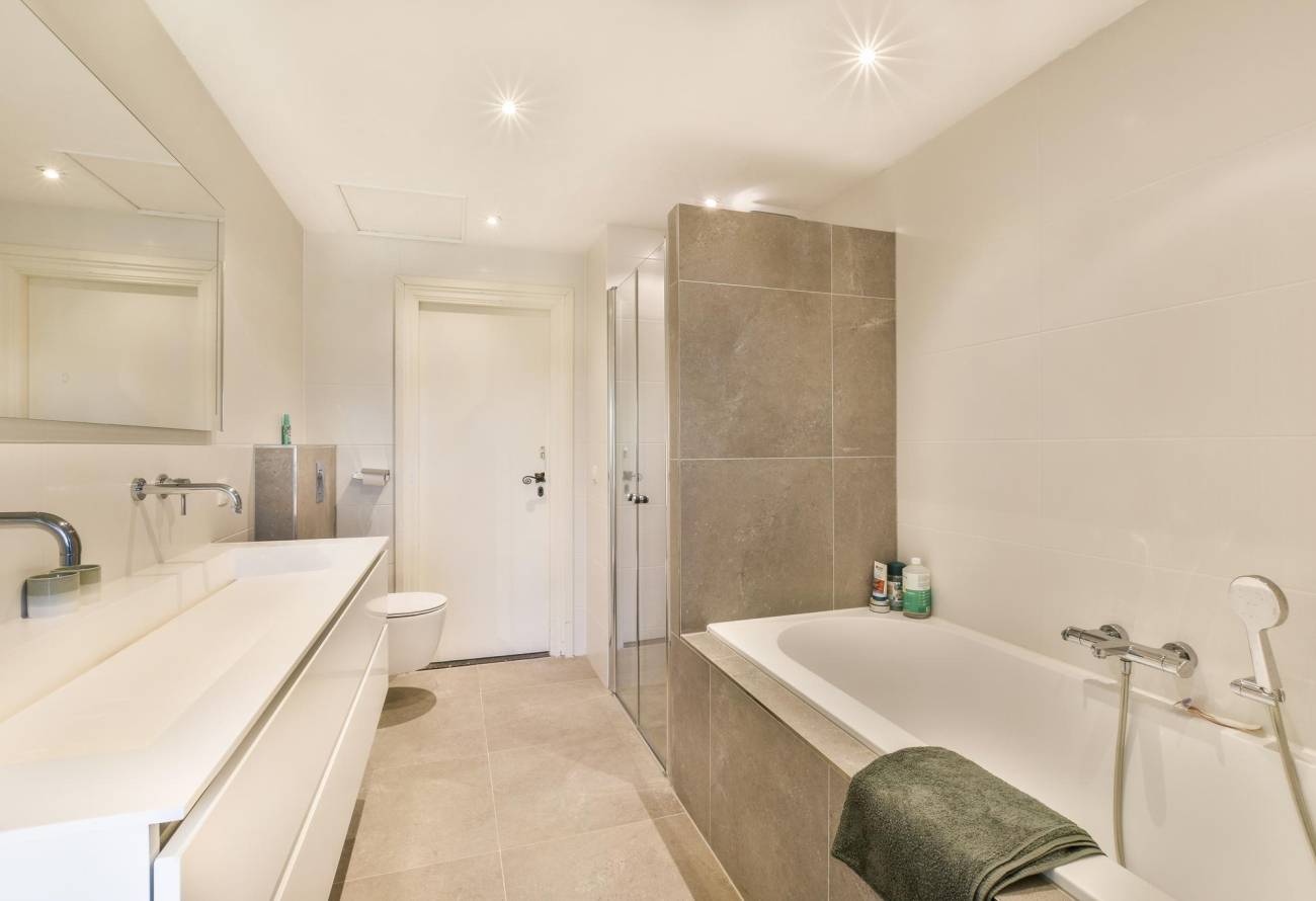 De geheel in 2022 vernieuwde moderne badkamer zit tussen de kamers en is uitgevoerd met ligbad, aparte douchecabine, een wastafelmeubel en een 2e toilet.