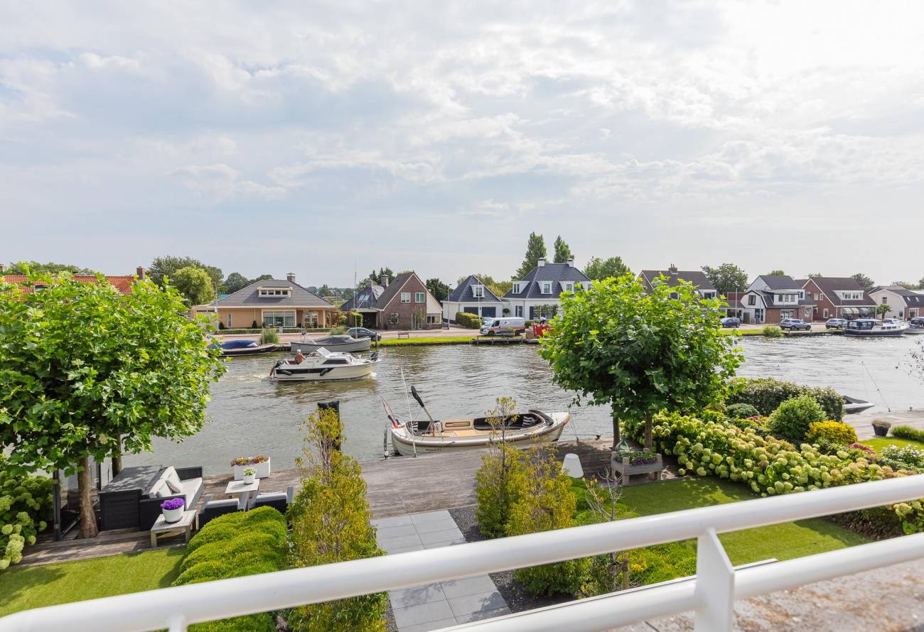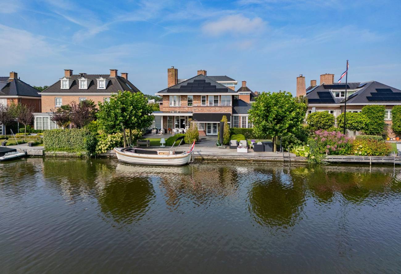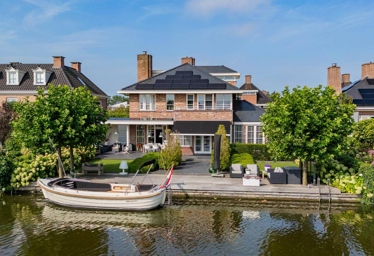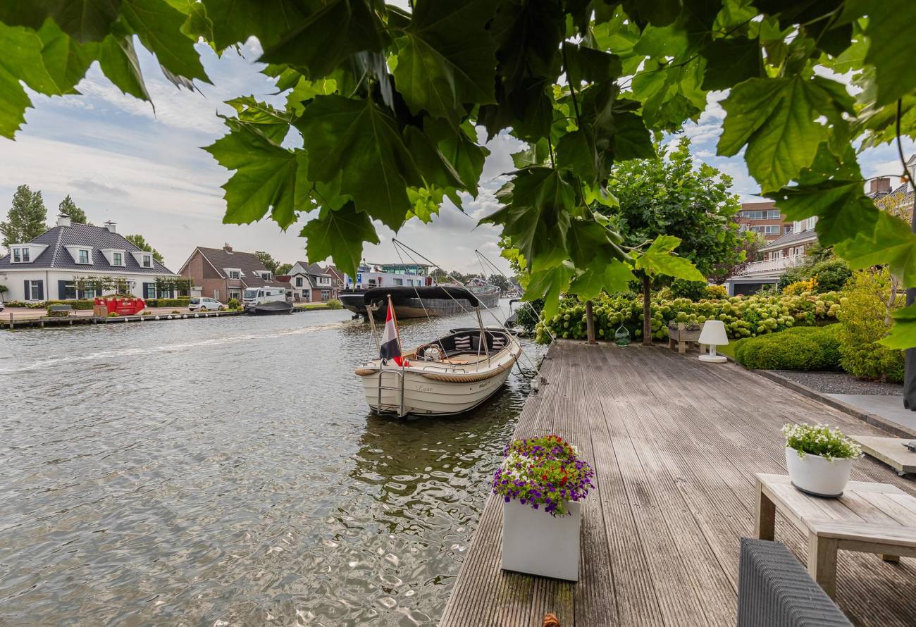 Aan de achterzijde is een luxe veranda aangebouwd met verwarming en sfeervolle verlichting. Van hieruit kijk je over het water van de Ringvaart.