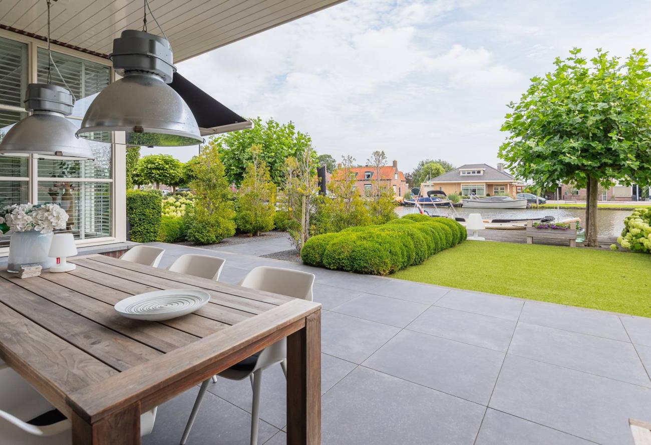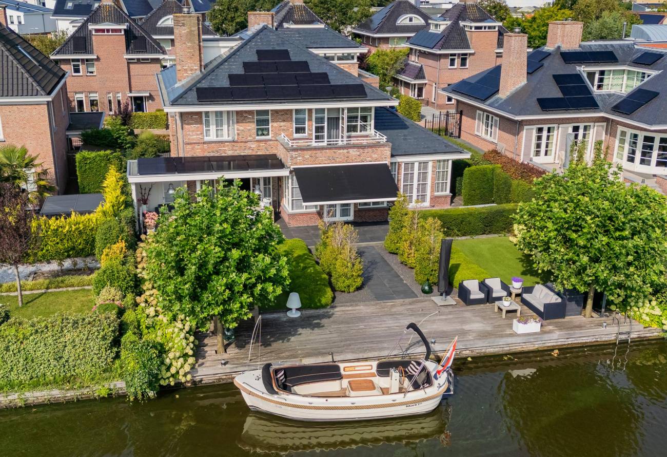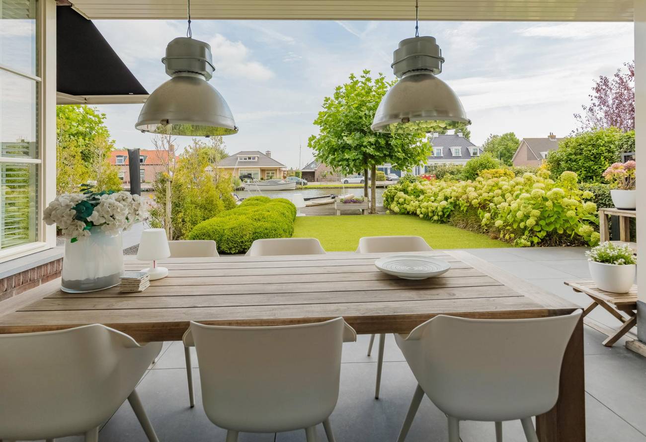 Aan de achterzijde is een luxe veranda aangebouwd met verwarming en sfeervolle verlichting. Van hieruit kijk je over het water van de Ringvaart.