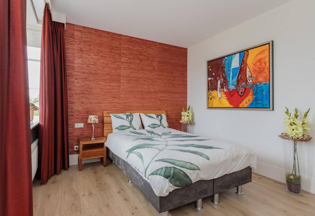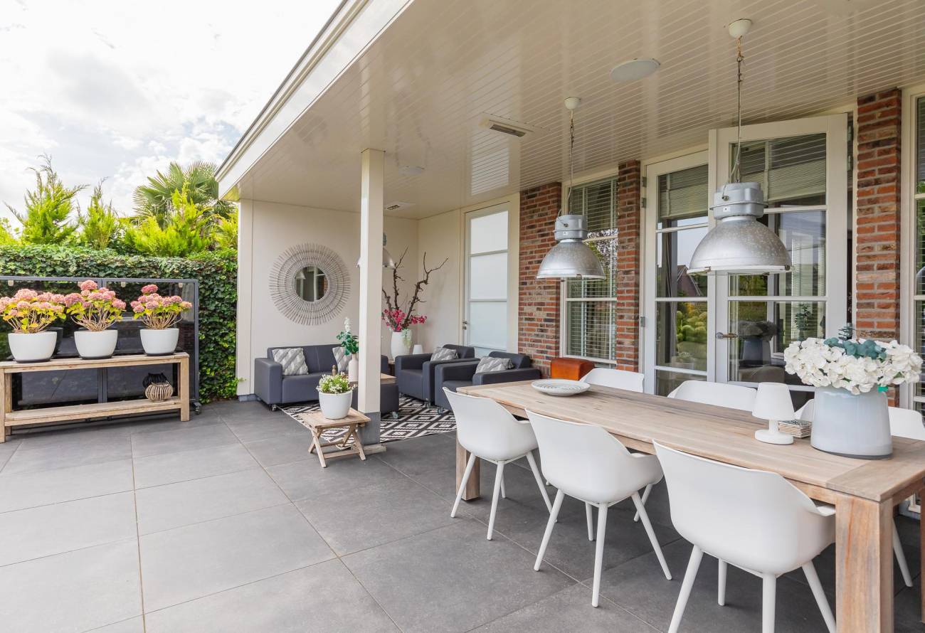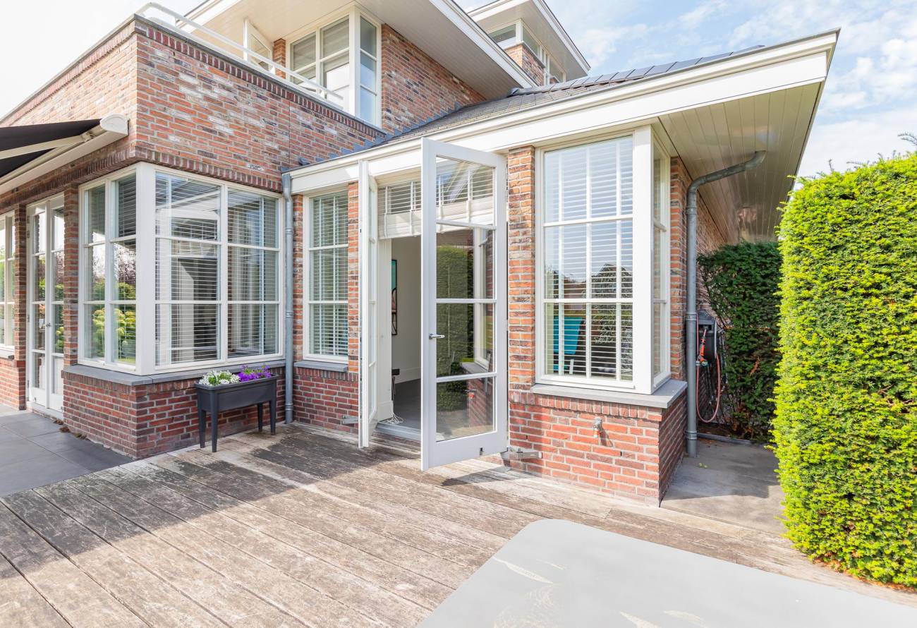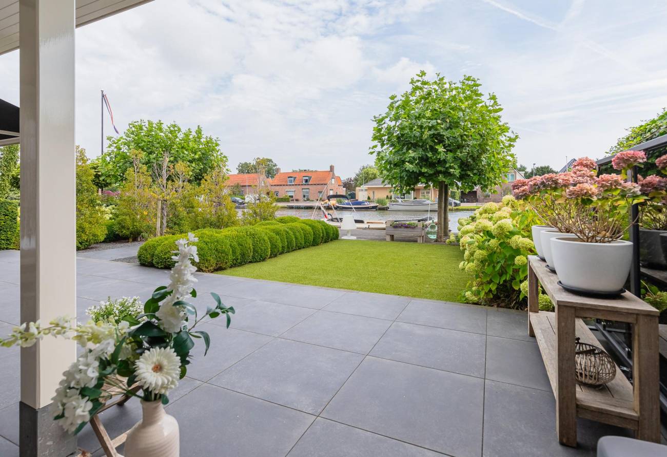 Aan de achterzijde is een luxe veranda aangebouwd met verwarming en sfeervolle verlichting. Van hieruit kijk je over het water van de Ringvaart.
