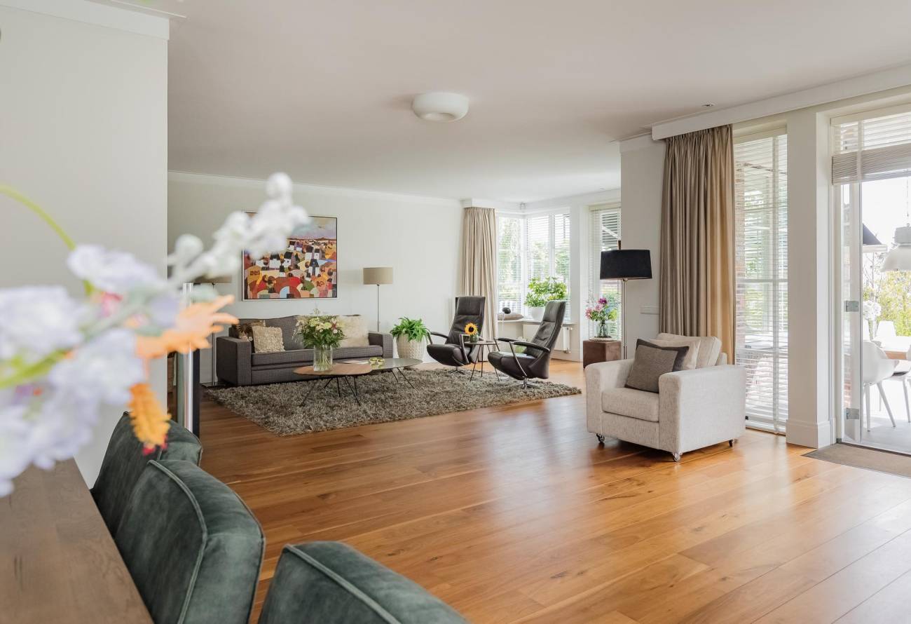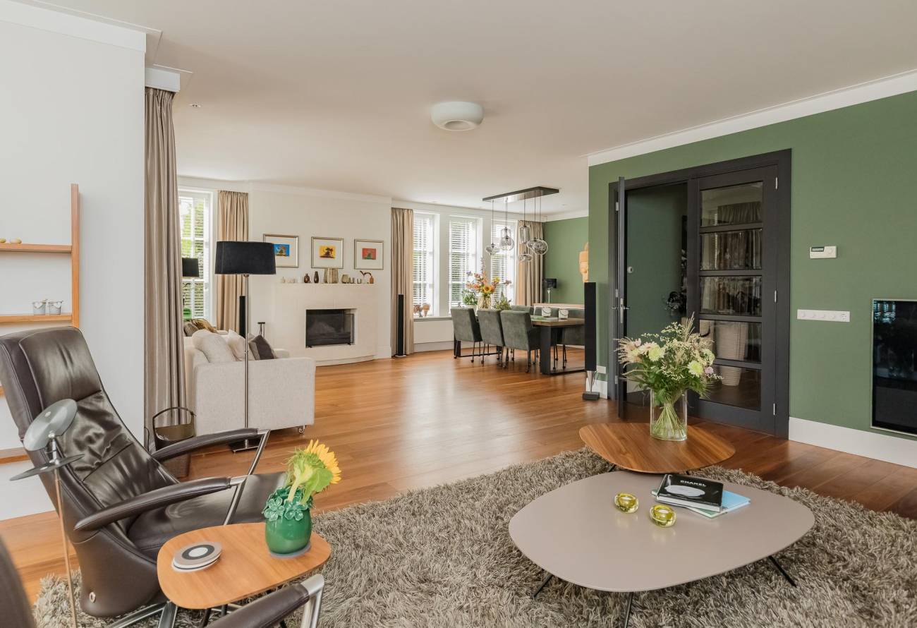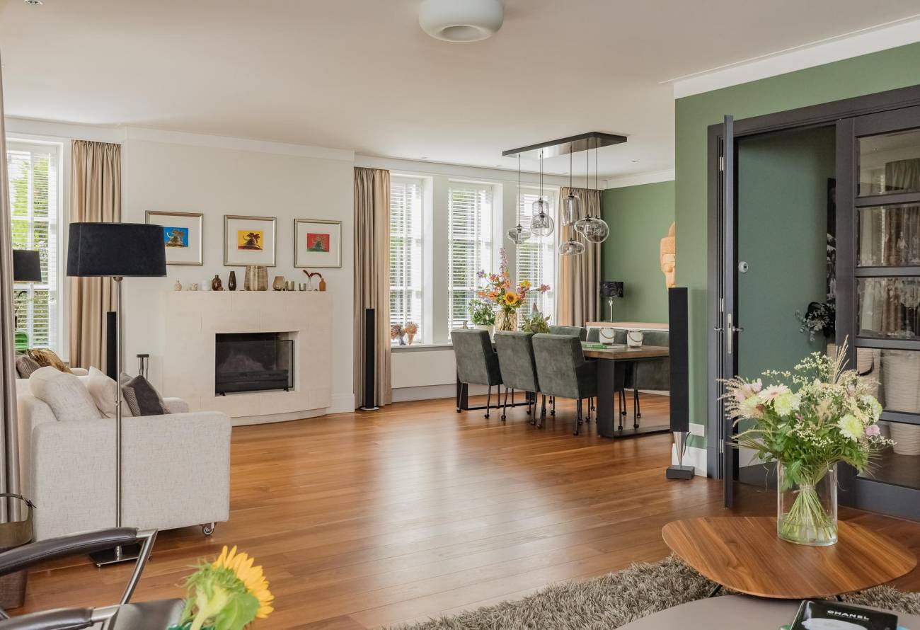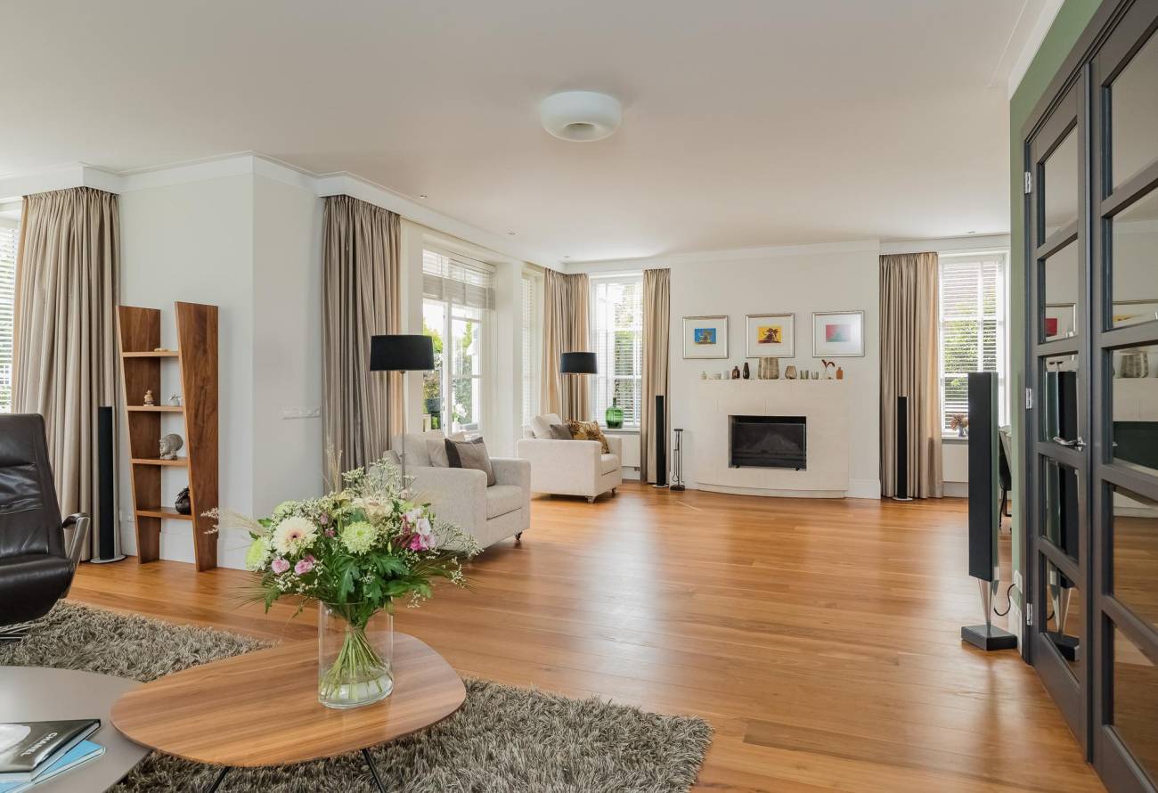 Aan de voorzijde is de entree naar de voordeur, er is een royale hal met garderobe, toiletruimte en een trap naar de etage. Dubbele deuren geven toegang tot de zeer royale en lichte living. Deze riante living is v.v. een fraaie parketvloer met als blikvanger een sfeervolle open haard. Verder zijn er 2 openslaande deuren naar het terras en de tuin. Er zijn meerdere zithoeken gecreëerd in deze ruime living en tevens is er plek voor een grote eettafel in de eethoek met zicht op de achtertuin en het water.