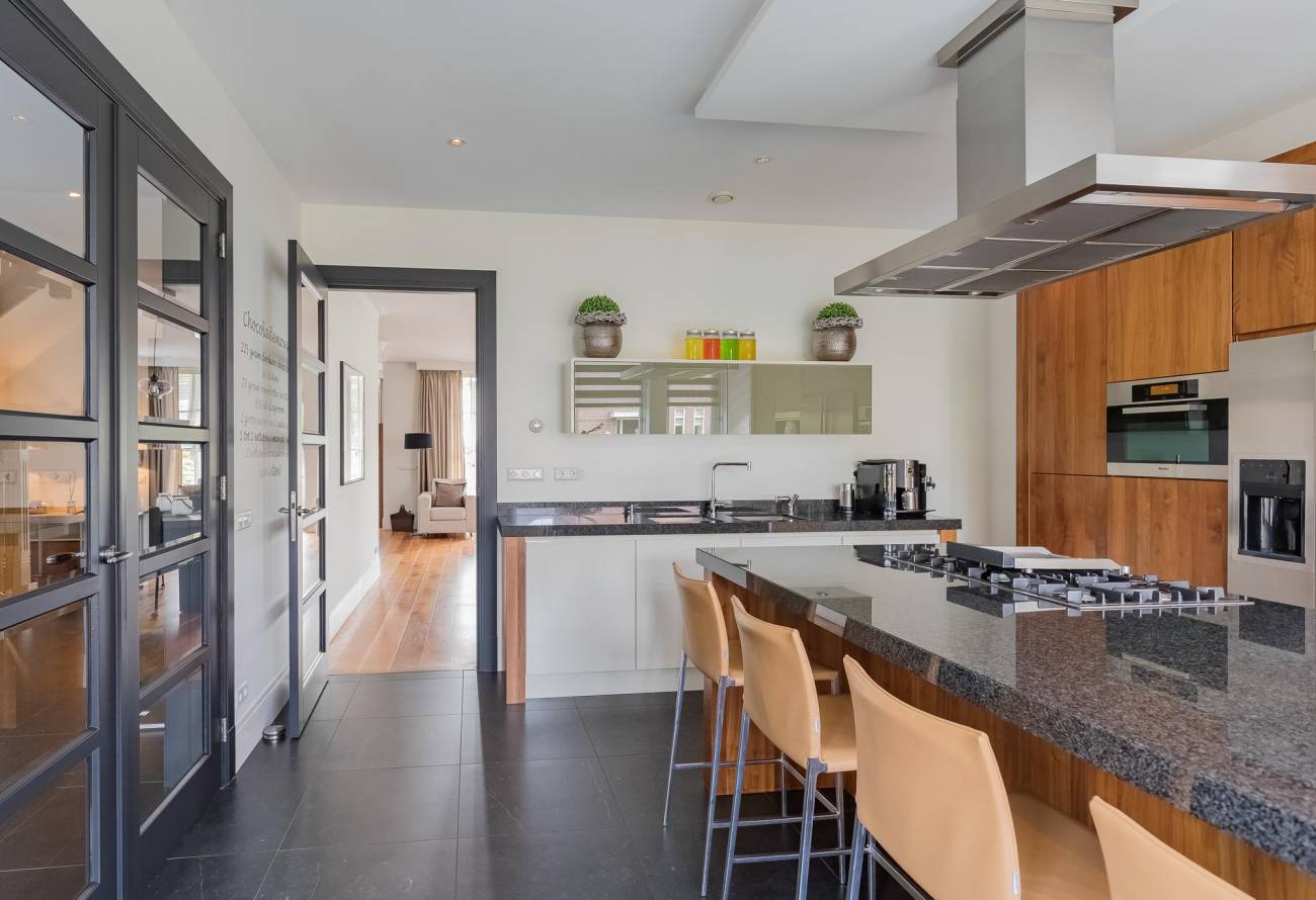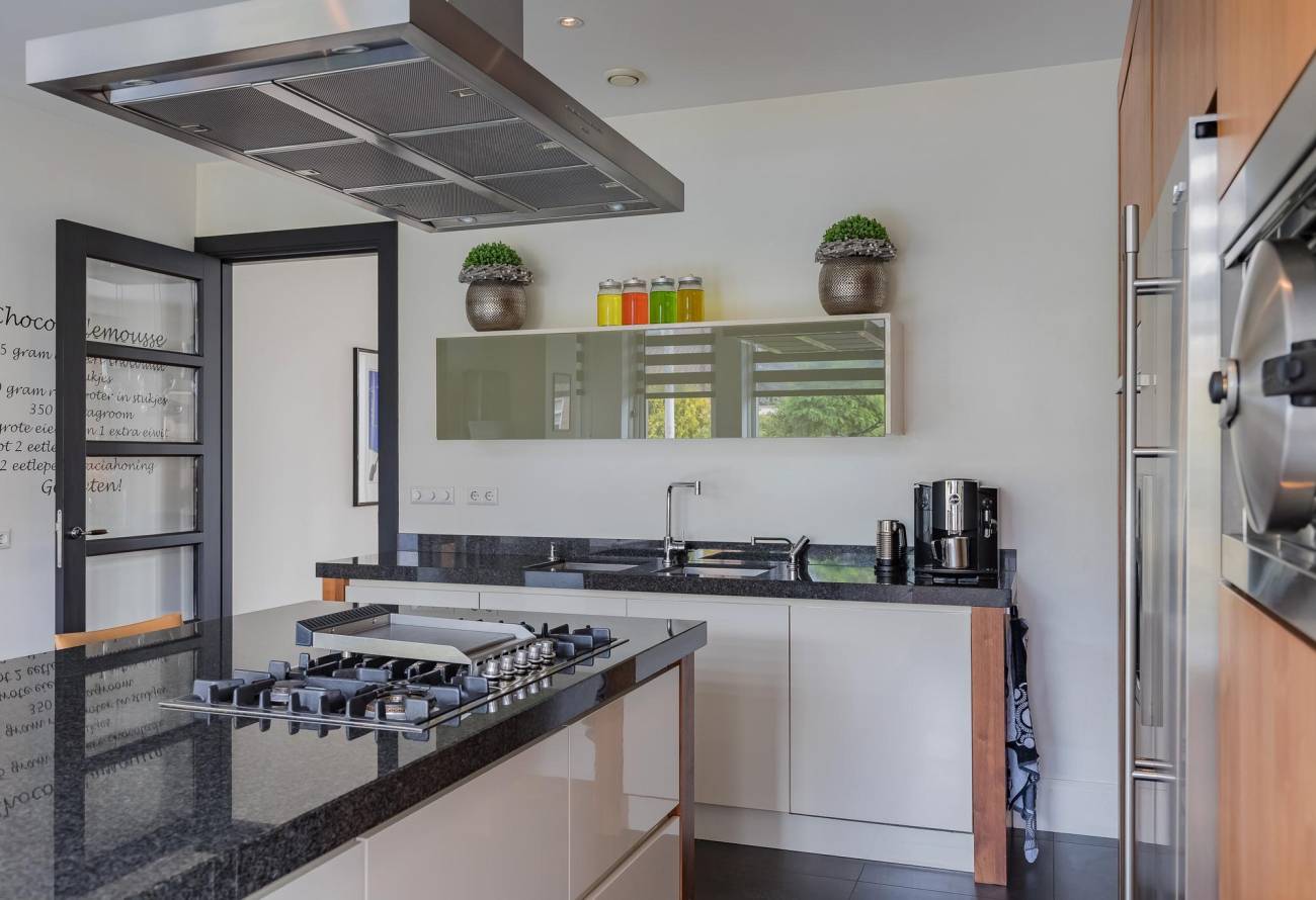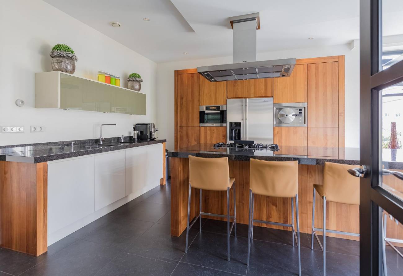 De moderne keuken, die is voorzien van luxe apparatuur, is bereikbaar vanuit de hal en vanuit de woon/eetkamer. Extra smaakvol is de afwerking van deze keuken met kookeiland in dezelfde kleurtinten als de vloer in de living. Er is ook nog een handige bijkeuken, ideaal voor een extra vriezer en voorraad.