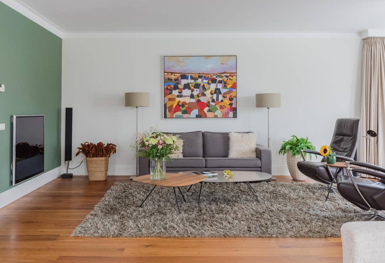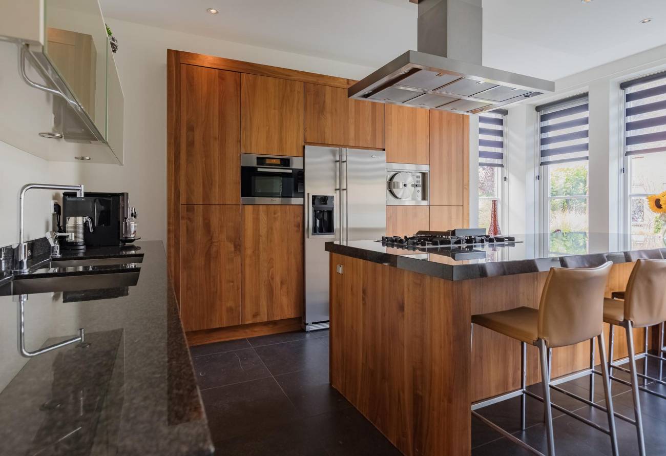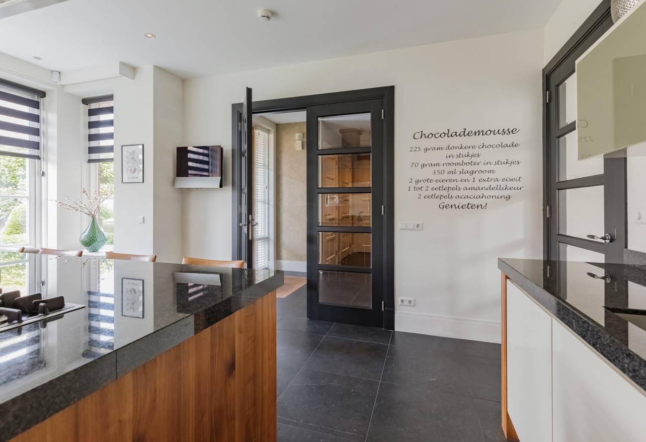 De moderne keuken, die is voorzien van luxe apparatuur, is bereikbaar vanuit de hal en vanuit de woon/eetkamer. Extra smaakvol is de afwerking van deze keuken met kookeiland in dezelfde kleurtinten als de vloer in de living. Er is ook nog een handige bijkeuken, ideaal voor een extra vriezer en voorraad.