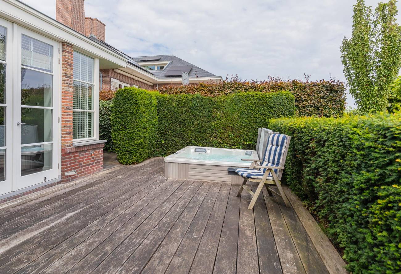 Op het terras is een ingebouwde Jacuzzi en een zonnescherm. De onder architectuur aangelegde tuin heeft veel privacy en is zeer royaal met meerdere terrassen en een ligging aan doorgaand vaarwater.